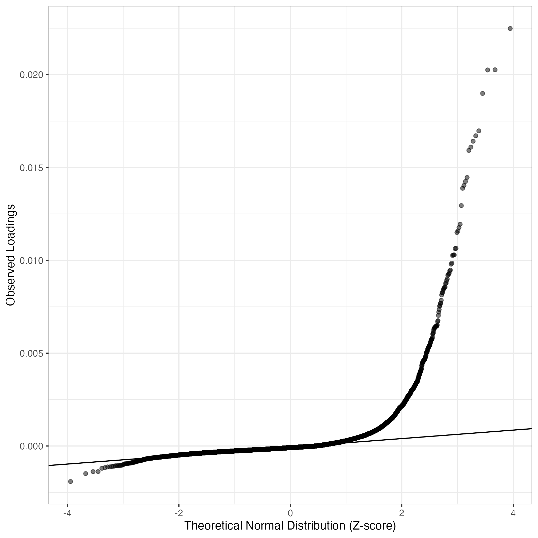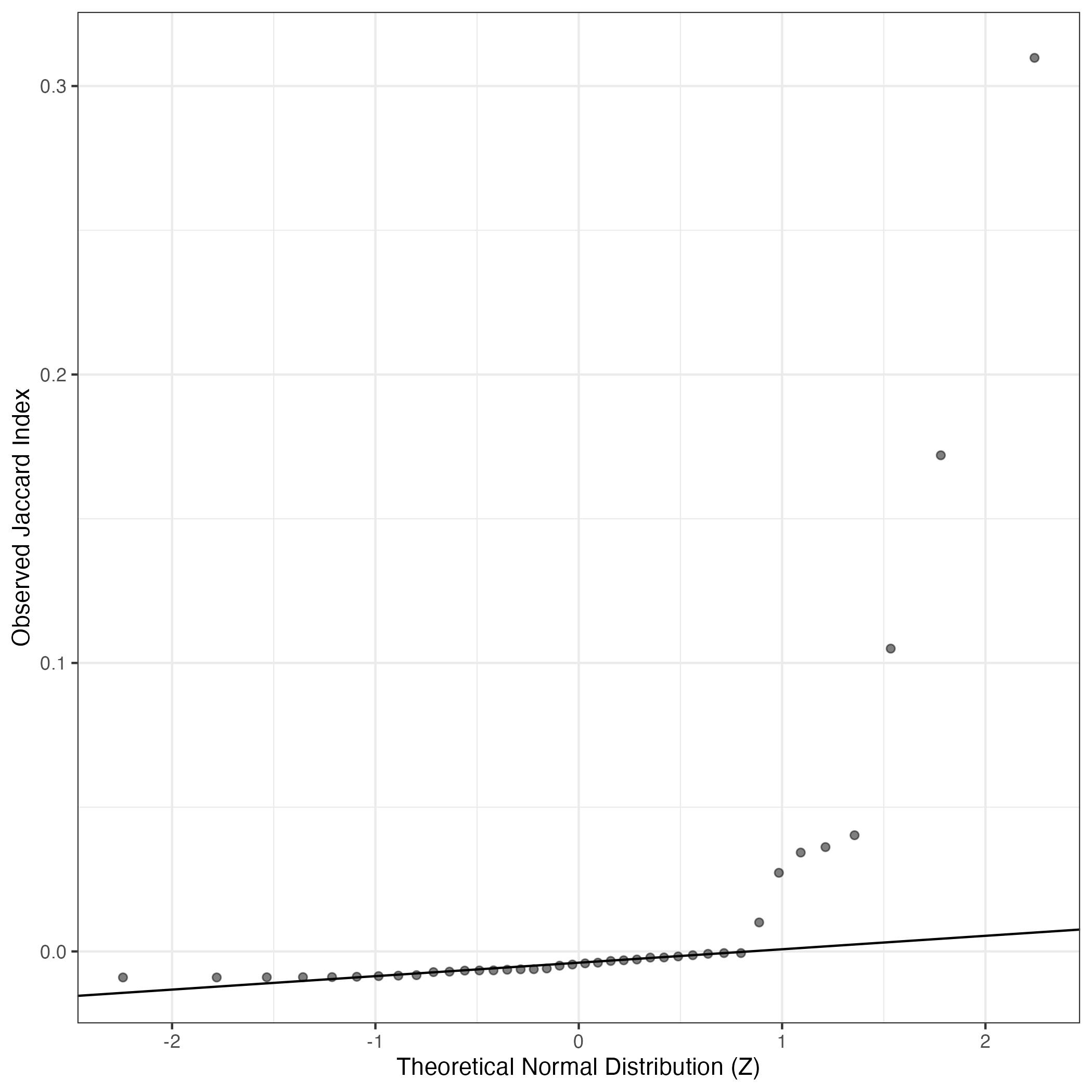 A similar QQ-plot as above, but only for instances where the H value is e.g. > 25, i.e. we are confident that the expression program is active above noise. Agreemenet between these binary vectors is tested using the Jaccard Index, with the P-values calculated by an exact test: