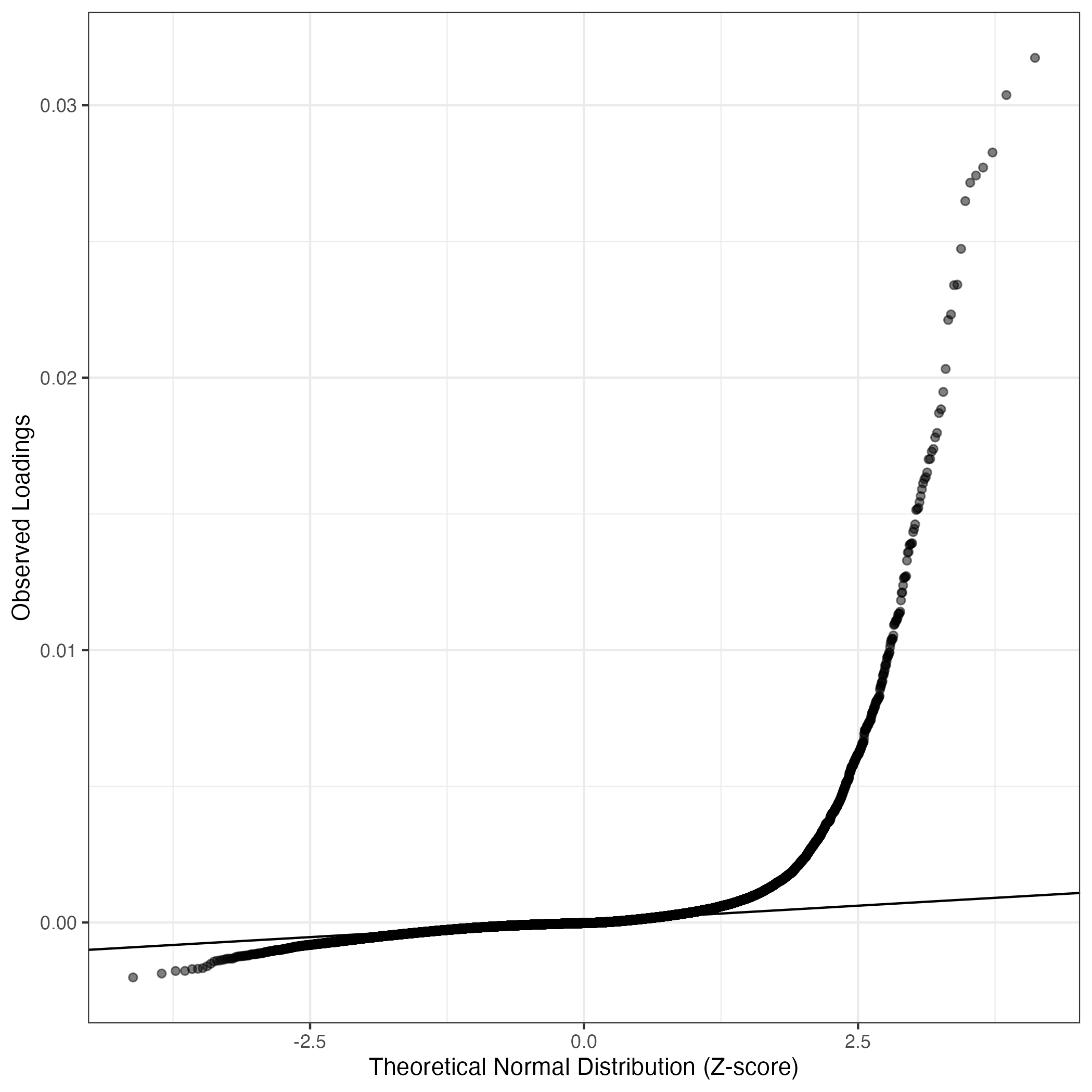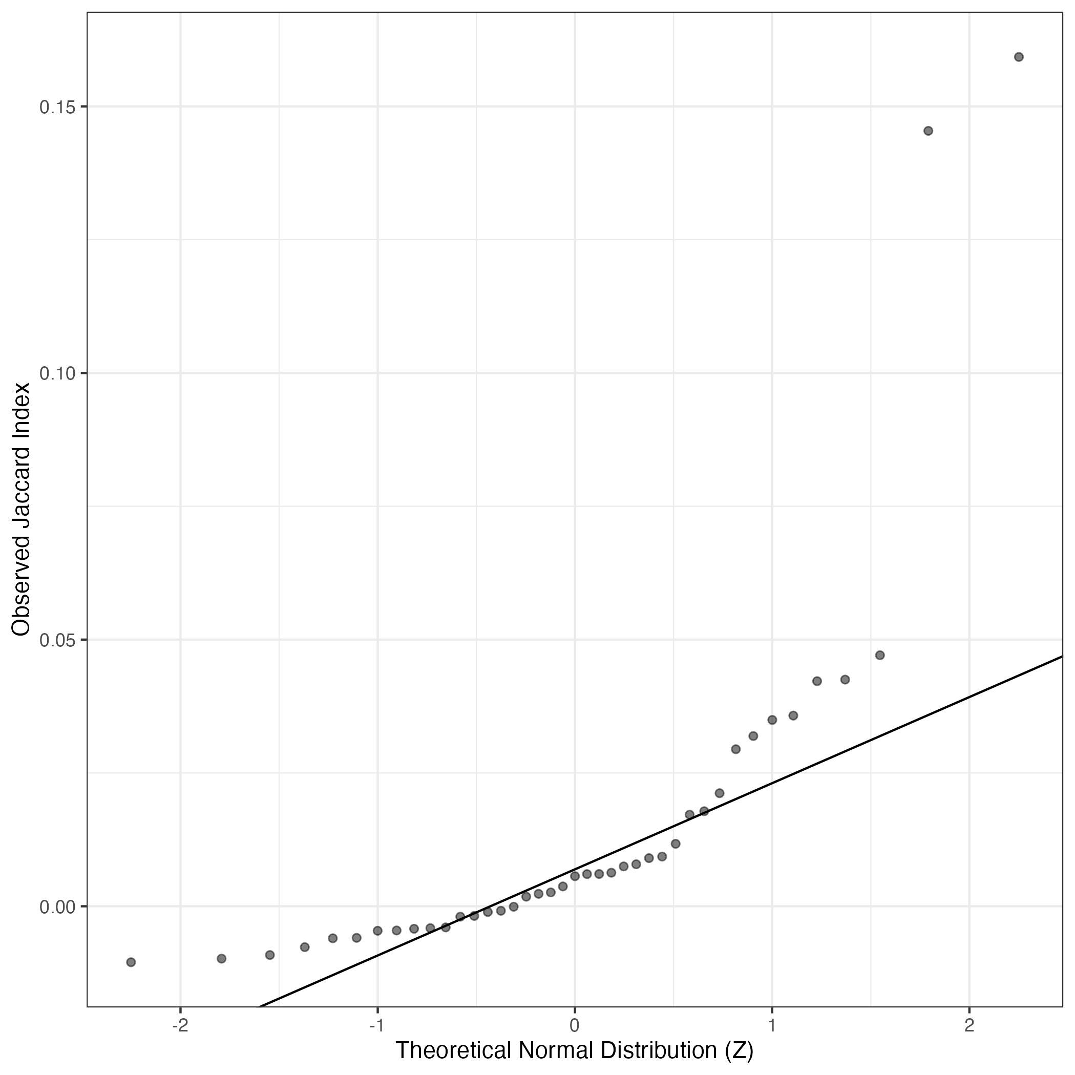 A similar QQ-plot as above, but only for instances where the H value is e.g. > 25, i.e. we are confident that the expression program is active above noise. Agreemenet between these binary vectors is tested using the Jaccard Index, with the P-values calculated by an exact test:
