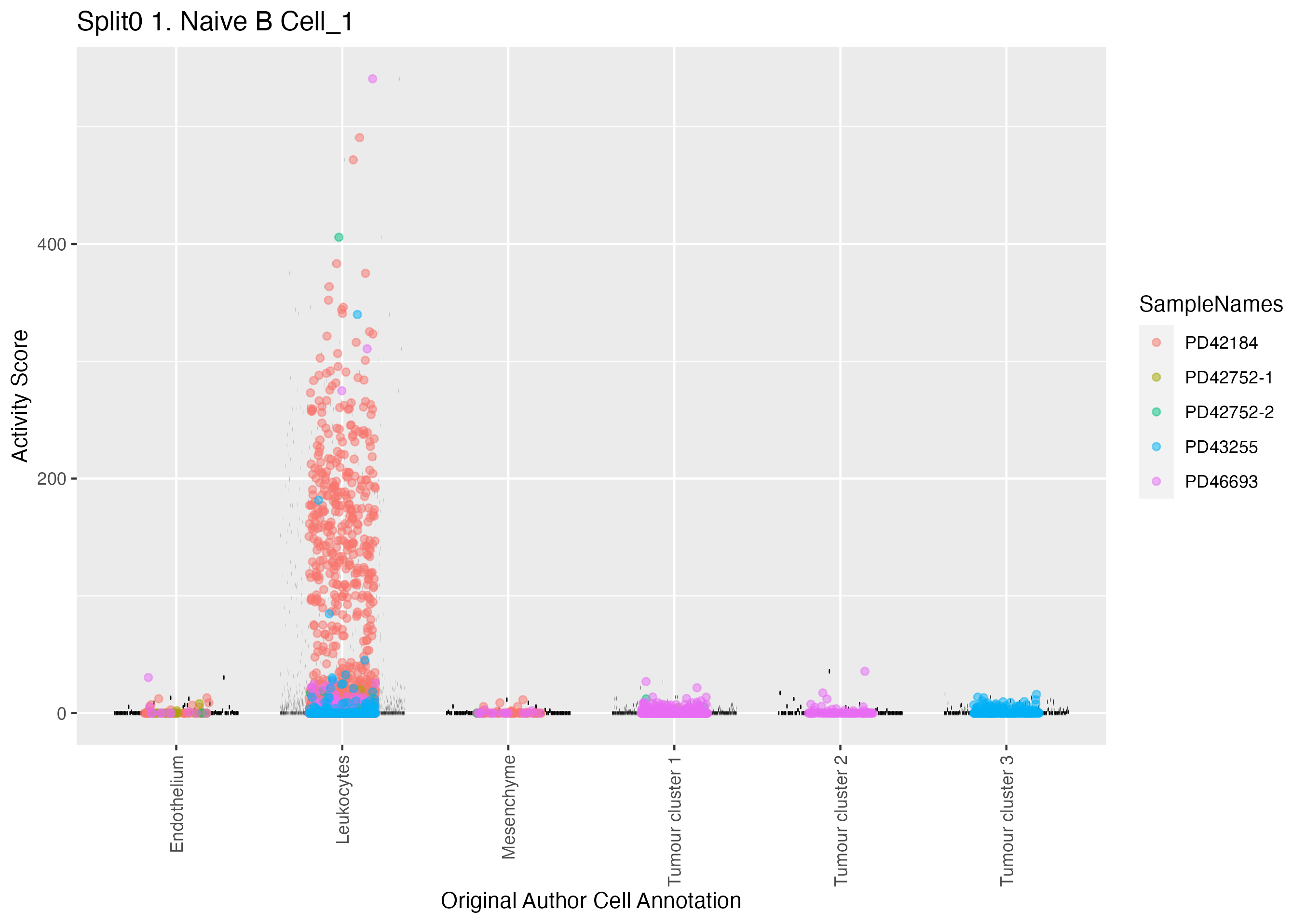 Cycling cells: Cycling B cells (curated markers) proliferating B lymphocytes: Wilcoxon ranksum test P-value for gene set overrepresentation: 7.12e-01 Mean rank of genes in gene set: 7445 Rank on gene expression program of genes in gene set: