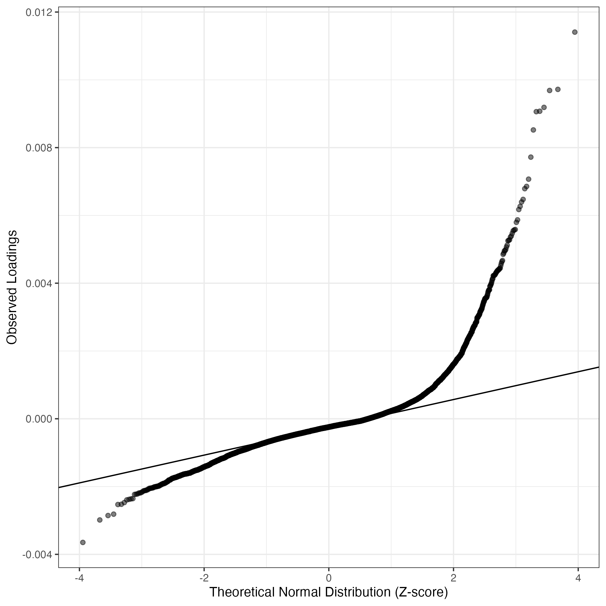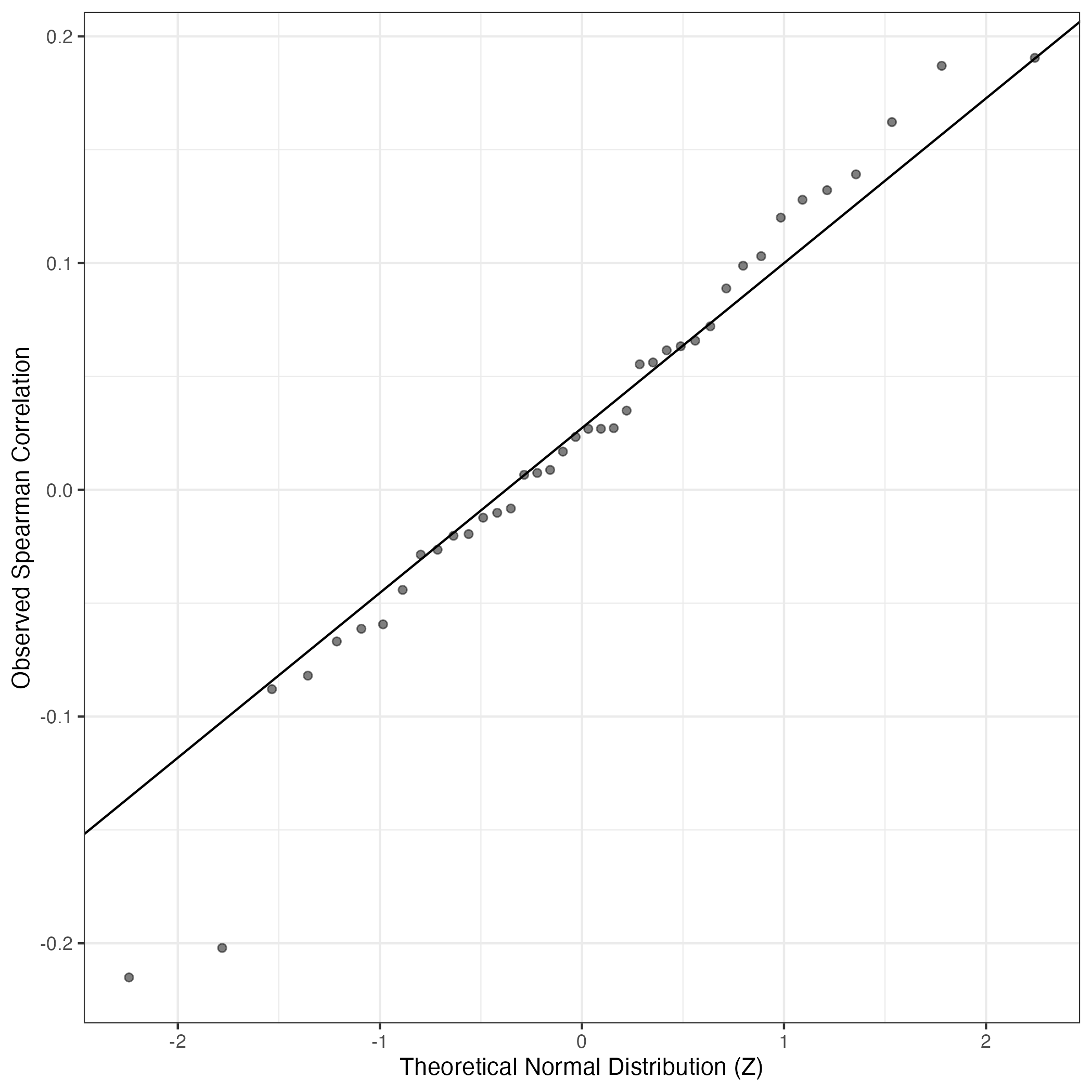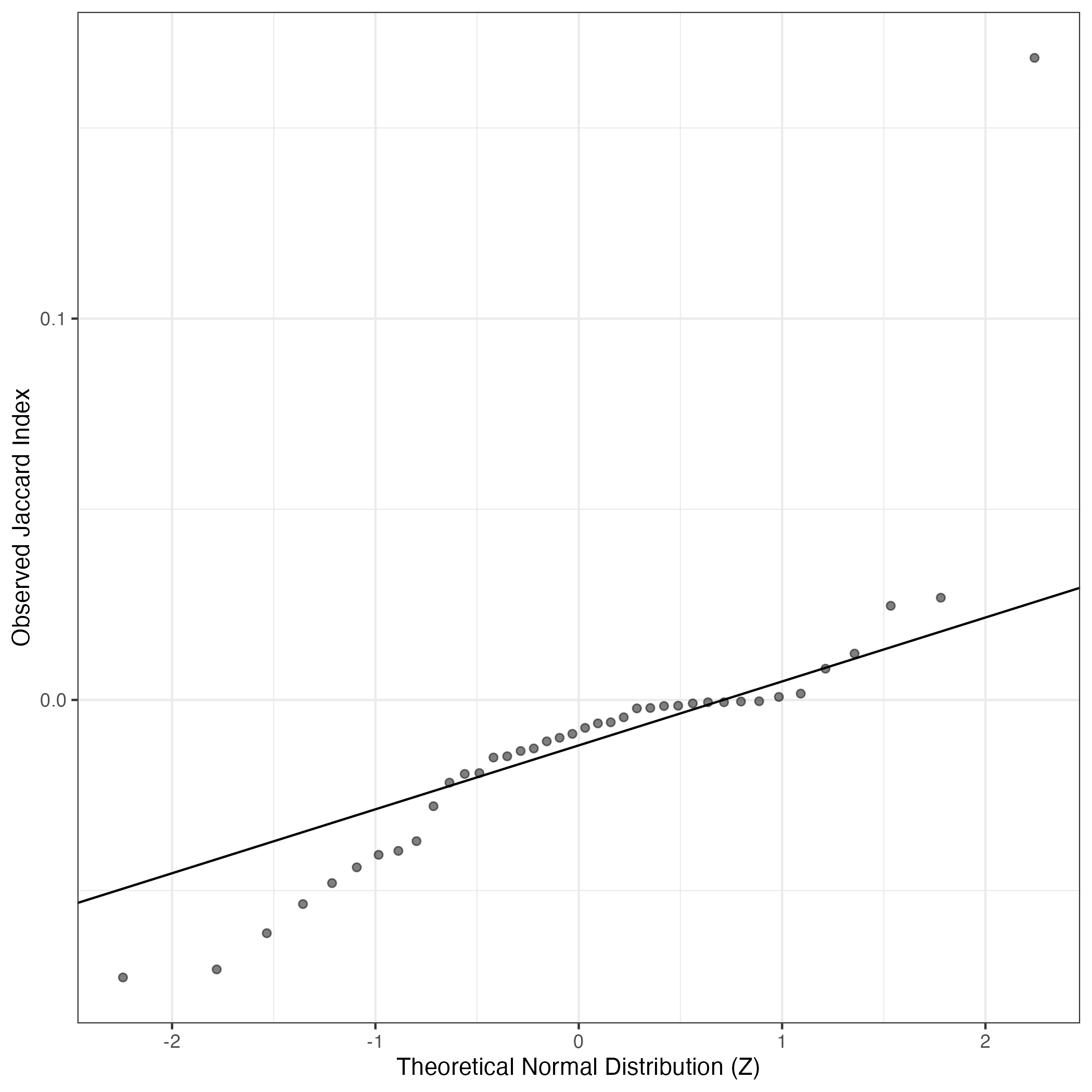A similar QQ-plot as above, but only for instances where the H value is e.g. > 25, i.e. we are confident that the expression program is active above noise. Agreemenet between these binary vectors is tested using the Jaccard Index, with the P-values calculated by an exact test: