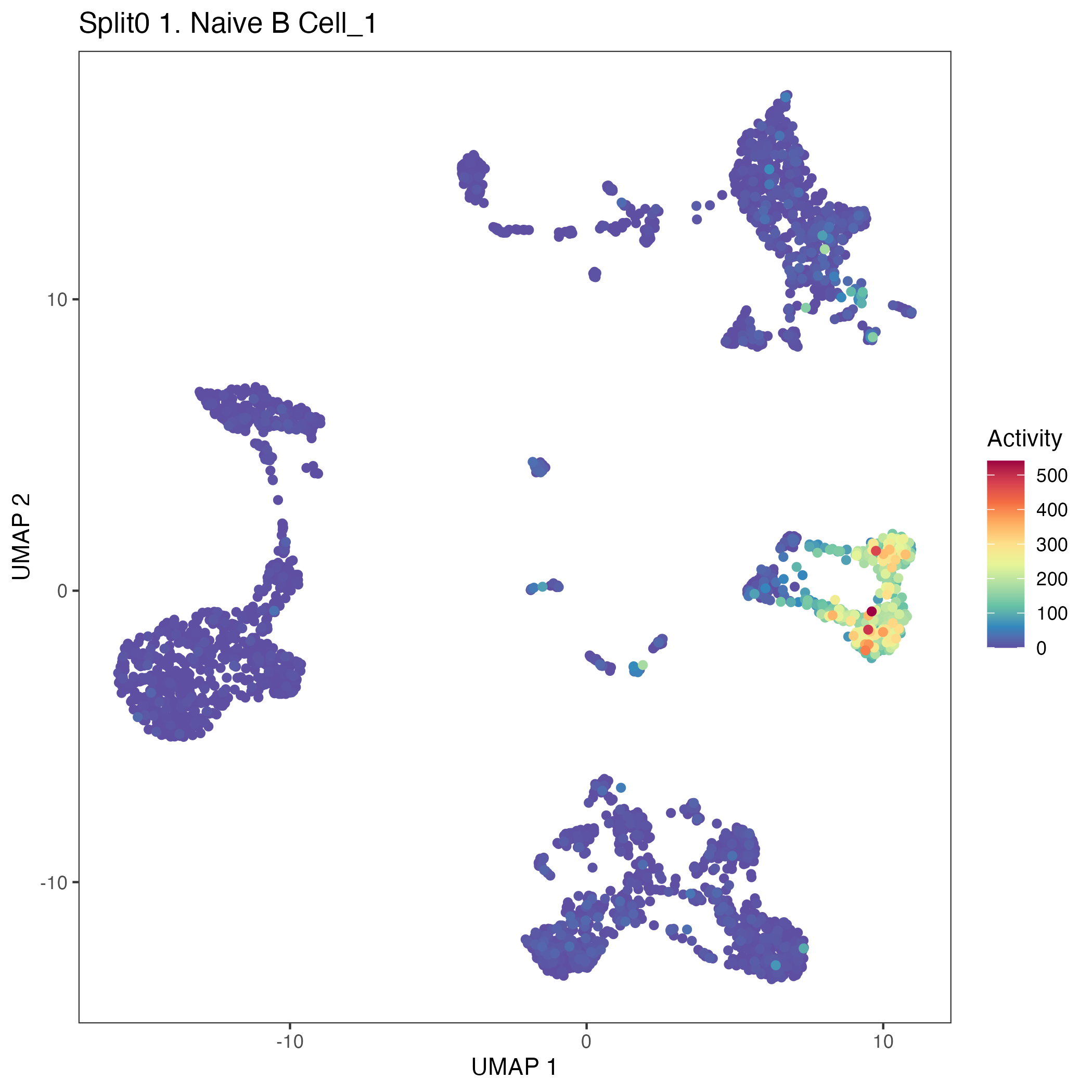 Cycling cells: Cycling B cells (model markers) proliferating B lymphocytes: Wilcoxon ranksum test P-value for gene set overrepresentation: 7.75e-01 Mean rank of genes in gene set: 7854.67 Rank on gene expression program of genes in gene set: