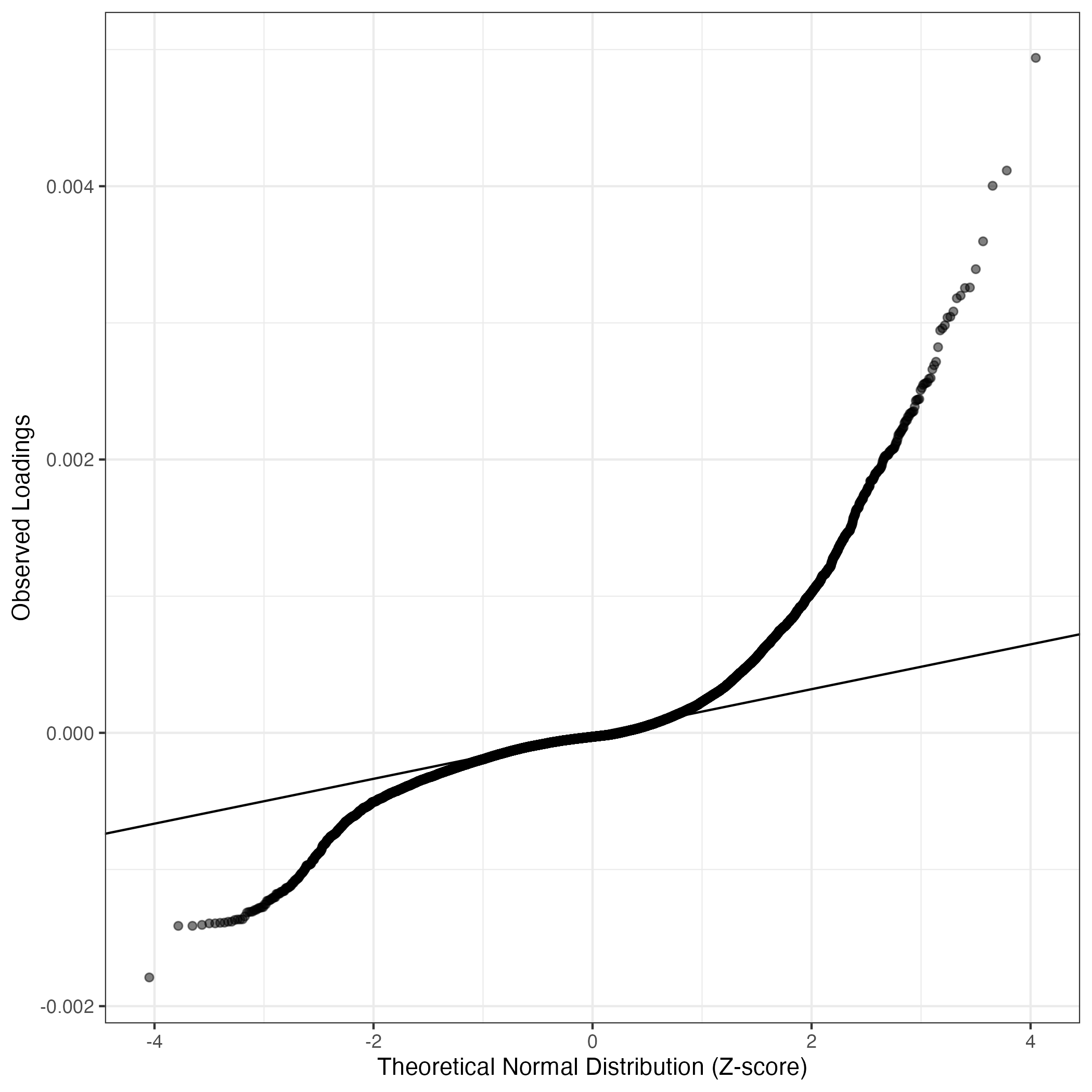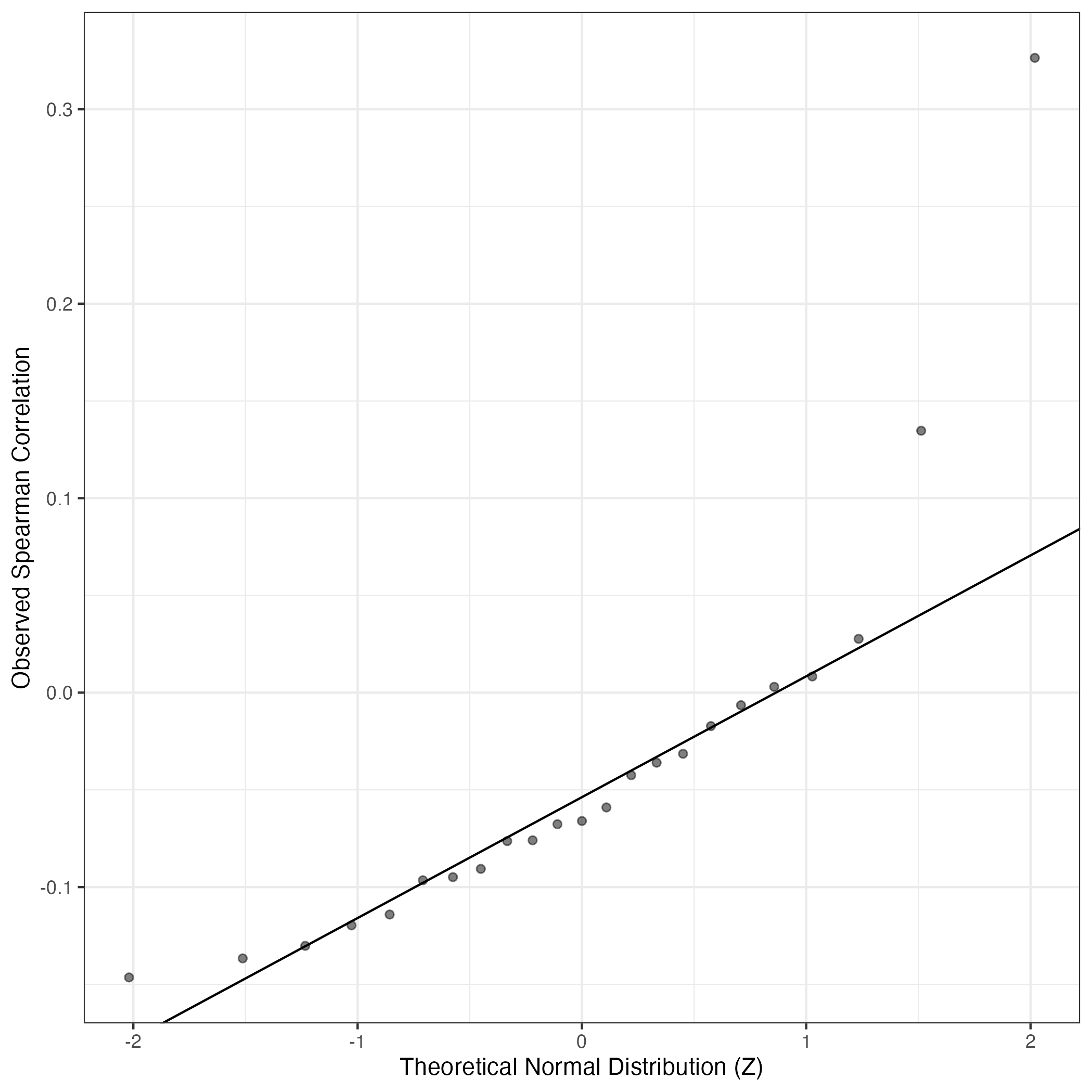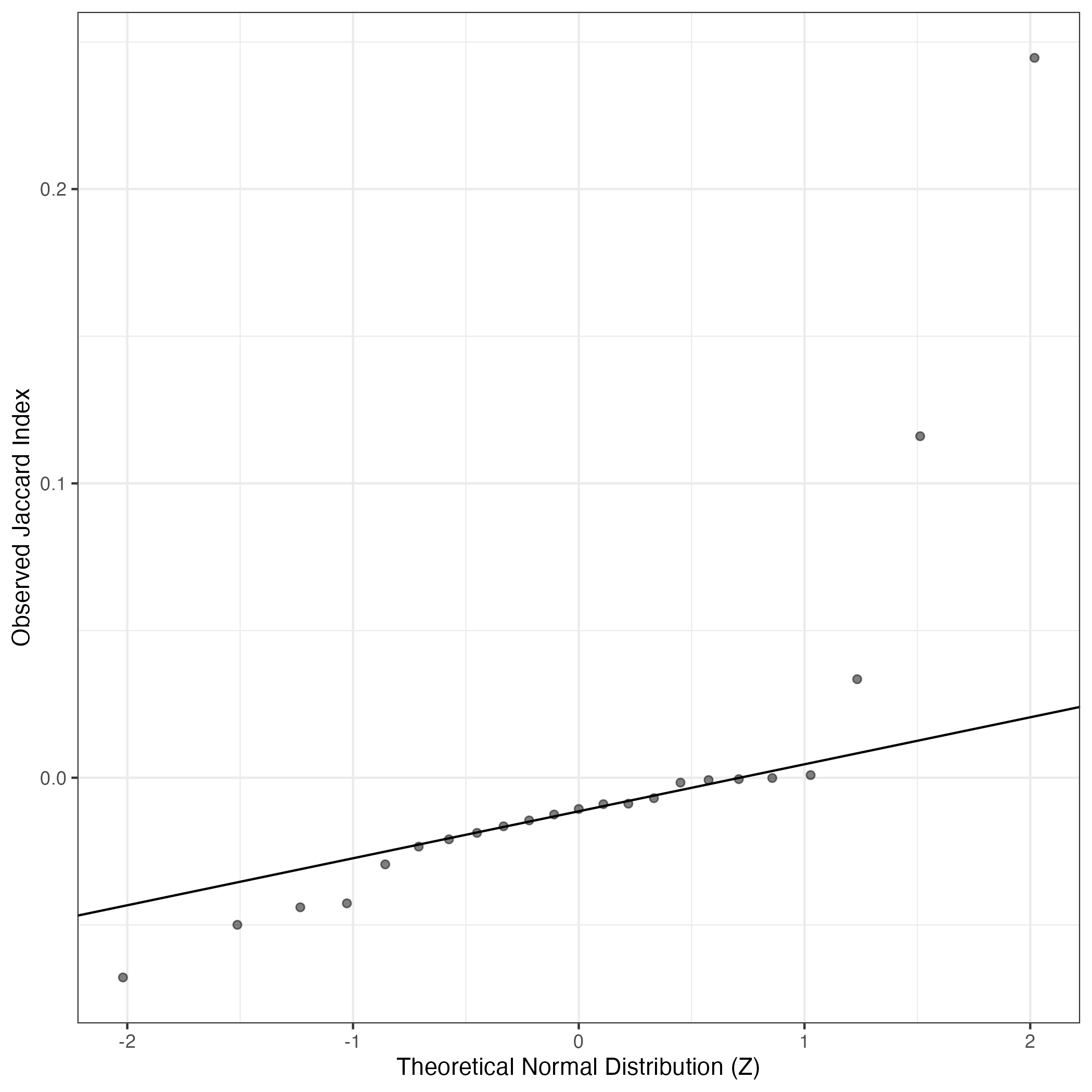 A similar QQ-plot as above, but only for instances where the H value is e.g. > 25, i.e. we are confident that the expression program is active above noise. Agreemenet between these binary vectors is tested using the Jaccard Index, with the P-values calculated by an exact test: