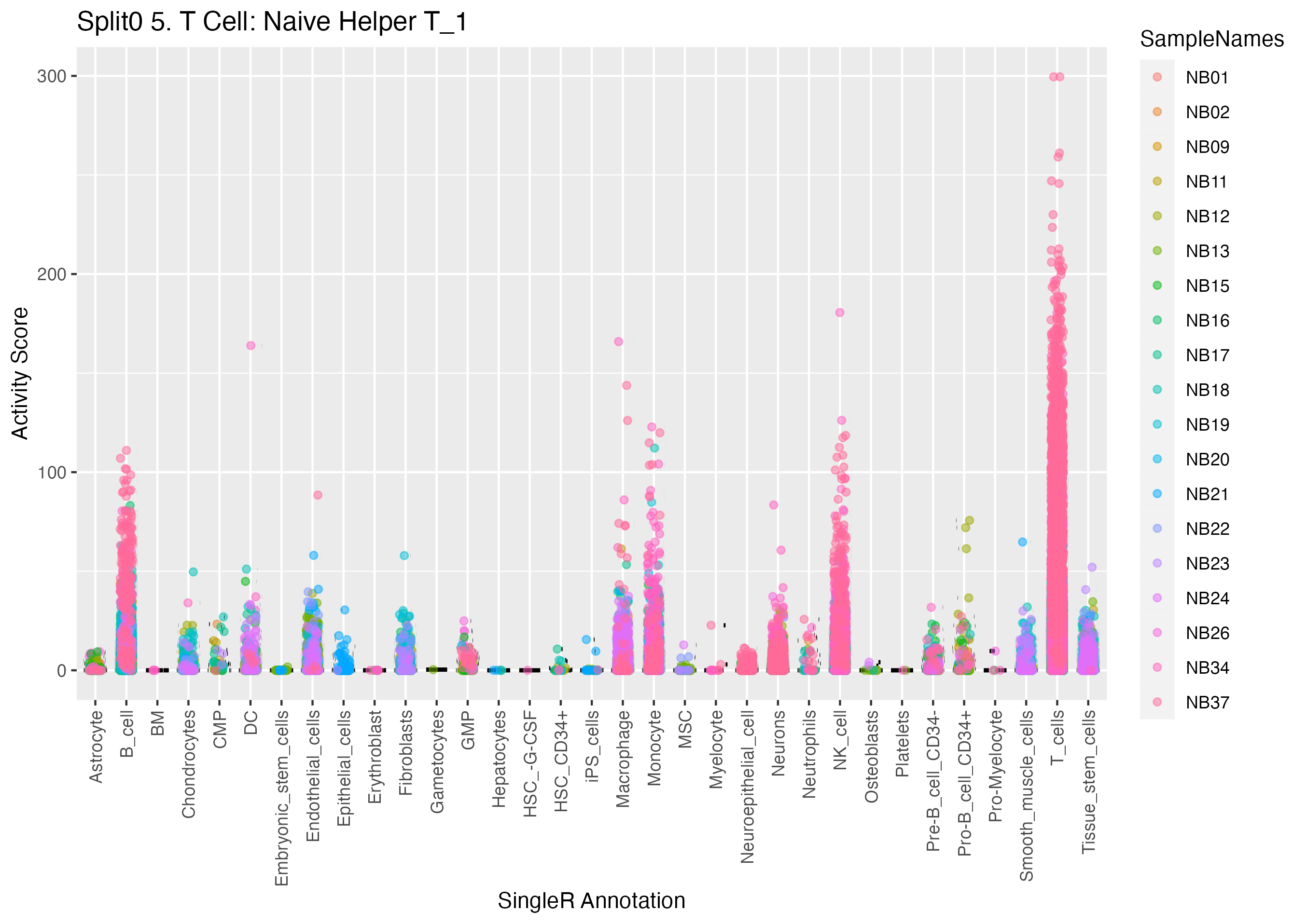 T cells: NKT cells (curated markers) distinct T lymphocyte subpopulation that expresses both alpha/beta T-cell receptors and surface receptors of natural killer cells: Wilcoxon ranksum test P-value for gene set overrepresentation: 9.98e-01 Mean rank of genes in gene set: 27770.33 Rank on gene expression program of genes in gene set: