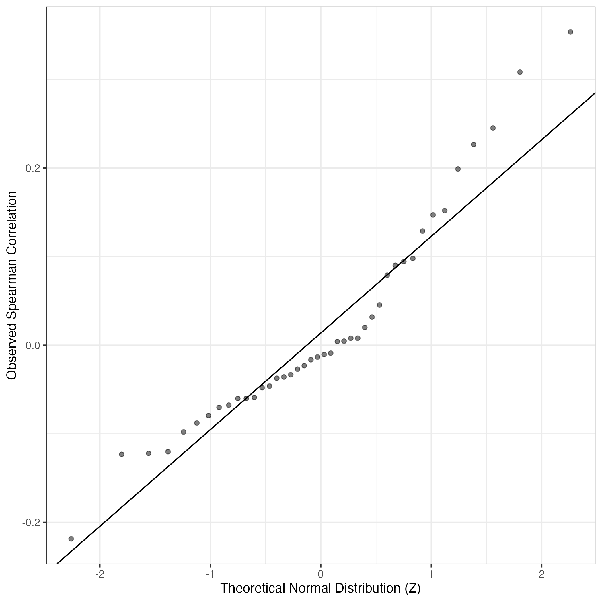 A similar QQ-plot as above, but only for instances where the H value is e.g. > 25, i.e. we are confident that the expression program is active above noise. Agreemenet between these binary vectors is tested using the Jaccard Index, with the P-values calculated by an exact test: