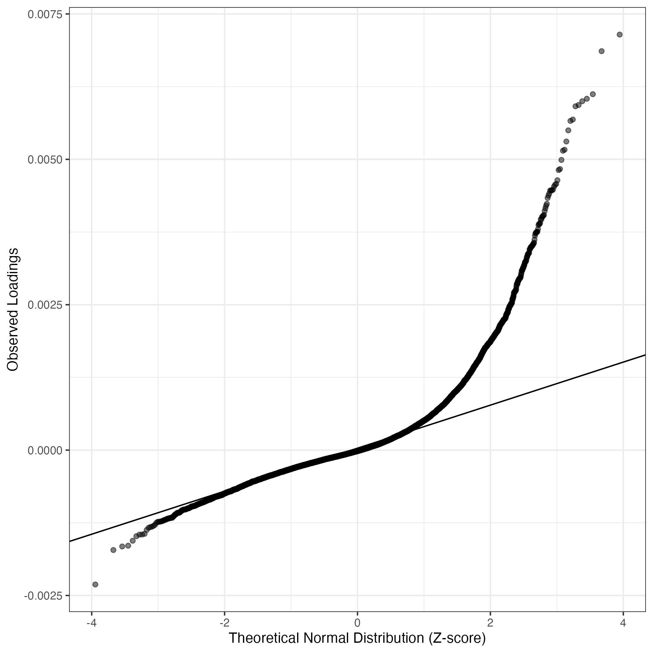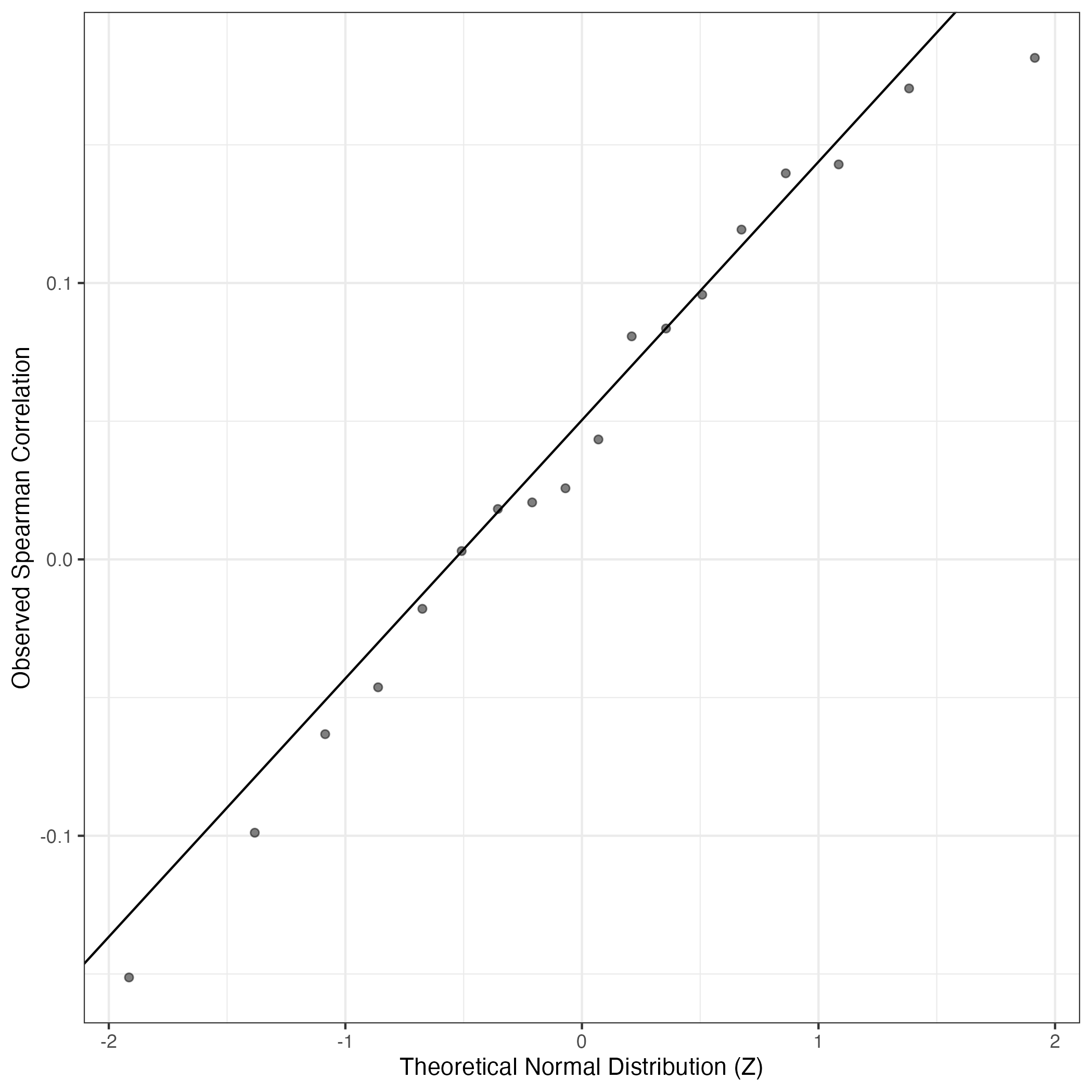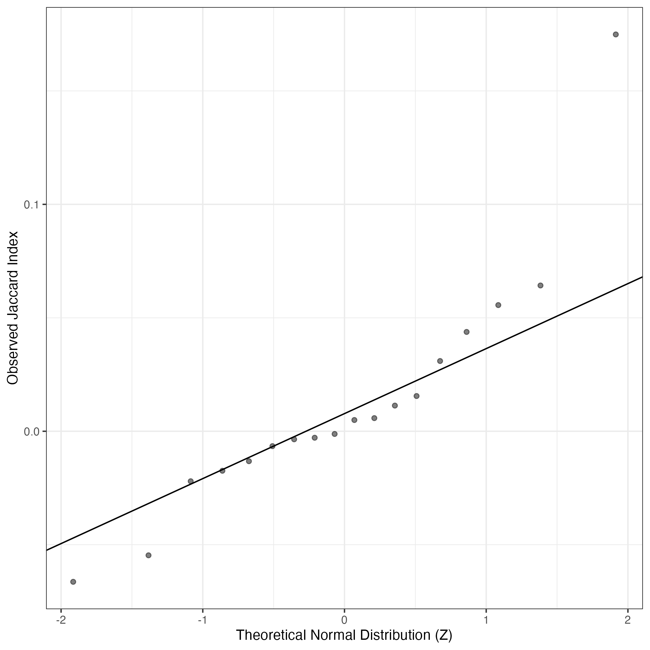 A similar QQ-plot as above, but only for instances where the H value is e.g. > 25, i.e. we are confident that the expression program is active above noise. Agreemenet between these binary vectors is tested using the Jaccard Index, with the P-values calculated by an exact test: