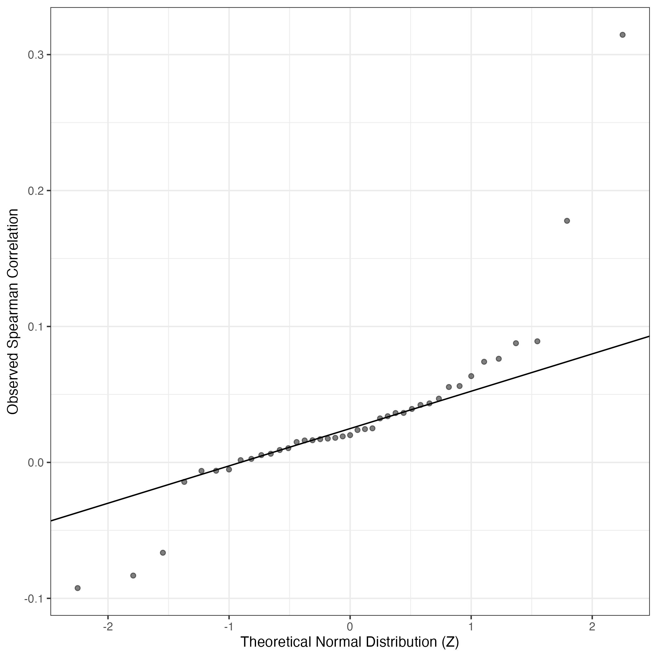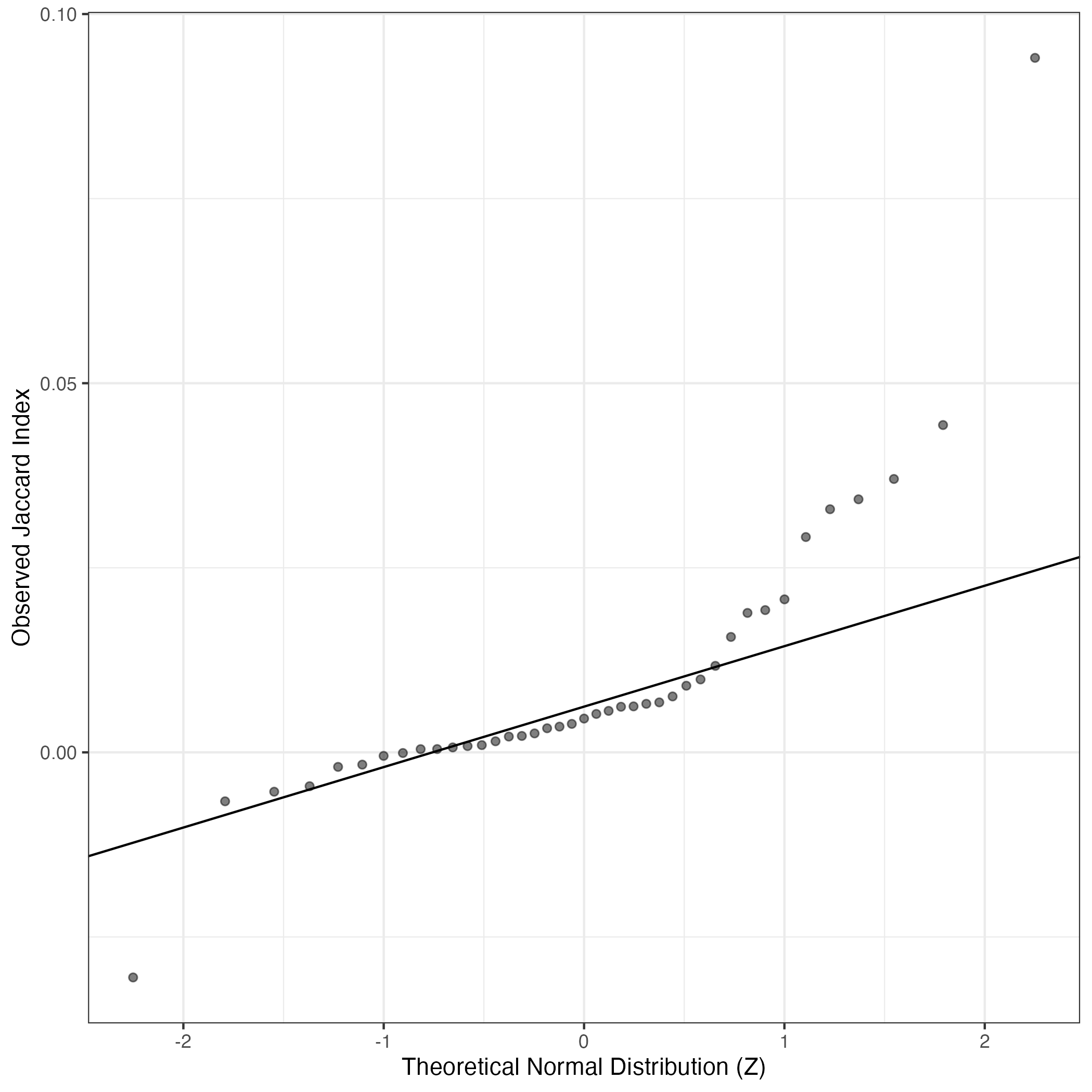 A similar QQ-plot as above, but only for instances where the H value is e.g. > 25, i.e. we are confident that the expression program is active above noise. Agreemenet between these binary vectors is tested using the Jaccard Index, with the P-values calculated by an exact test: