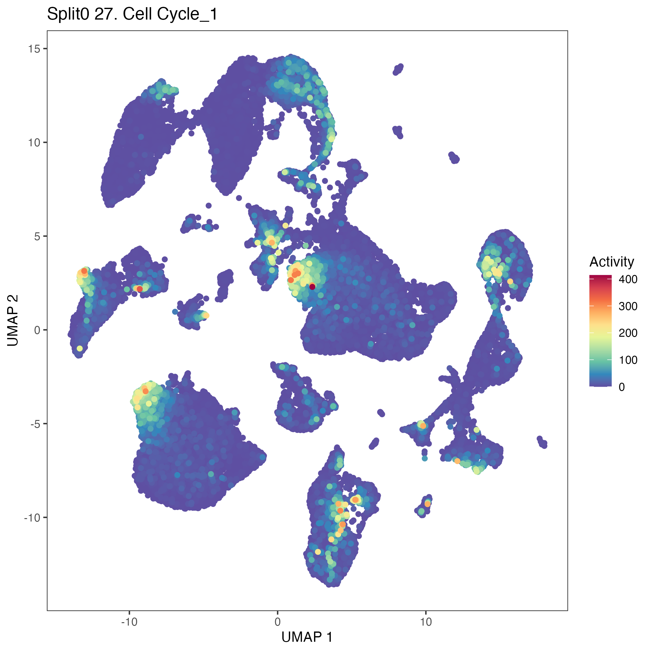 Cycling cells: Cycling monocytes (model markers) proliferating monocytes: Wilcoxon ranksum test P-value for gene set overrepresentation: 8.70e-01 Mean rank of genes in gene set: 17104 Rank on gene expression program of genes in gene set: