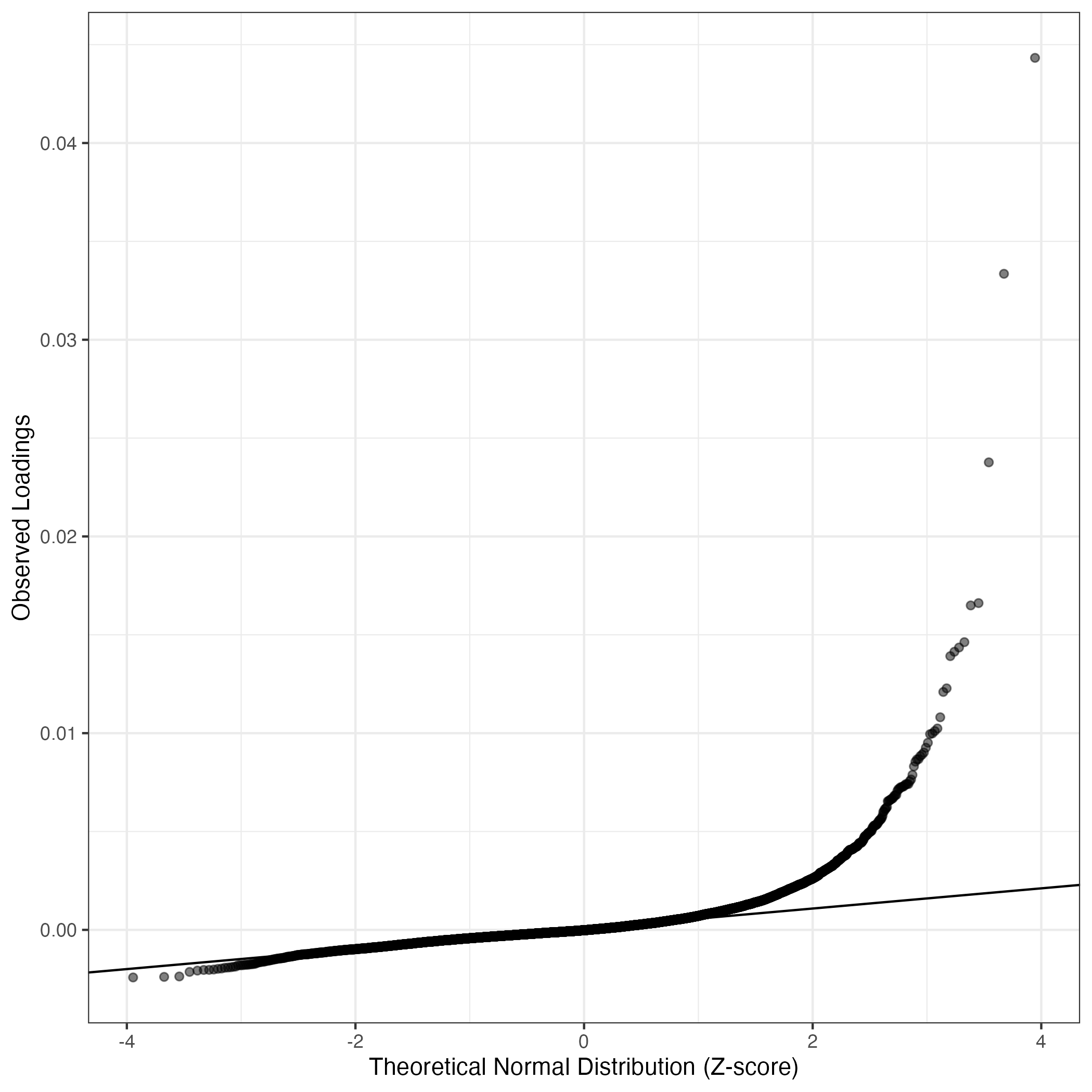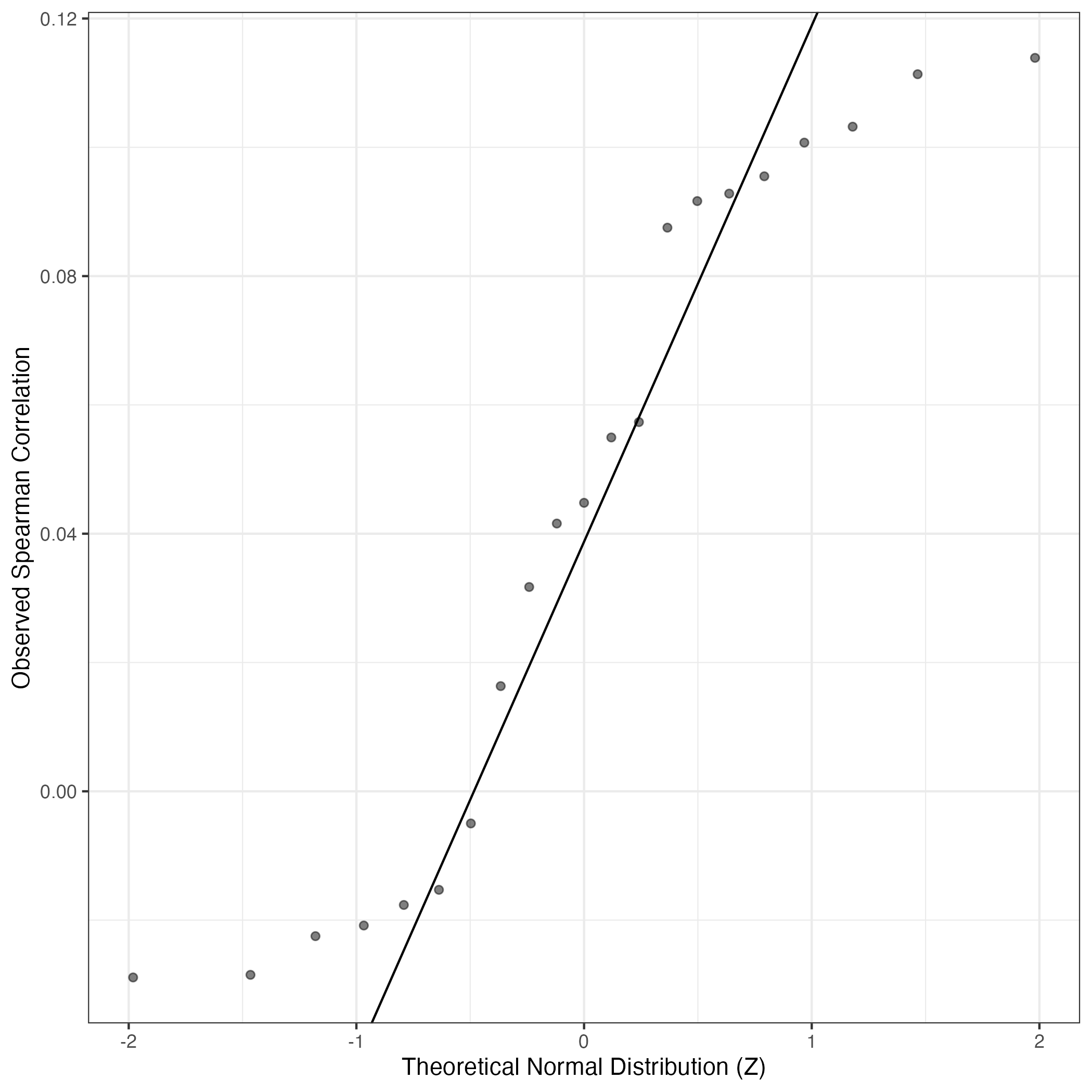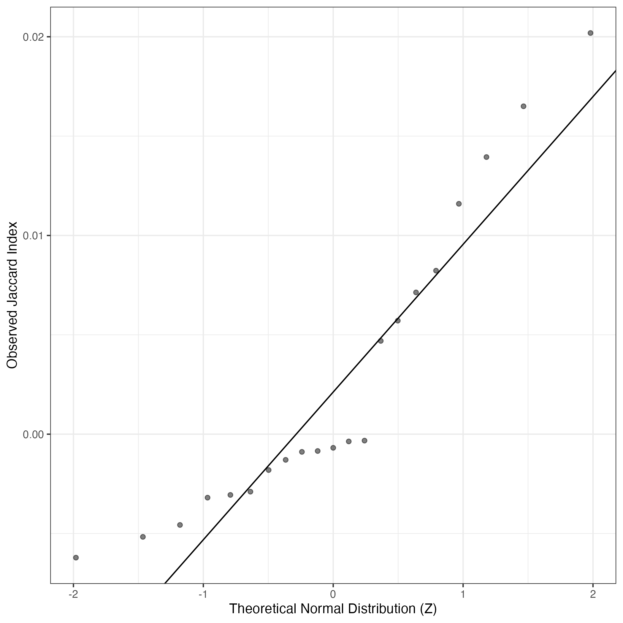 A similar QQ-plot as above, but only for instances where the H value is e.g. > 25, i.e. we are confident that the expression program is active above noise. Agreemenet between these binary vectors is tested using the Jaccard Index, with the P-values calculated by an exact test: