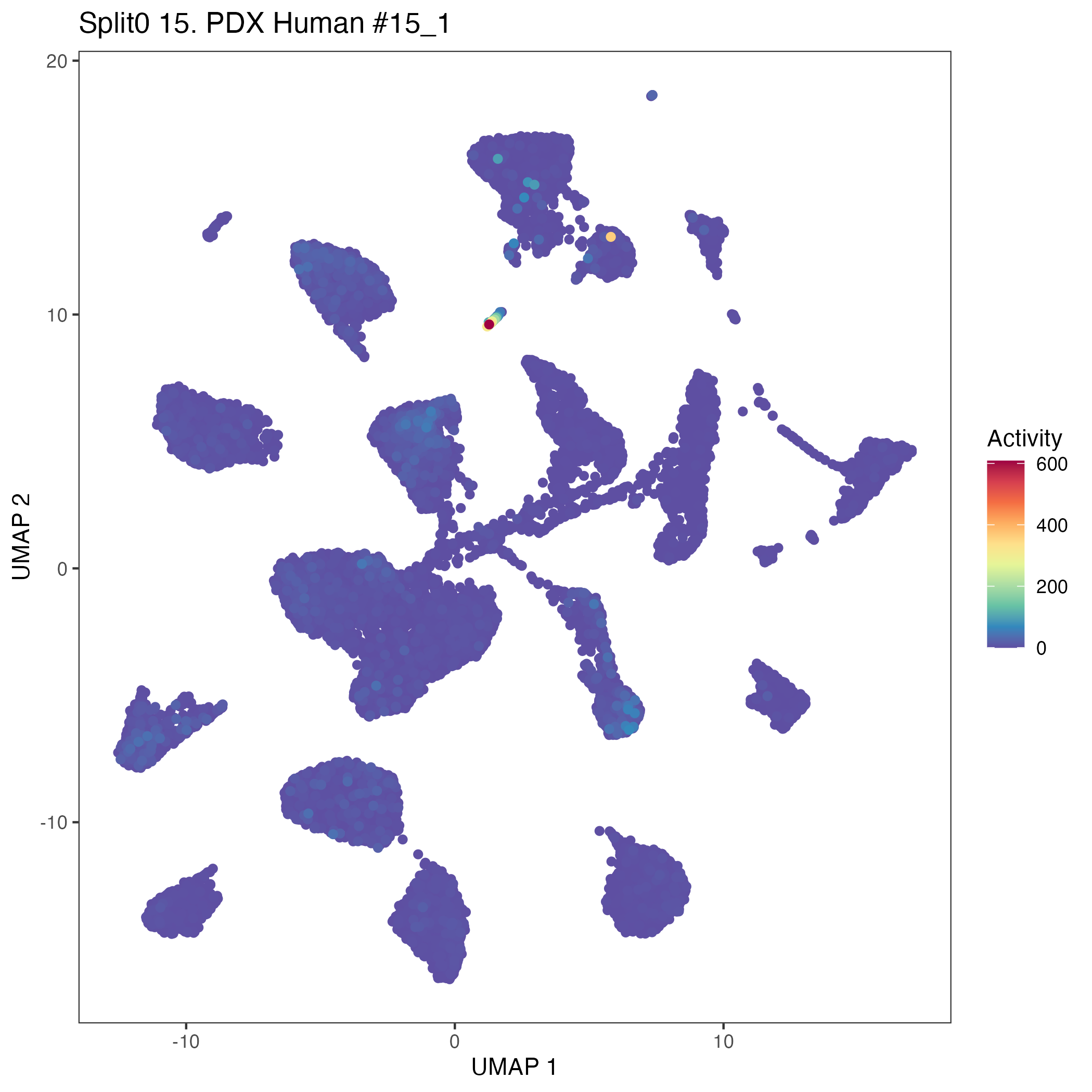 SCPs neuroblastoma unique (Olsen) Similar to above, but for genes unique to neuroblastoma SCP-like cells. Note FN1 is often used as a mesenchymal marker gene.: Wilcoxon ranksum test P-value for gene set overrepresentation: 8.41e-01 Mean rank of genes in gene set: 7749.17 Rank on gene expression program of genes in gene set: