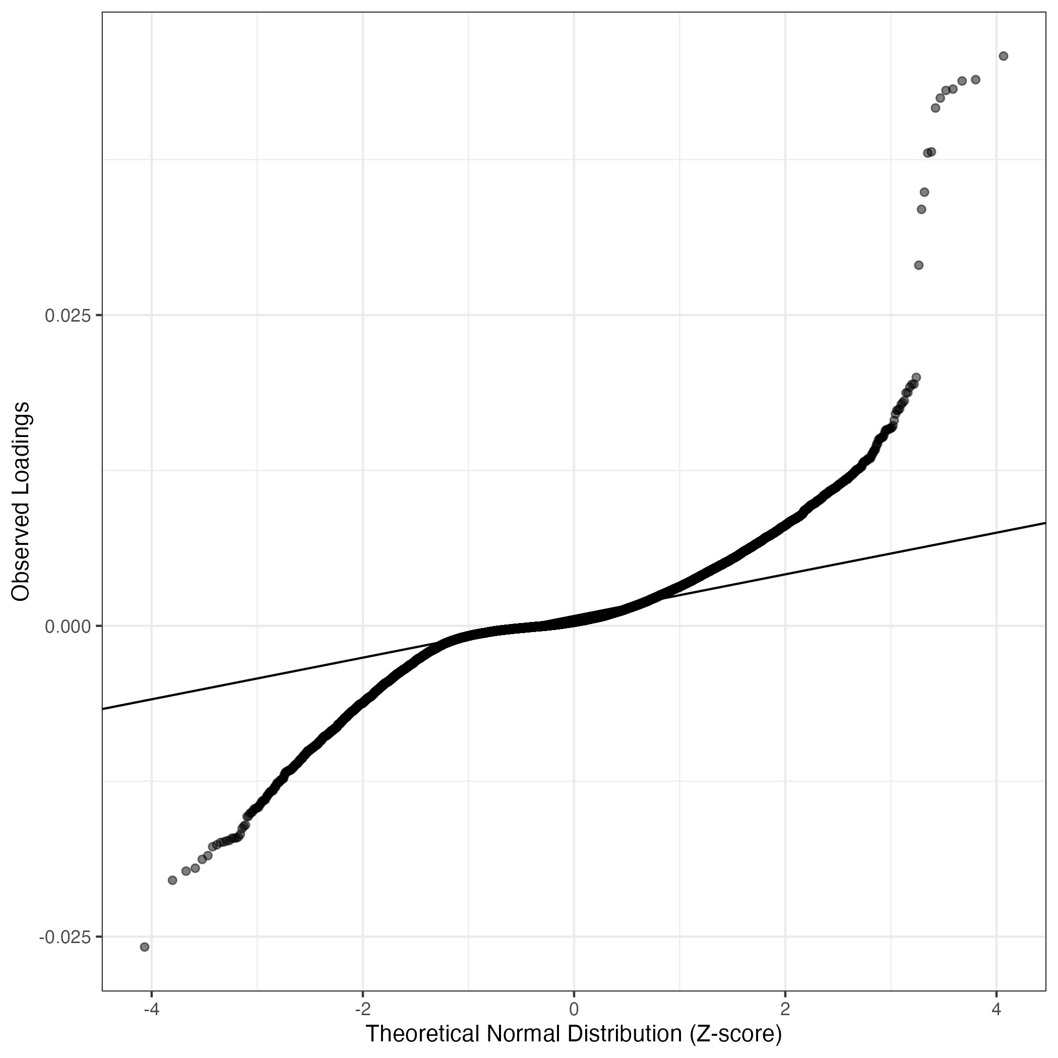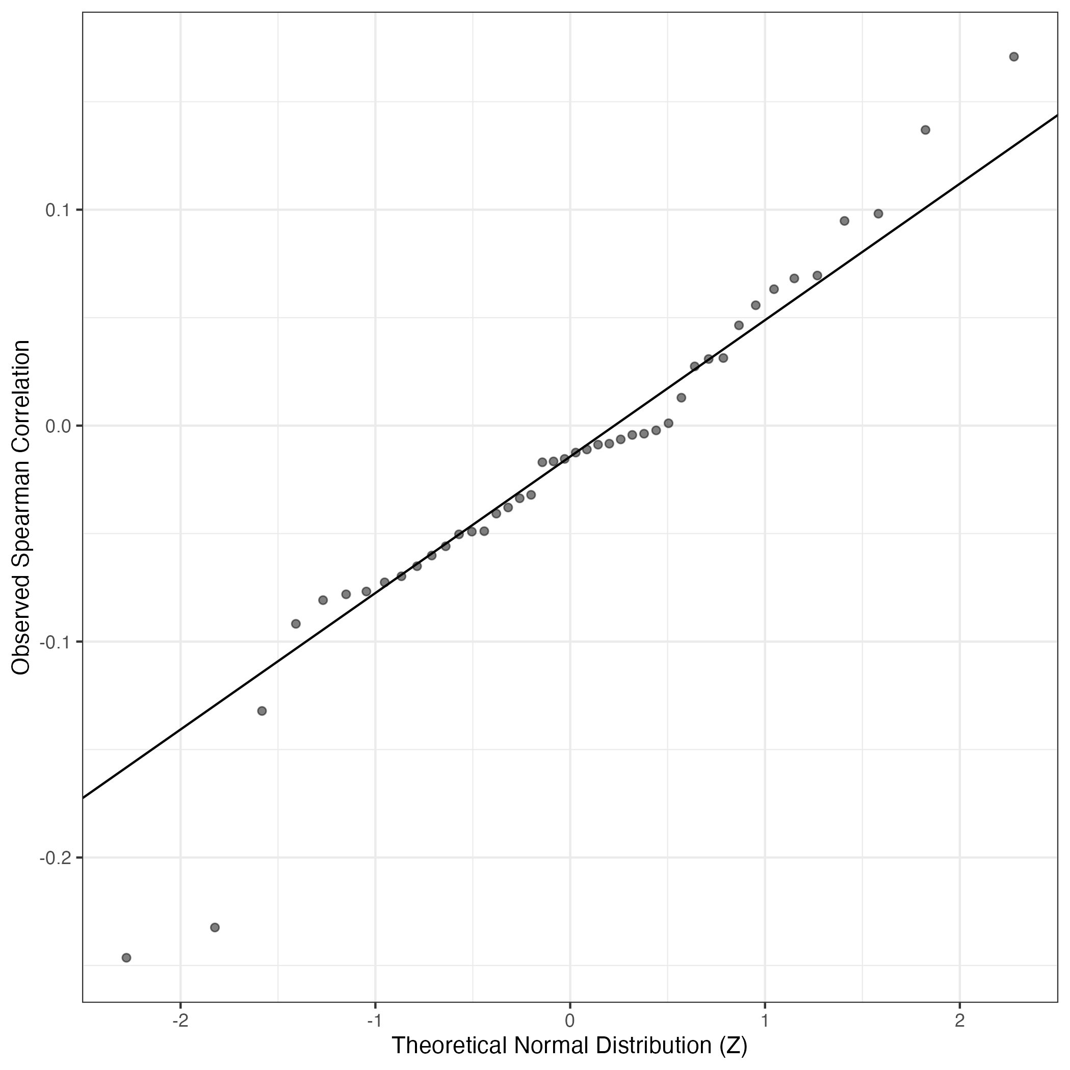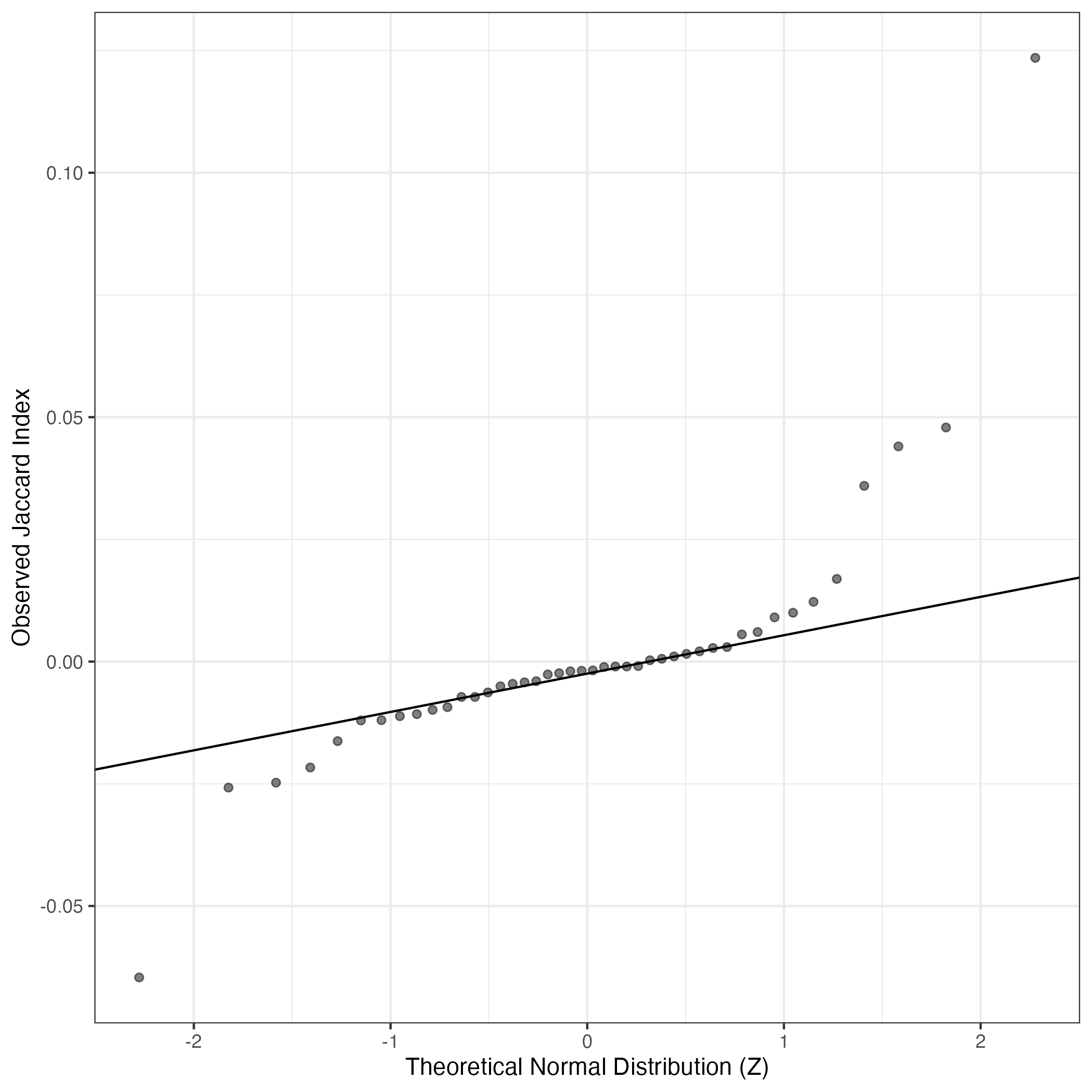 A similar QQ-plot as above, but only for instances where the H value is e.g. > 25, i.e. we are confident that the expression program is active above noise. Agreemenet between these binary vectors is tested using the Jaccard Index, with the P-values calculated by an exact test: