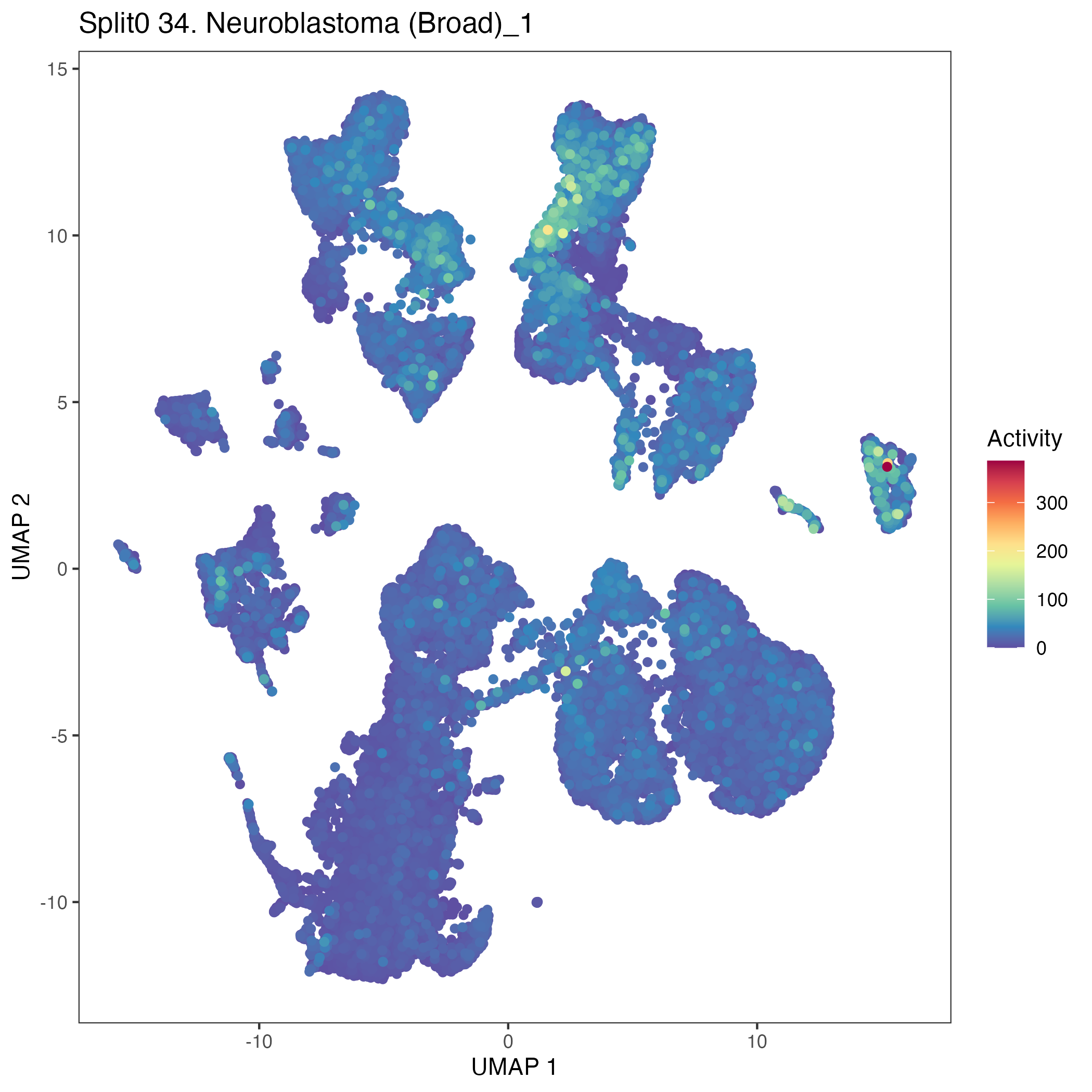 SCPs neuroblastoma unique (Olsen) Similar to above, but for genes unique to neuroblastoma SCP-like cells. Note FN1 is often used as a mesenchymal marker gene.: Wilcoxon ranksum test P-value for gene set overrepresentation: 7.26e-01 Mean rank of genes in gene set: 11958 Rank on gene expression program of genes in gene set: