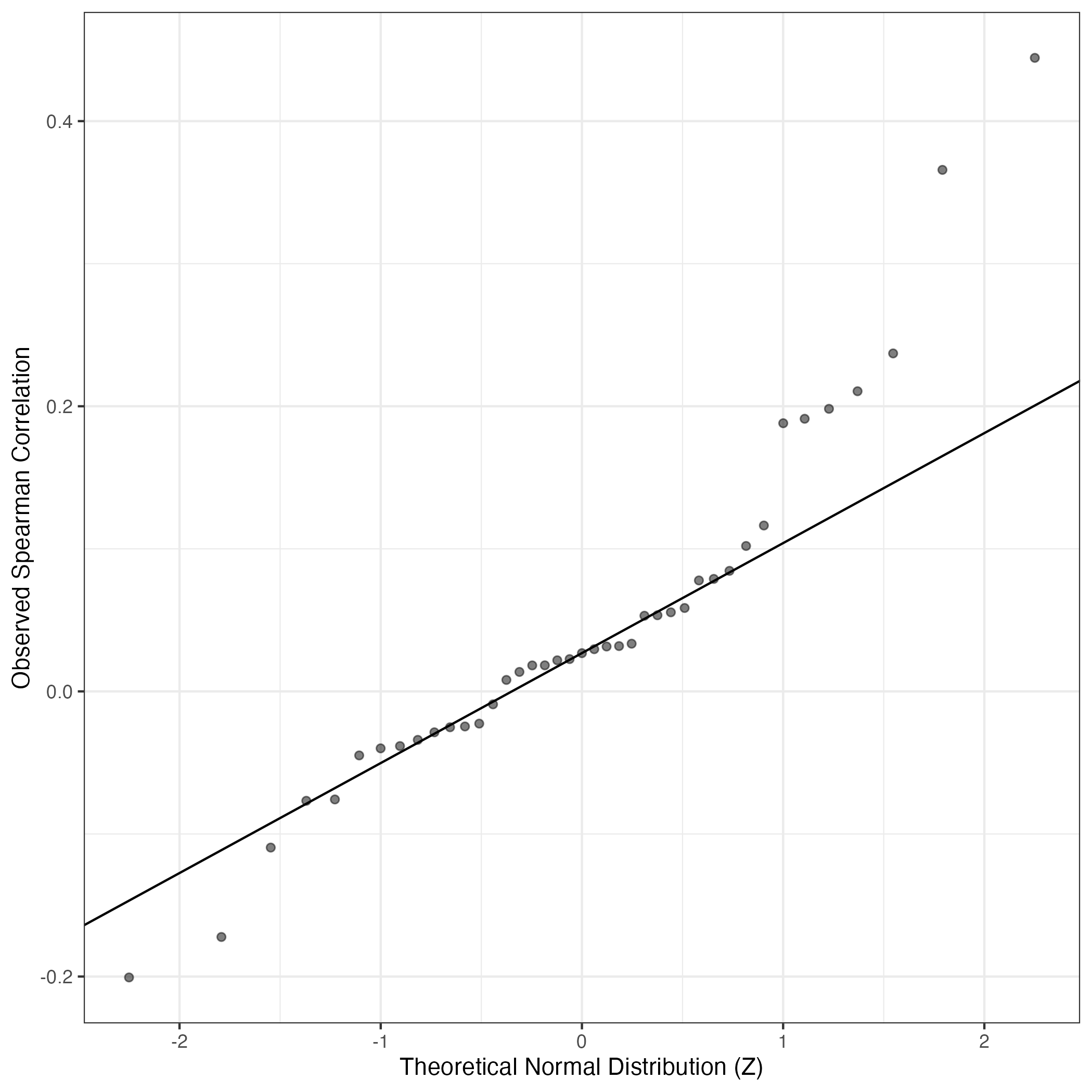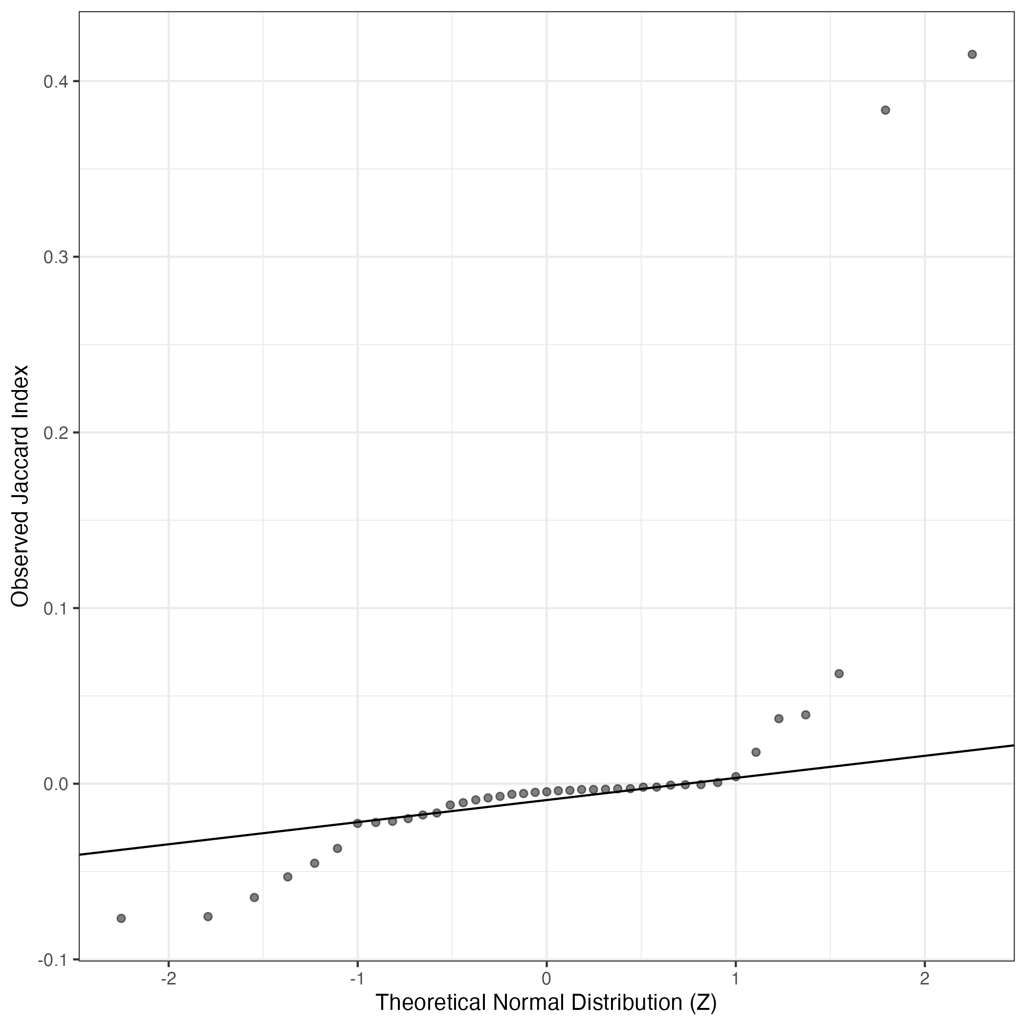 A similar QQ-plot as above, but only for instances where the H value is e.g. > 25, i.e. we are confident that the expression program is active above noise. Agreemenet between these binary vectors is tested using the Jaccard Index, with the P-values calculated by an exact test: