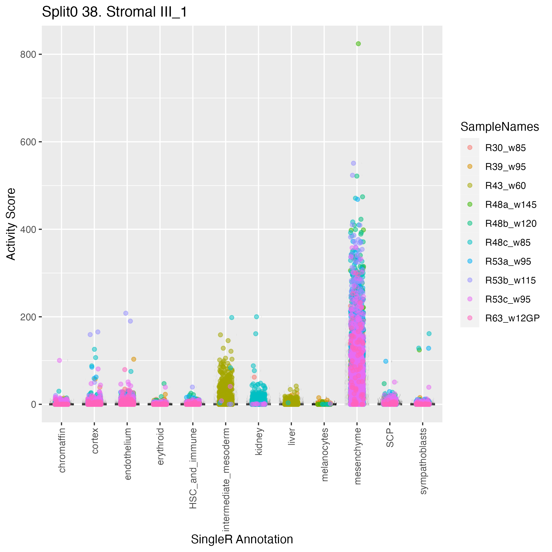 Bridge region mesenchymal-SCP transition (Olsen) As above but for cells in the mesenchymal transitioning to SCP region: Wilcoxon ranksum test P-value for gene set overrepresentation: 8.38e-01 Mean rank of genes in gene set: 17140.33 Rank on gene expression program of genes in gene set: