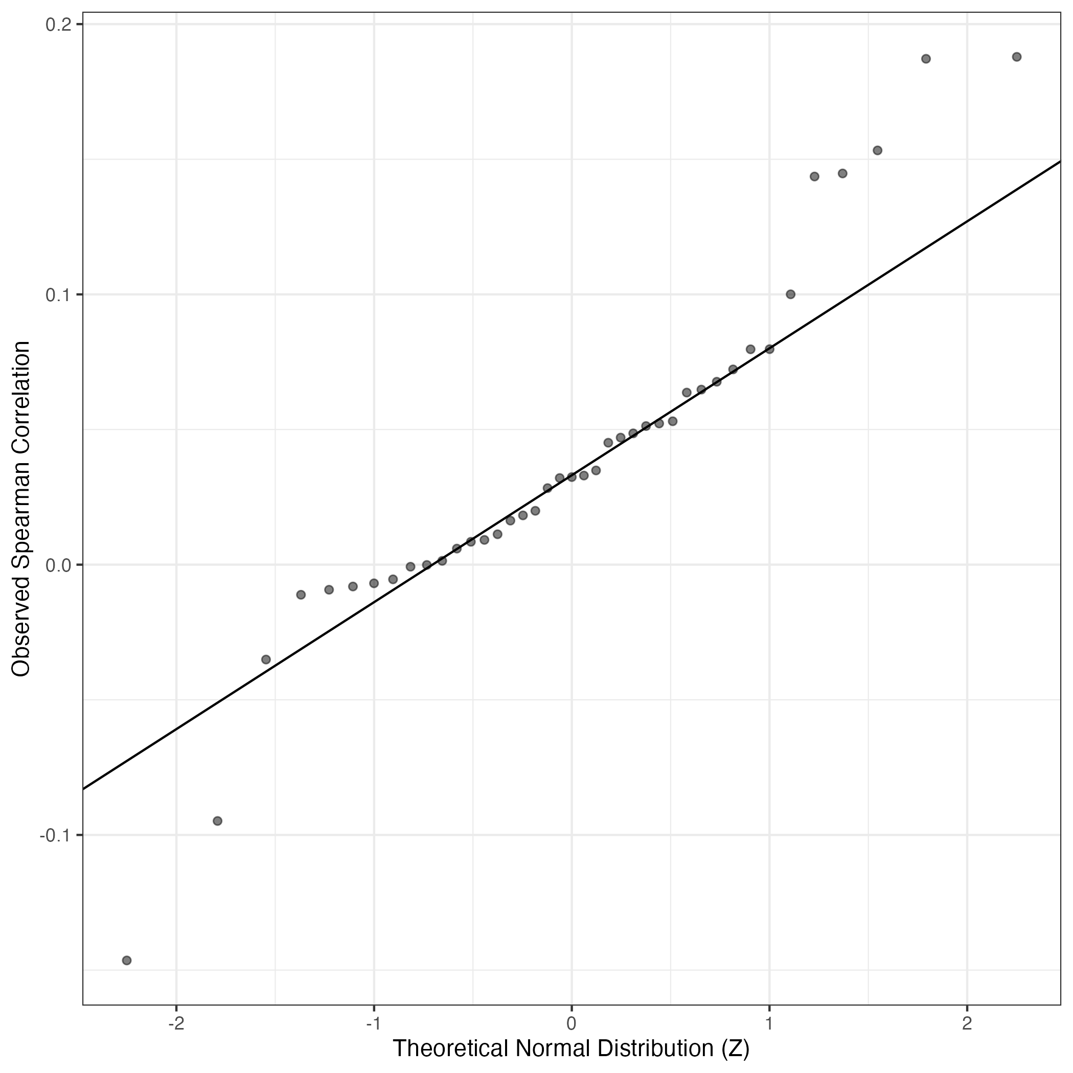 A similar QQ-plot as above, but only for instances where the H value is e.g. > 25, i.e. we are confident that the expression program is active above noise. Agreemenet between these binary vectors is tested using the Jaccard Index, with the P-values calculated by an exact test: