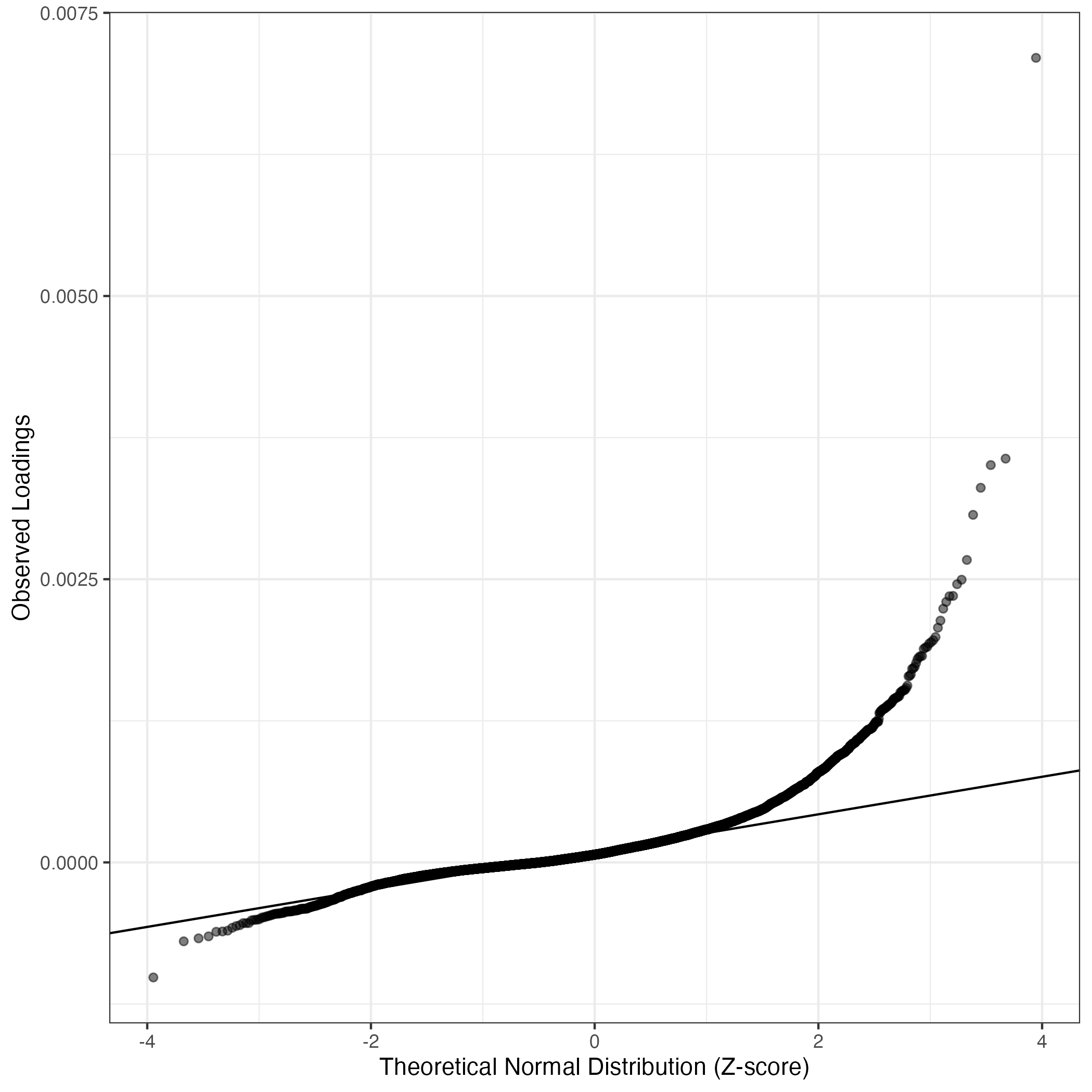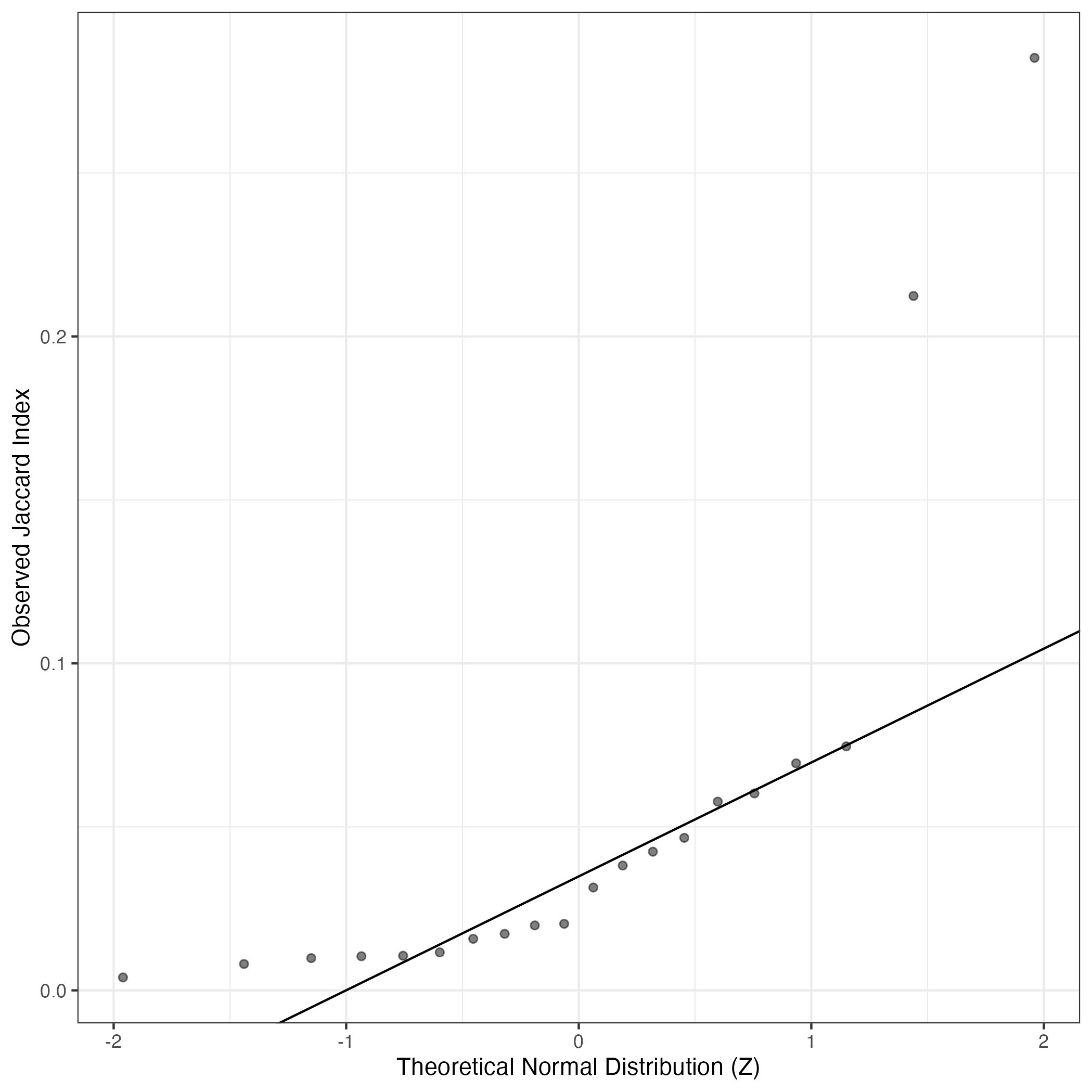A similar QQ-plot as above, but only for instances where the H value is e.g. > 25, i.e. we are confident that the expression program is active above noise. Agreemenet between these binary vectors is tested using the Jaccard Index, with the P-values calculated by an exact test: