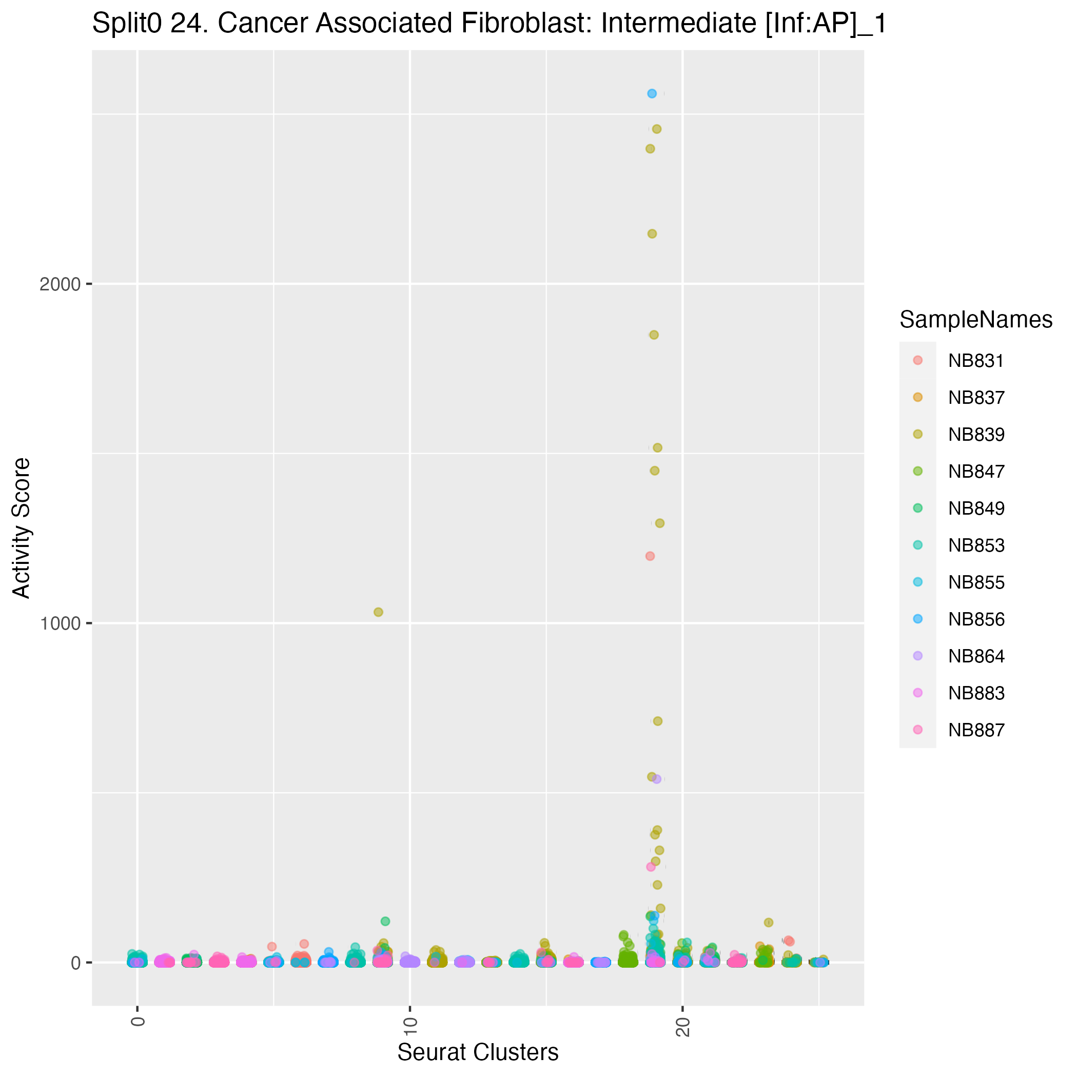 UMAP plots showing activity of gene expression program identified in community:24. Cancer Associated Fibroblast: Intermediate [Inf:AP]