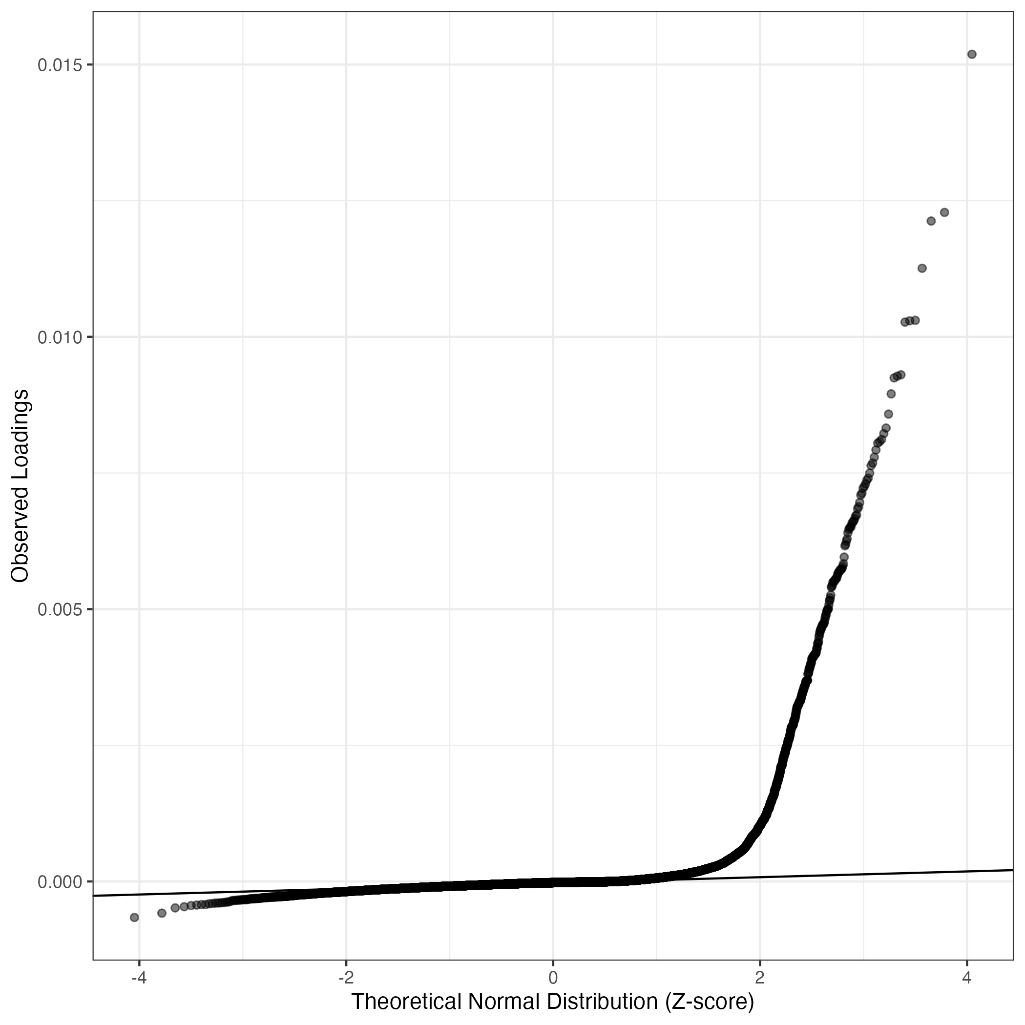 A similar QQ-plot as above, but only for instances where the H value is e.g. > 25, i.e. we are confident that the expression program is active above noise. Agreemenet between these binary vectors is tested using the Jaccard Index, with the P-values calculated by an exact test: