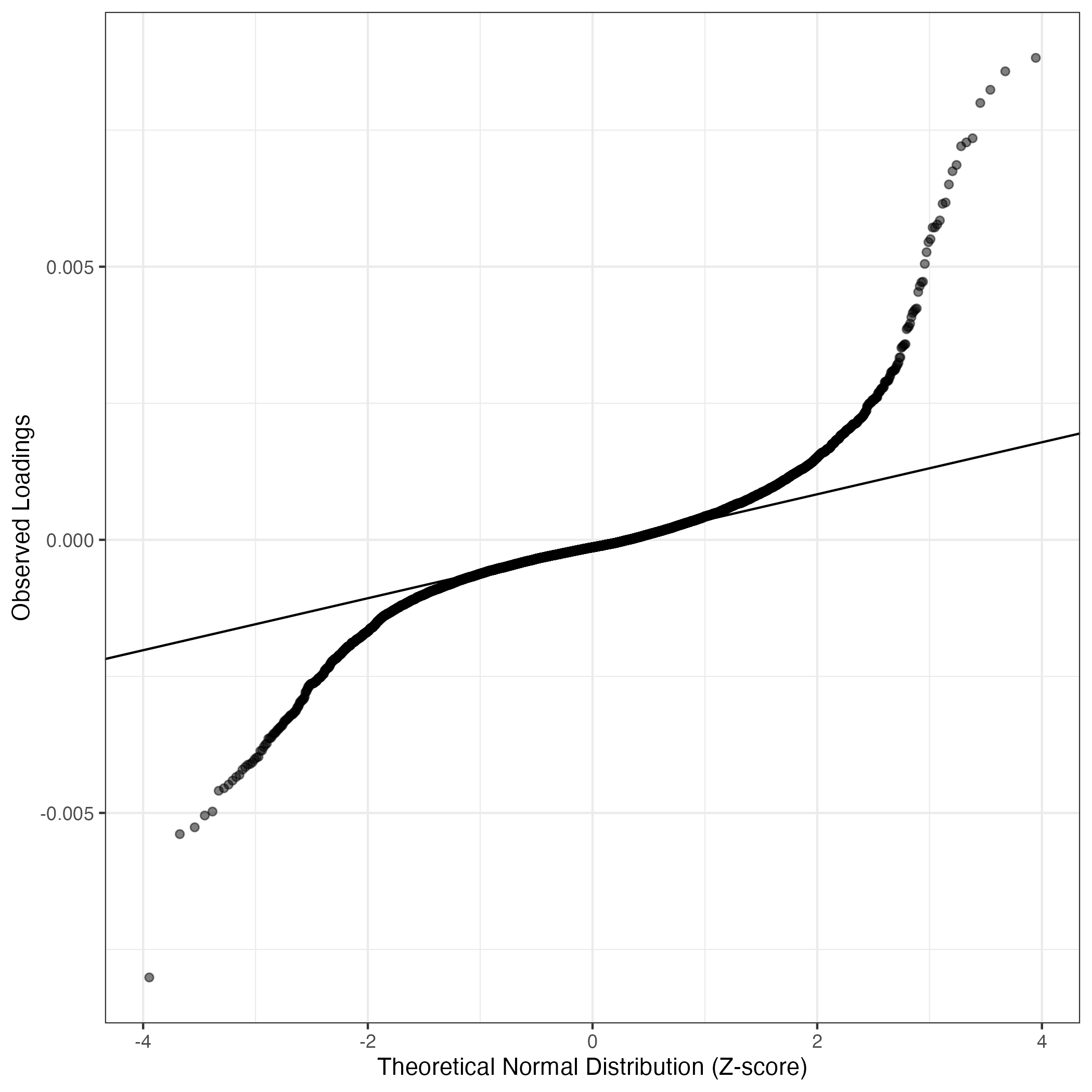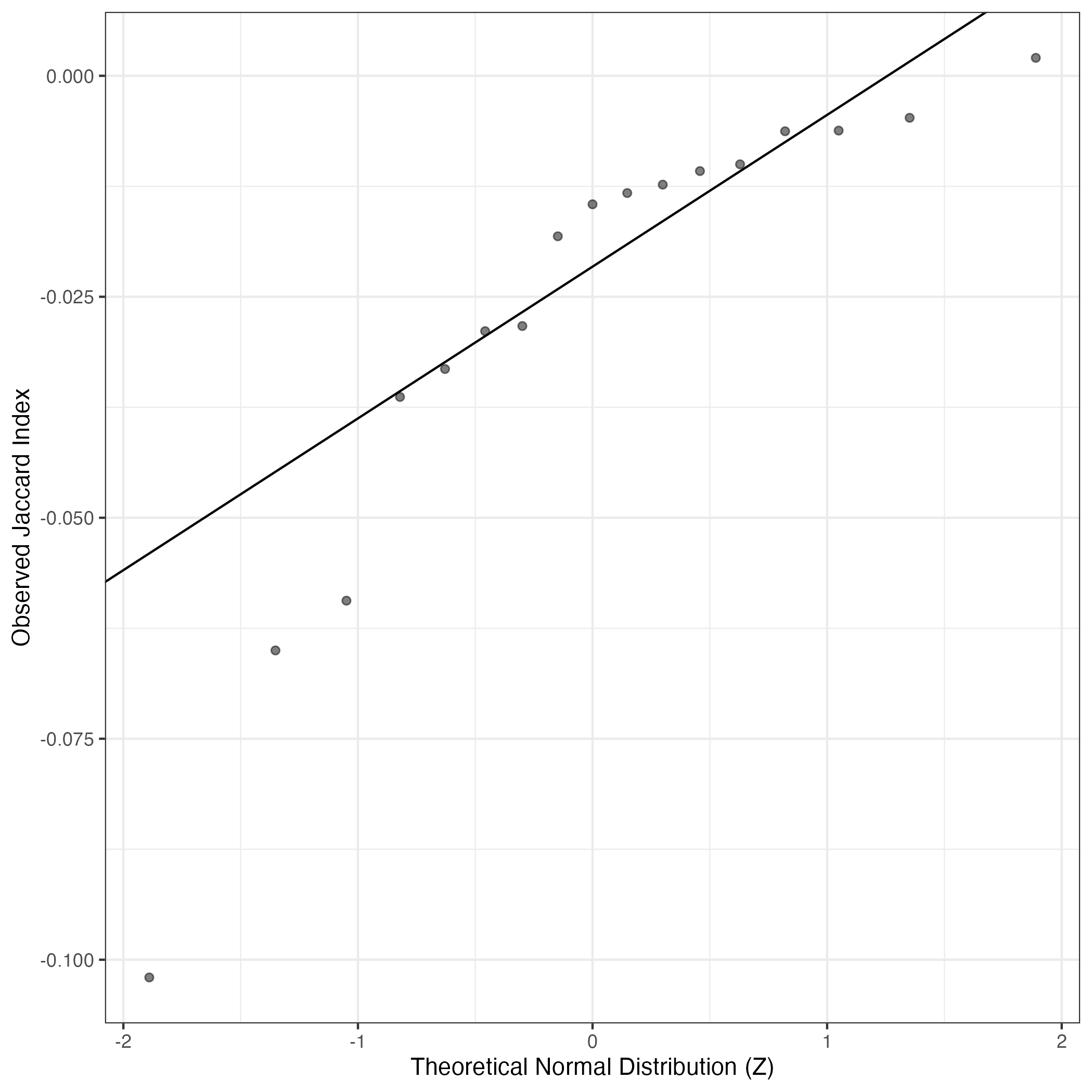 A similar QQ-plot as above, but only for instances where the H value is e.g. > 25, i.e. we are confident that the expression program is active above noise. Agreemenet between these binary vectors is tested using the Jaccard Index, with the P-values calculated by an exact test: