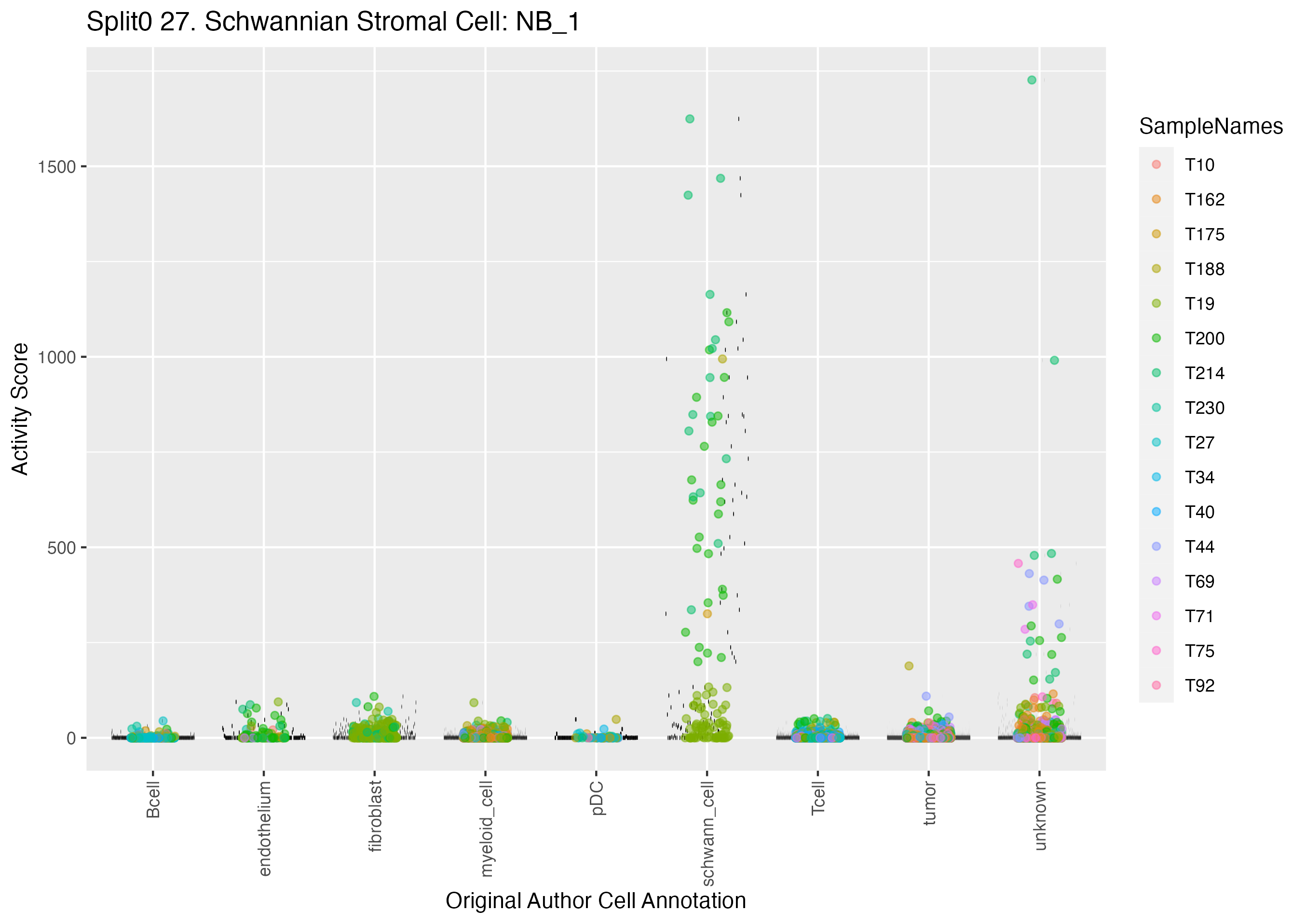 UMAP plots showing activity of gene expression program identified in GEP 27. Schwannian Stromal Cell: NB: