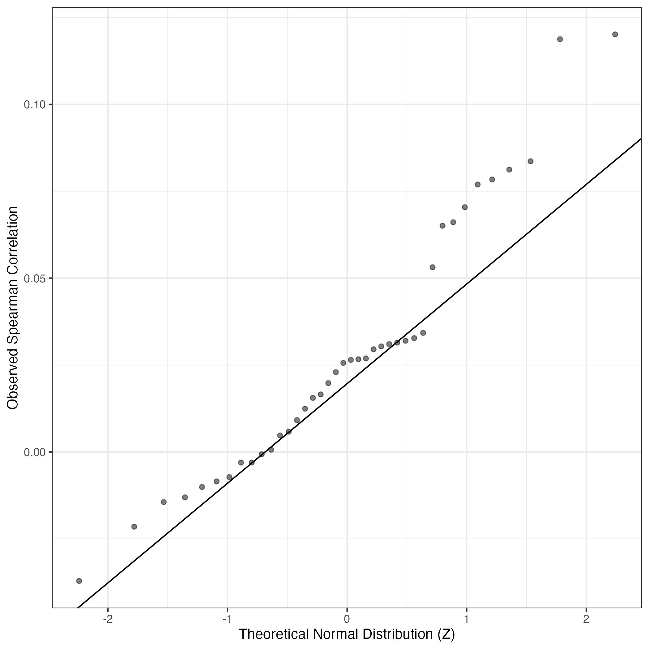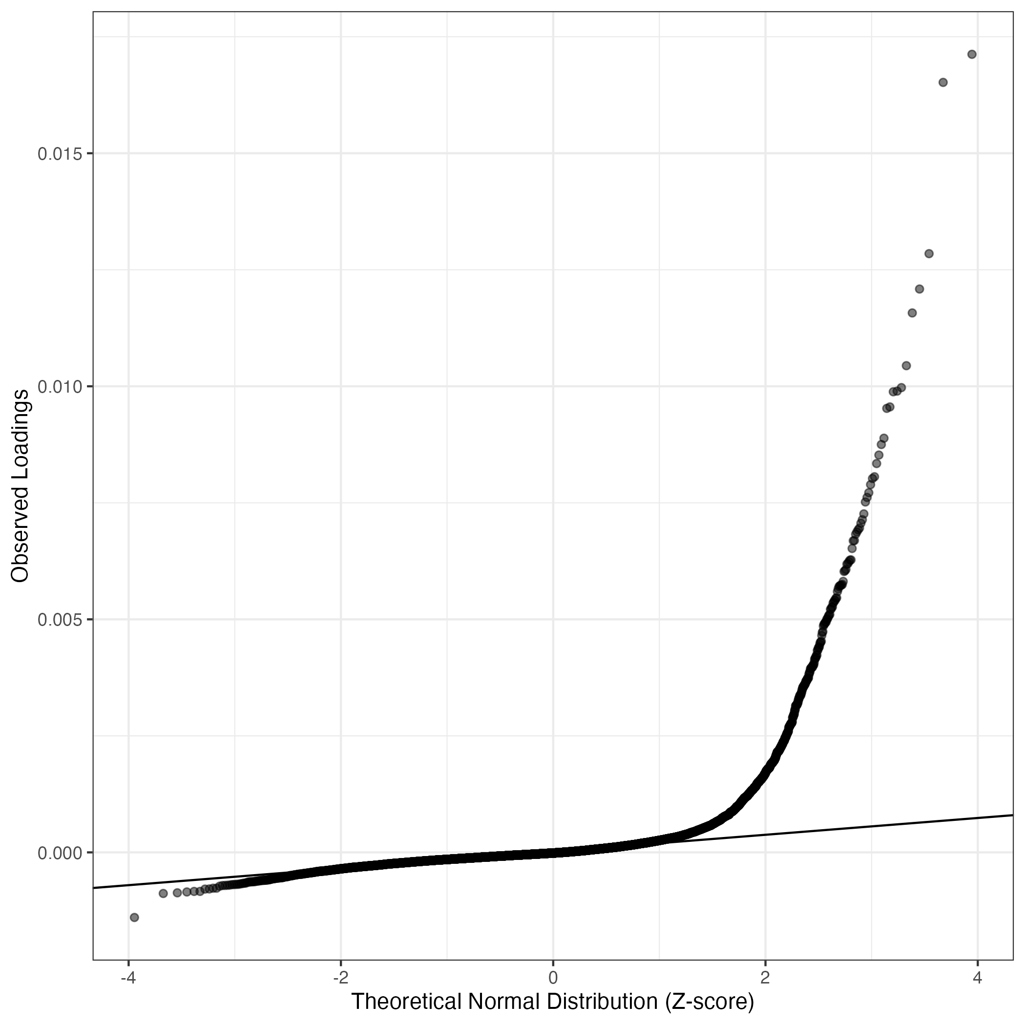 QQ-plot of gene loadings, averaged over both independent splits of the data