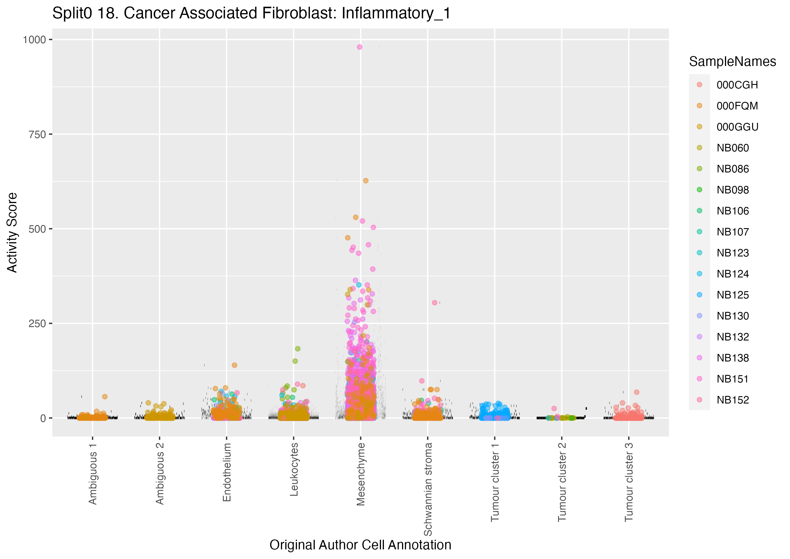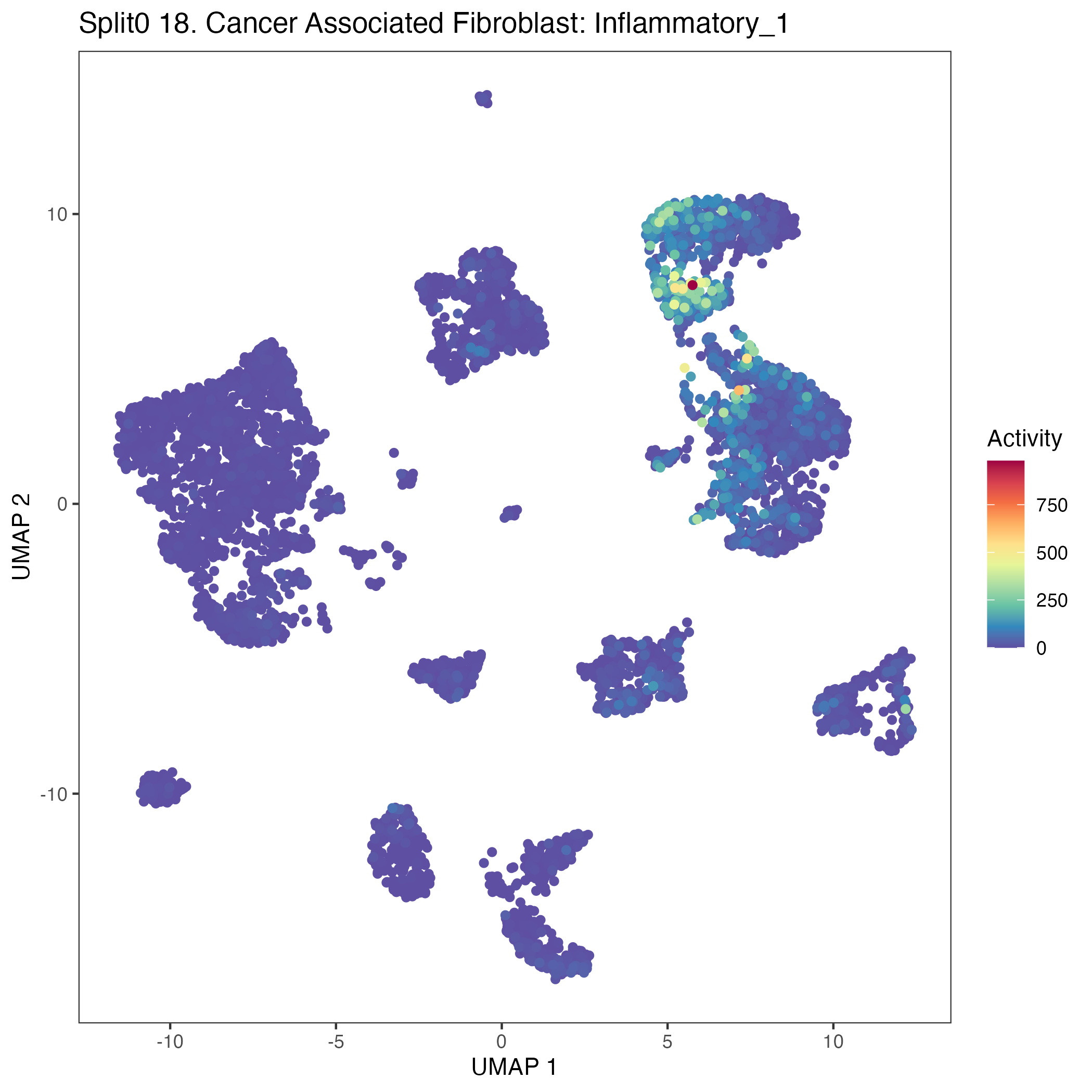 UMAP plots showing activity of gene expression program identified in community:18. Cancer Associated Fibroblast: Inflammatory
