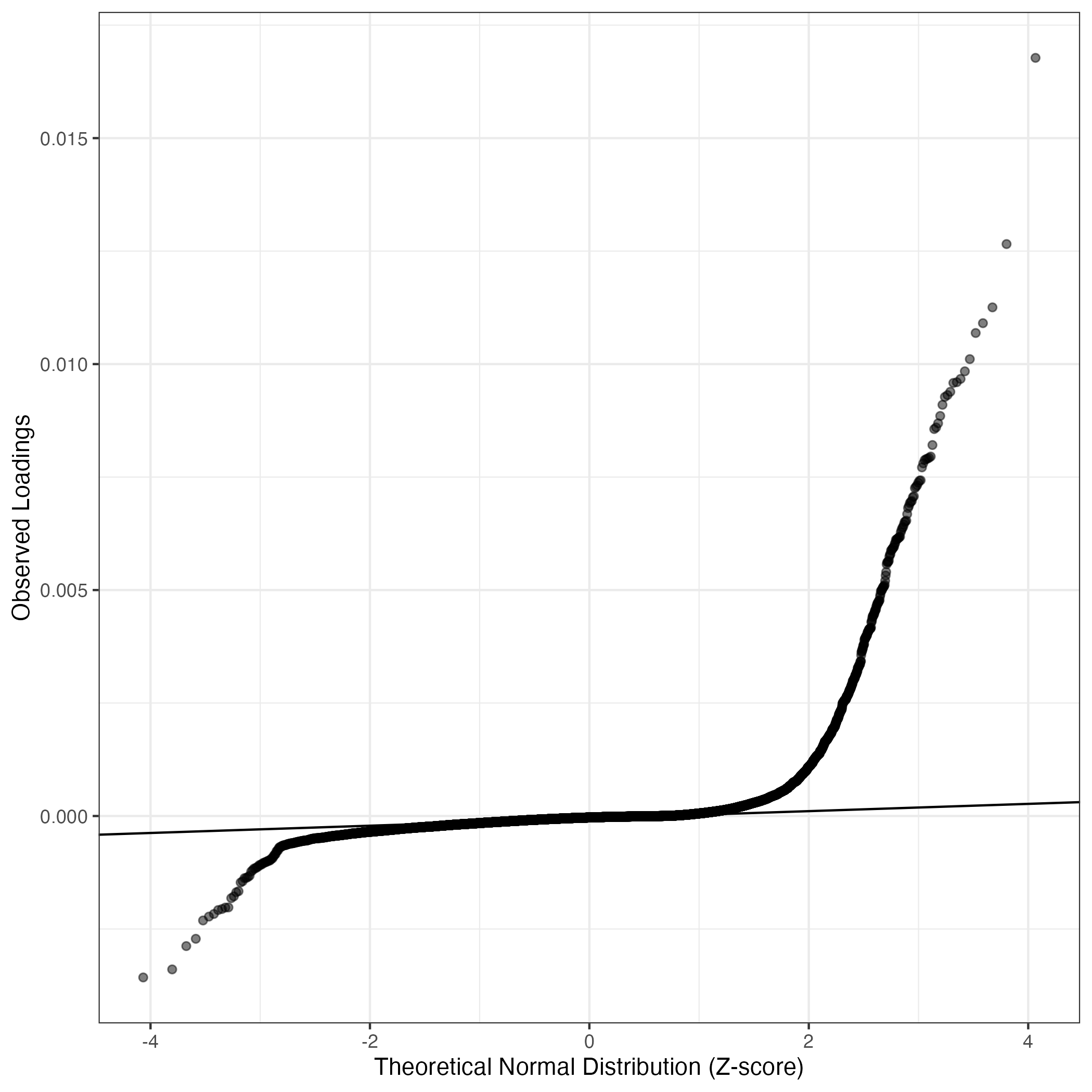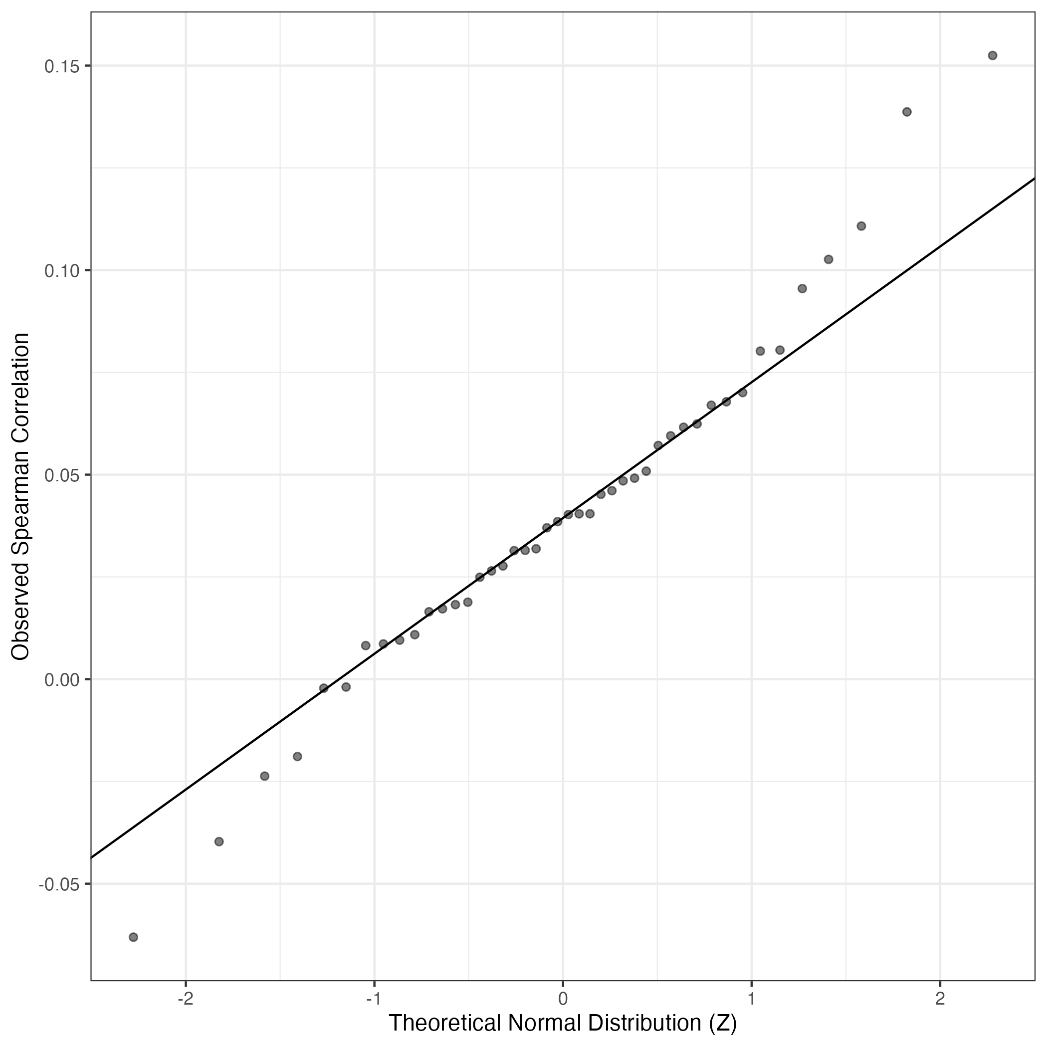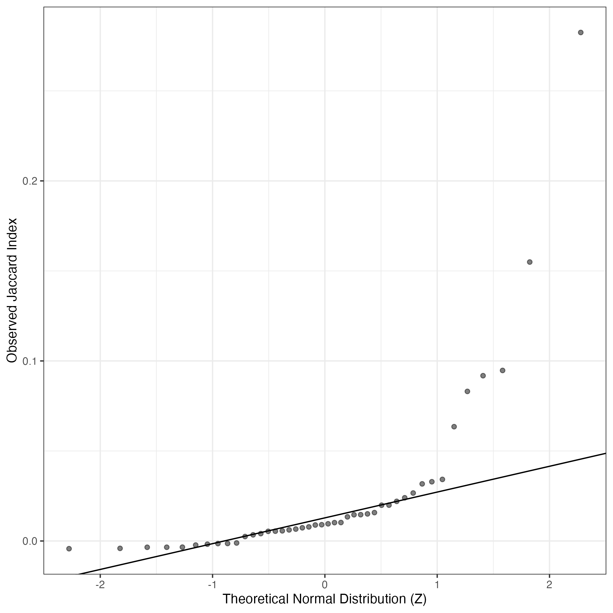 A similar QQ-plot as above, but only for instances where the H value is e.g. > 25, i.e. we are confident that the expression program is active above noise. Agreemenet between these binary vectors is tested using the Jaccard Index, with the P-values calculated by an exact test: