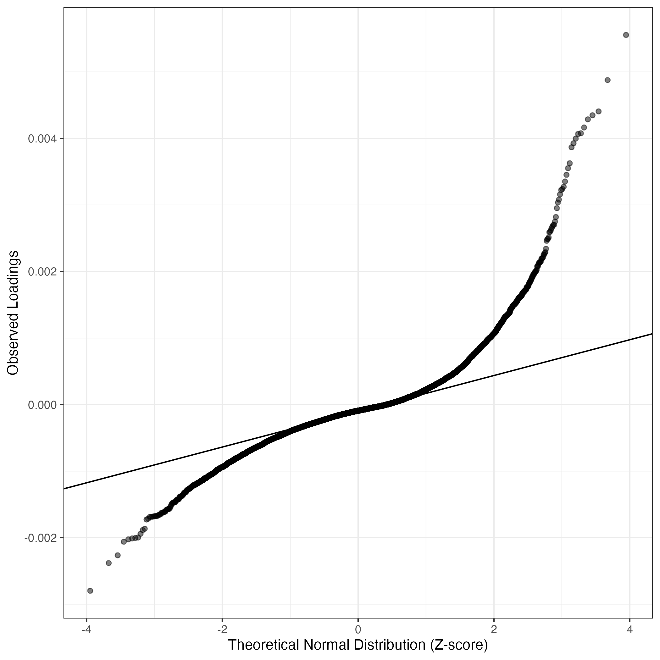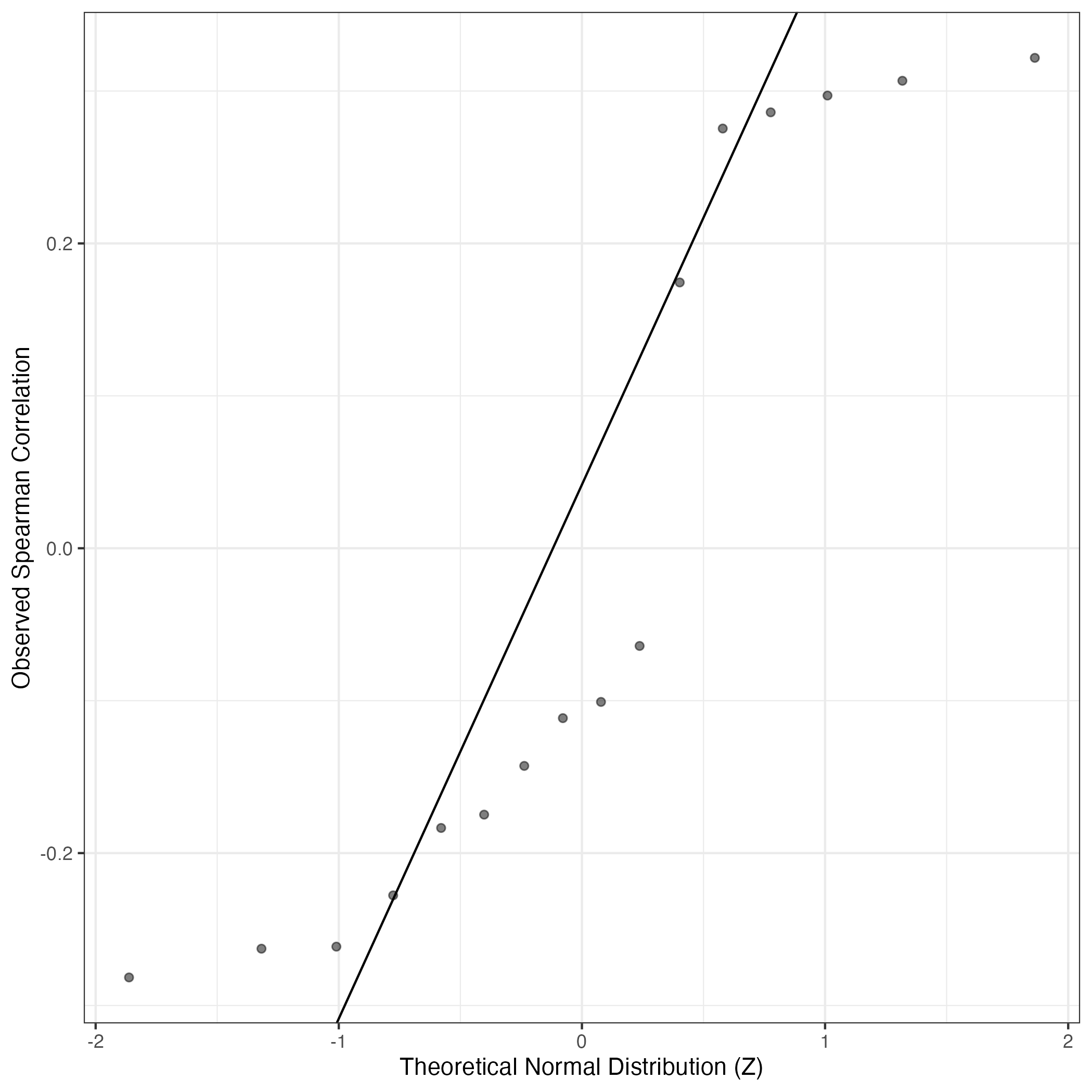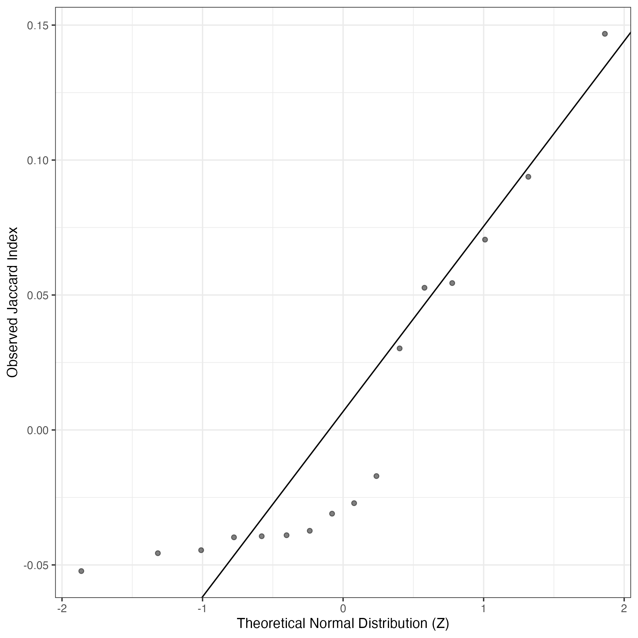 A similar QQ-plot as above, but only for instances where the H value is e.g. > 25, i.e. we are confident that the expression program is active above noise. Agreemenet between these binary vectors is tested using the Jaccard Index, with the P-values calculated by an exact test: