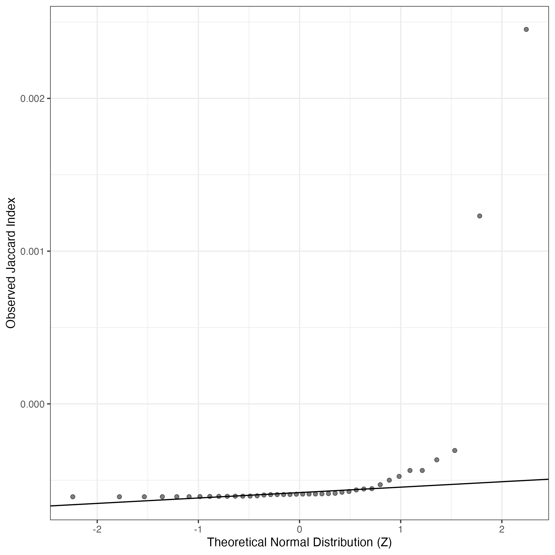 A similar QQ-plot as above, but only for instances where the H value is e.g. > 25, i.e. we are confident that the expression program is active above noise. Agreemenet between these binary vectors is tested using the Jaccard Index, with the P-values calculated by an exact test: