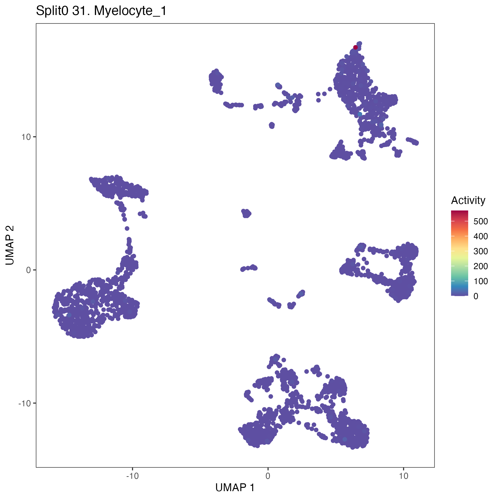 UMAP plots showing activity of gene expression program identified in GEP 31. Myelocyte: