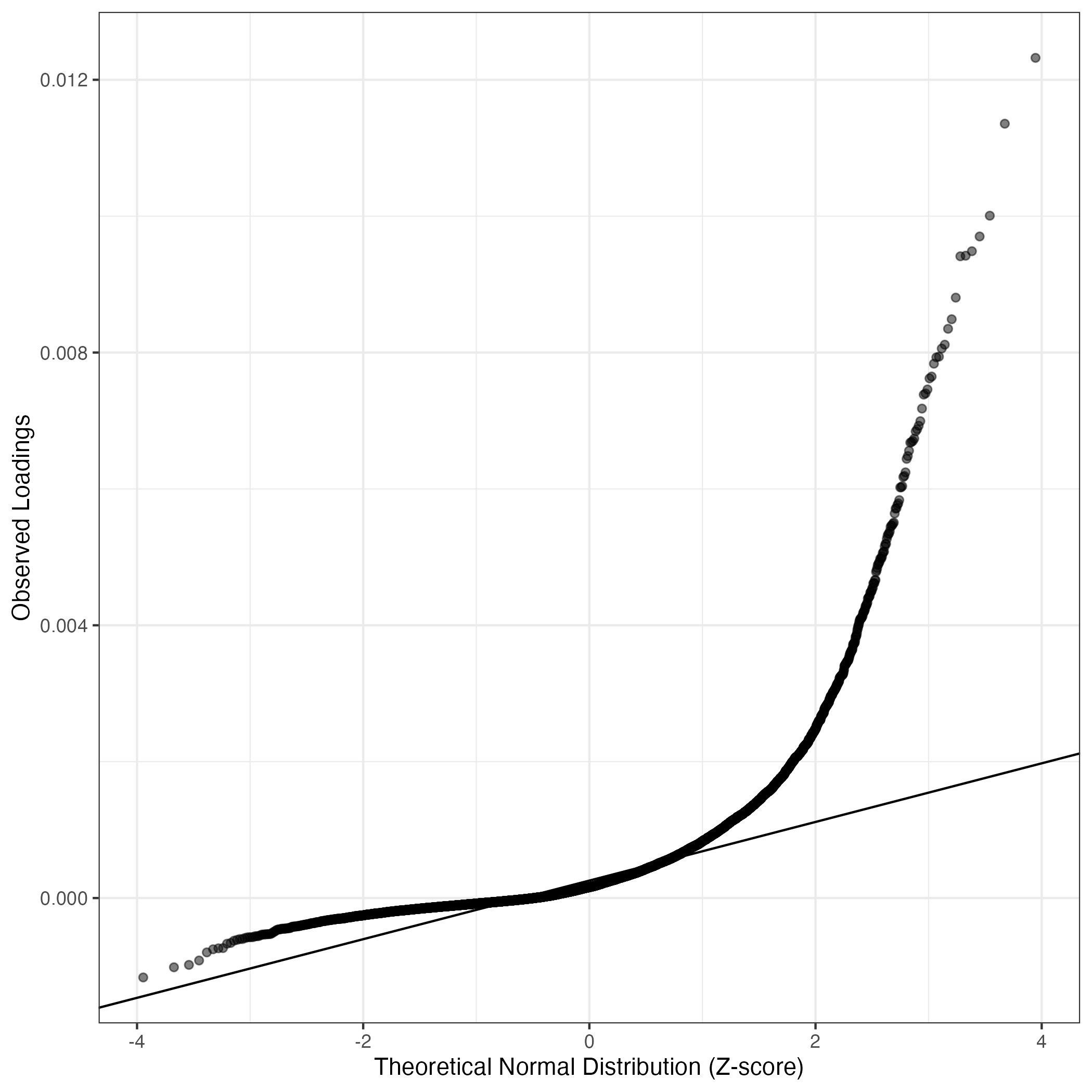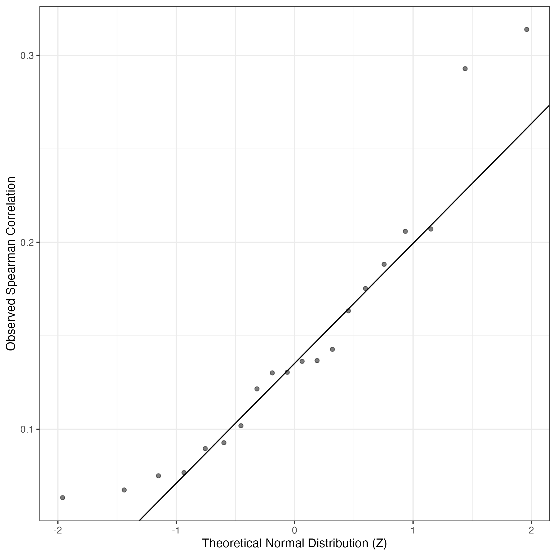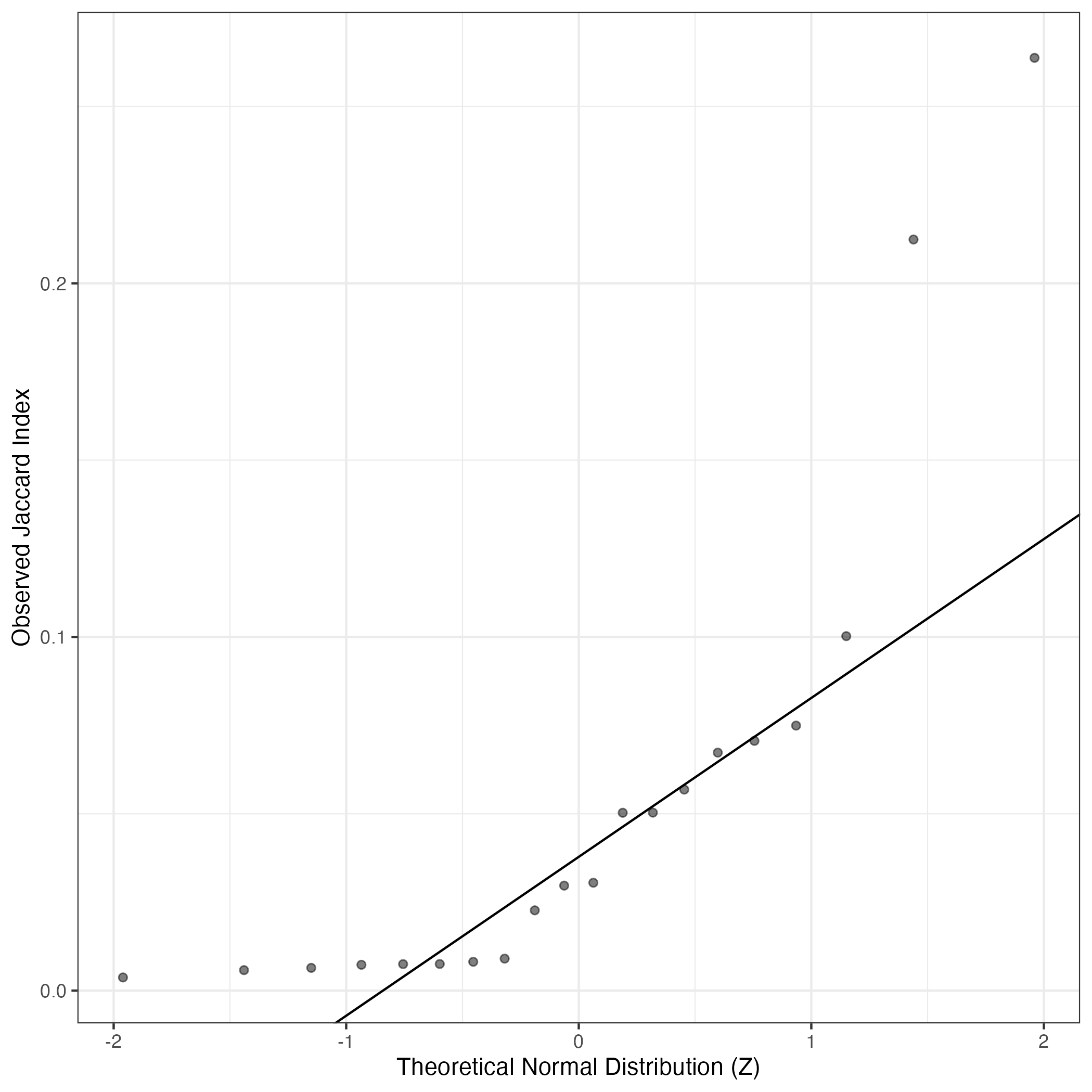A similar QQ-plot as above, but only for instances where the H value is e.g. > 25, i.e. we are confident that the expression program is active above noise. Agreemenet between these binary vectors is tested using the Jaccard Index, with the P-values calculated by an exact test: