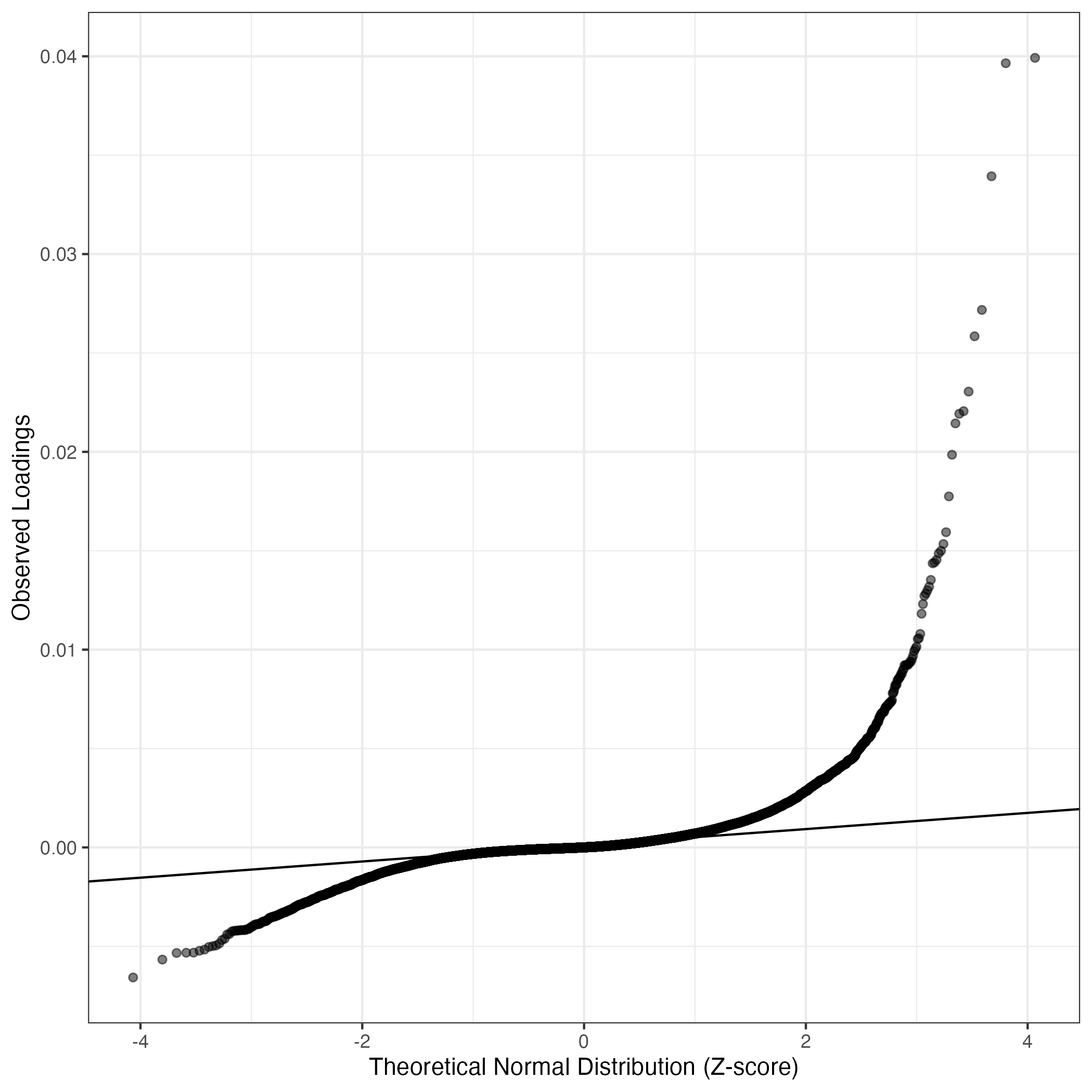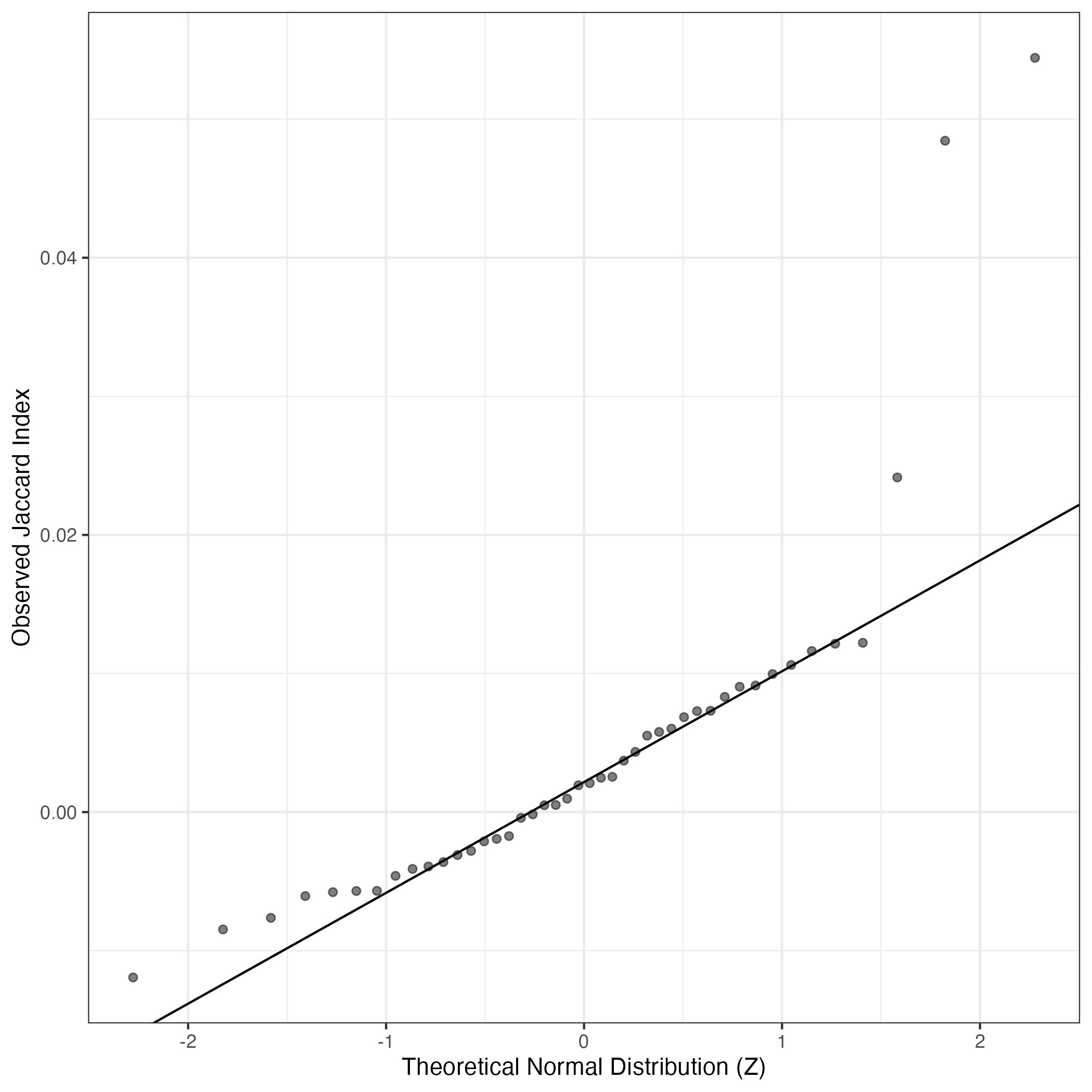 A similar QQ-plot as above, but only for instances where the H value is e.g. > 25, i.e. we are confident that the expression program is active above noise. Agreemenet between these binary vectors is tested using the Jaccard Index, with the P-values calculated by an exact test: