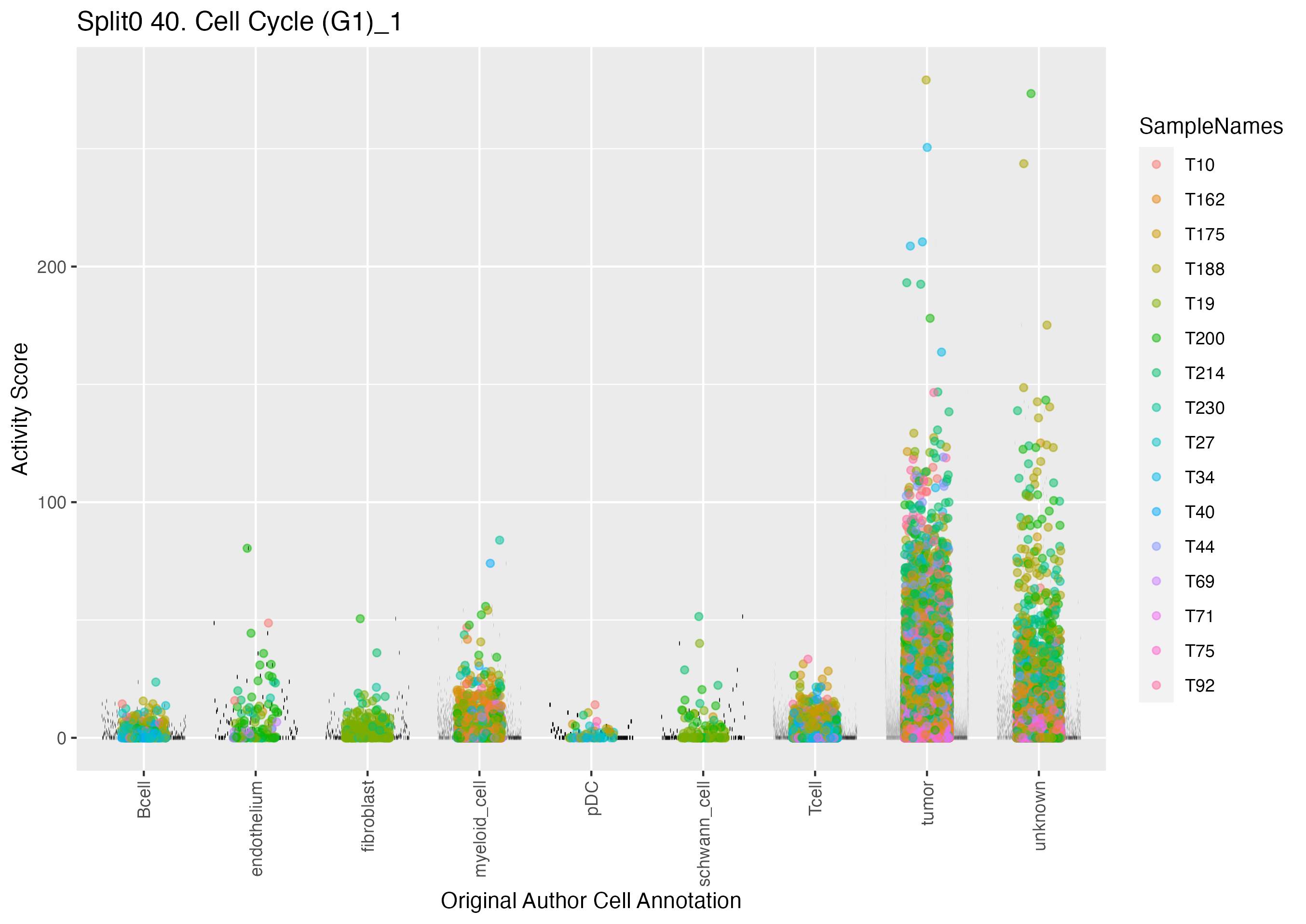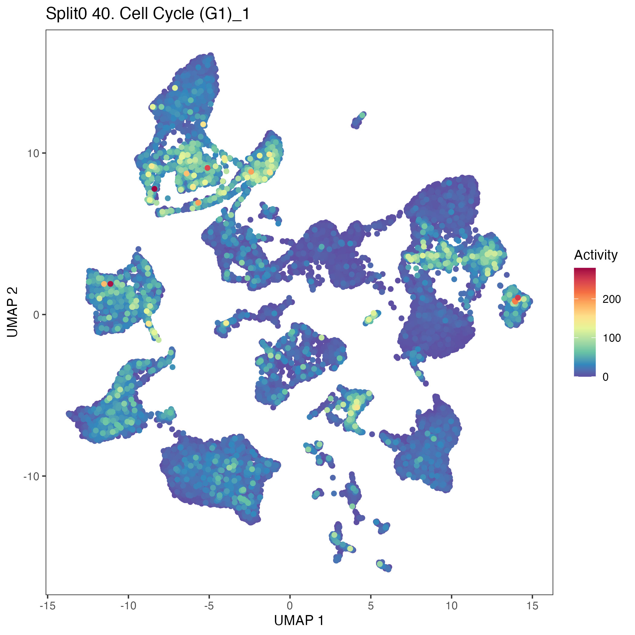 UMAP plots showing activity of gene expression program identified in GEP 40. Cell Cycle (G1):