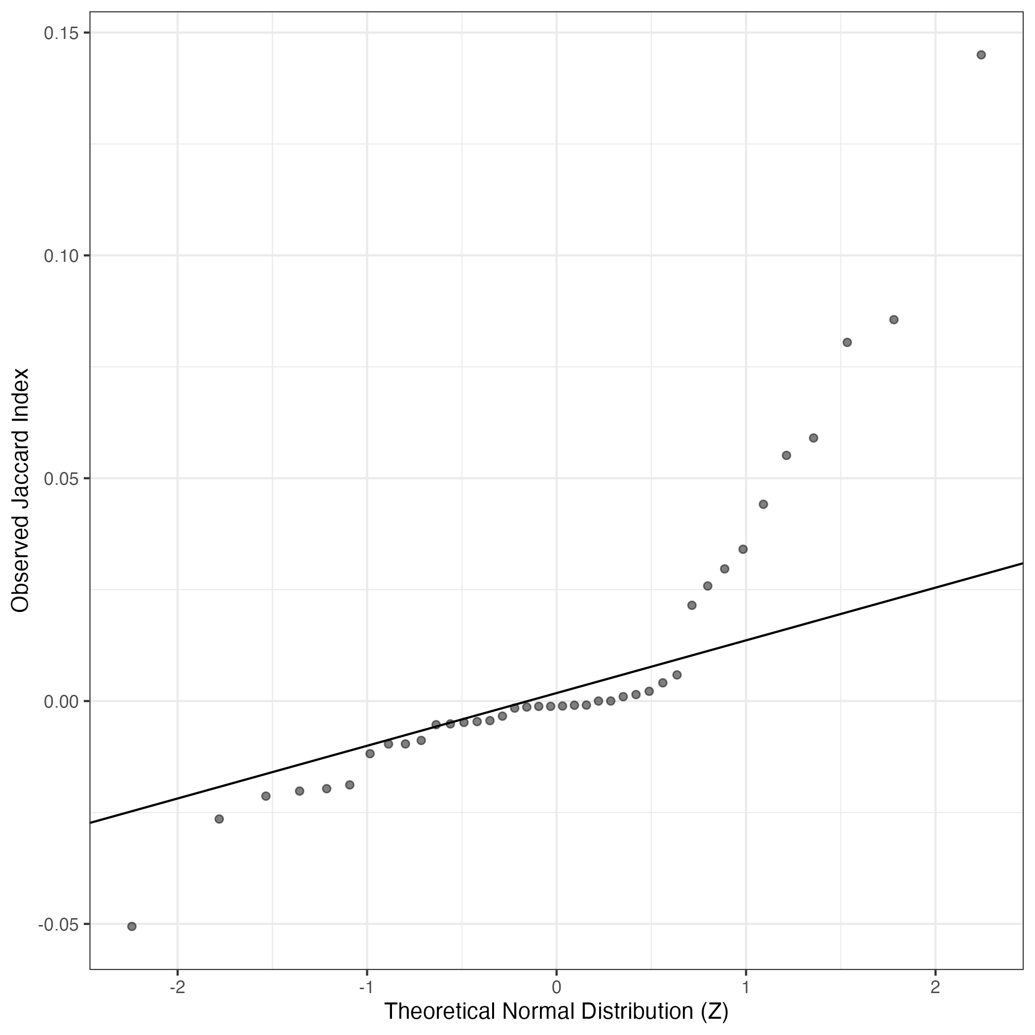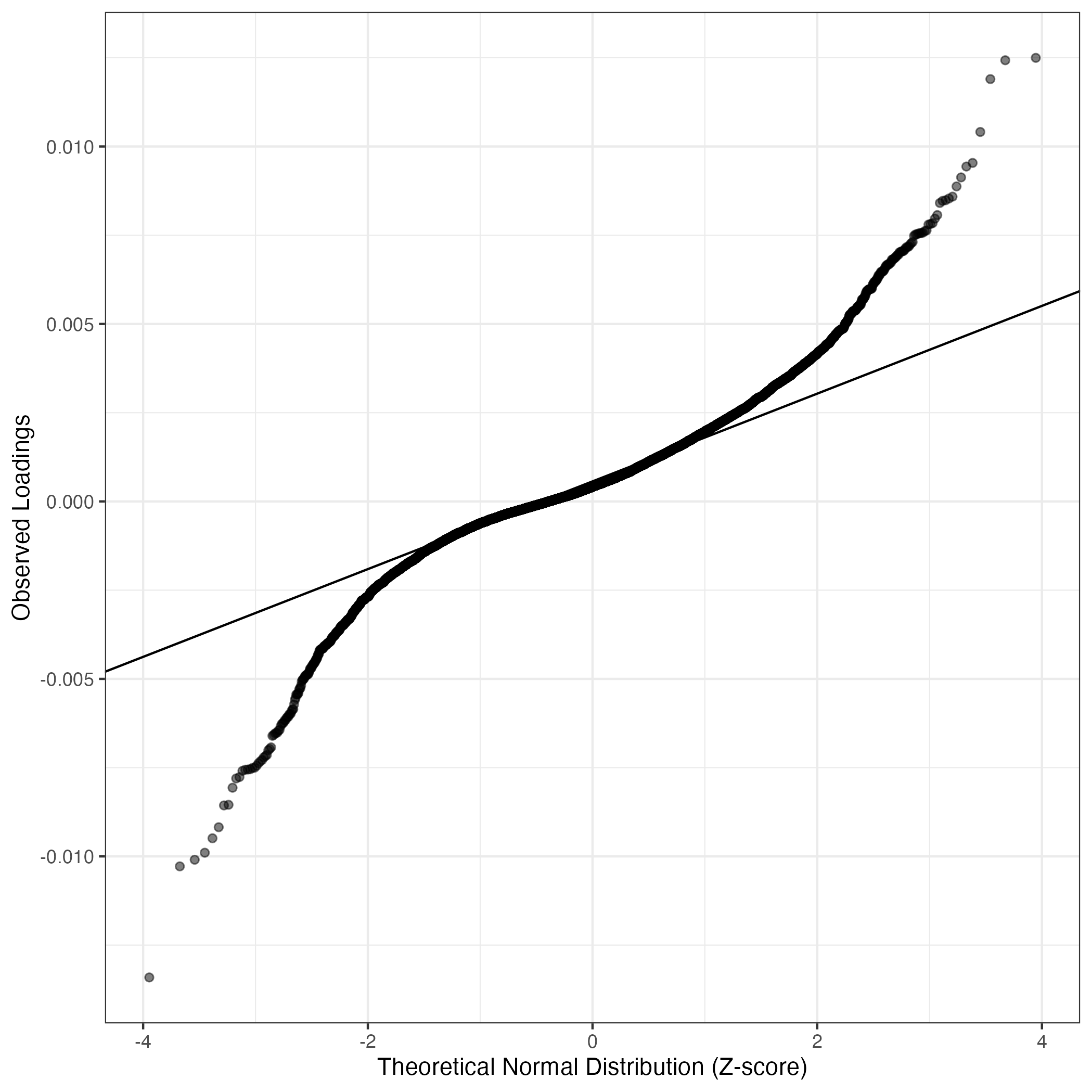 QQ-plot of gene loadings, averaged over both independent splits of the data