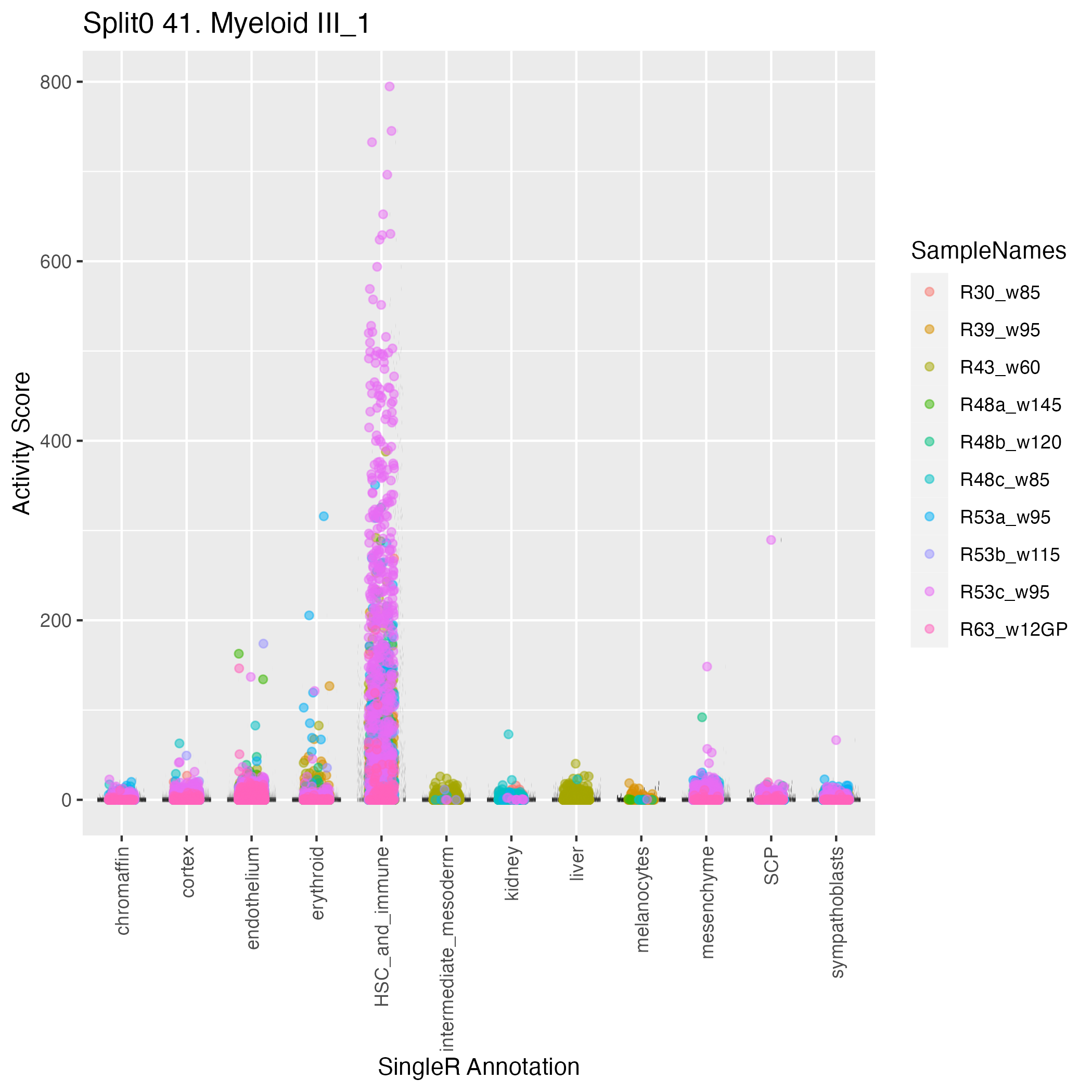 Erythroid: Early erythroid (curated markers) early erythroid cells which are committed to erythroid lineage cells: Wilcoxon ranksum test P-value for gene set overrepresentation: 9.27e-01 Mean rank of genes in gene set: 19144.33 Rank on gene expression program of genes in gene set: