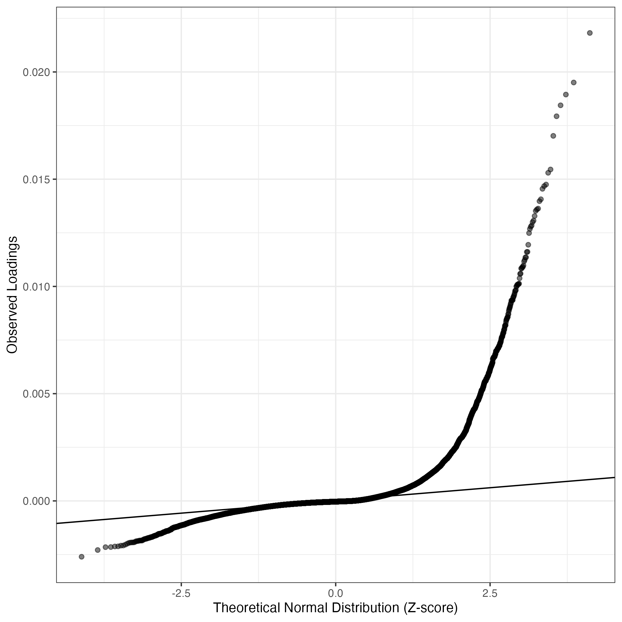A similar QQ-plot as above, but only for instances where the H value is e.g. > 25, i.e. we are confident that the expression program is active above noise. Agreemenet between these binary vectors is tested using the Jaccard Index, with the P-values calculated by an exact test: