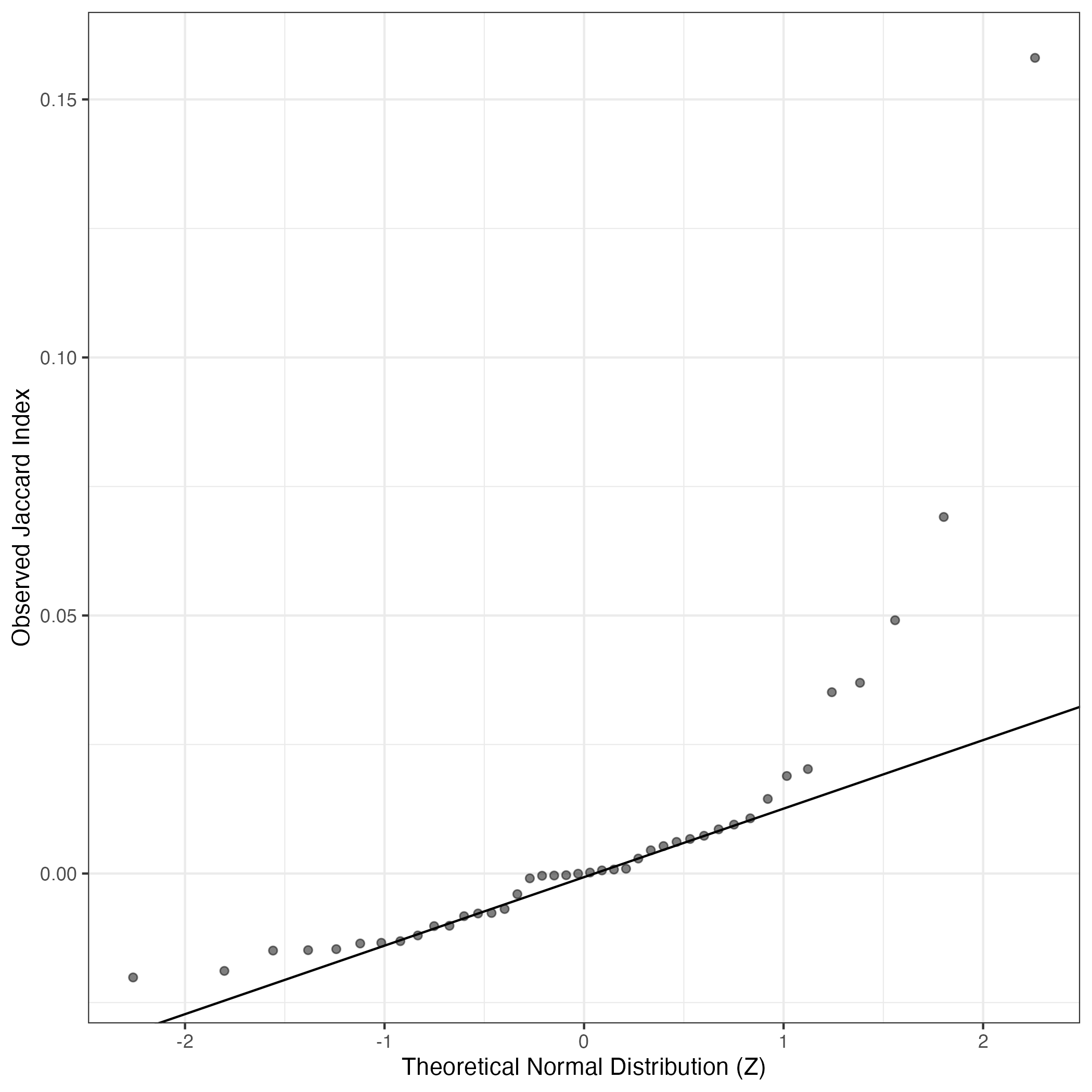 A similar QQ-plot as above, but only for instances where the H value is e.g. > 25, i.e. we are confident that the expression program is active above noise. Agreemenet between these binary vectors is tested using the Jaccard Index, with the P-values calculated by an exact test: