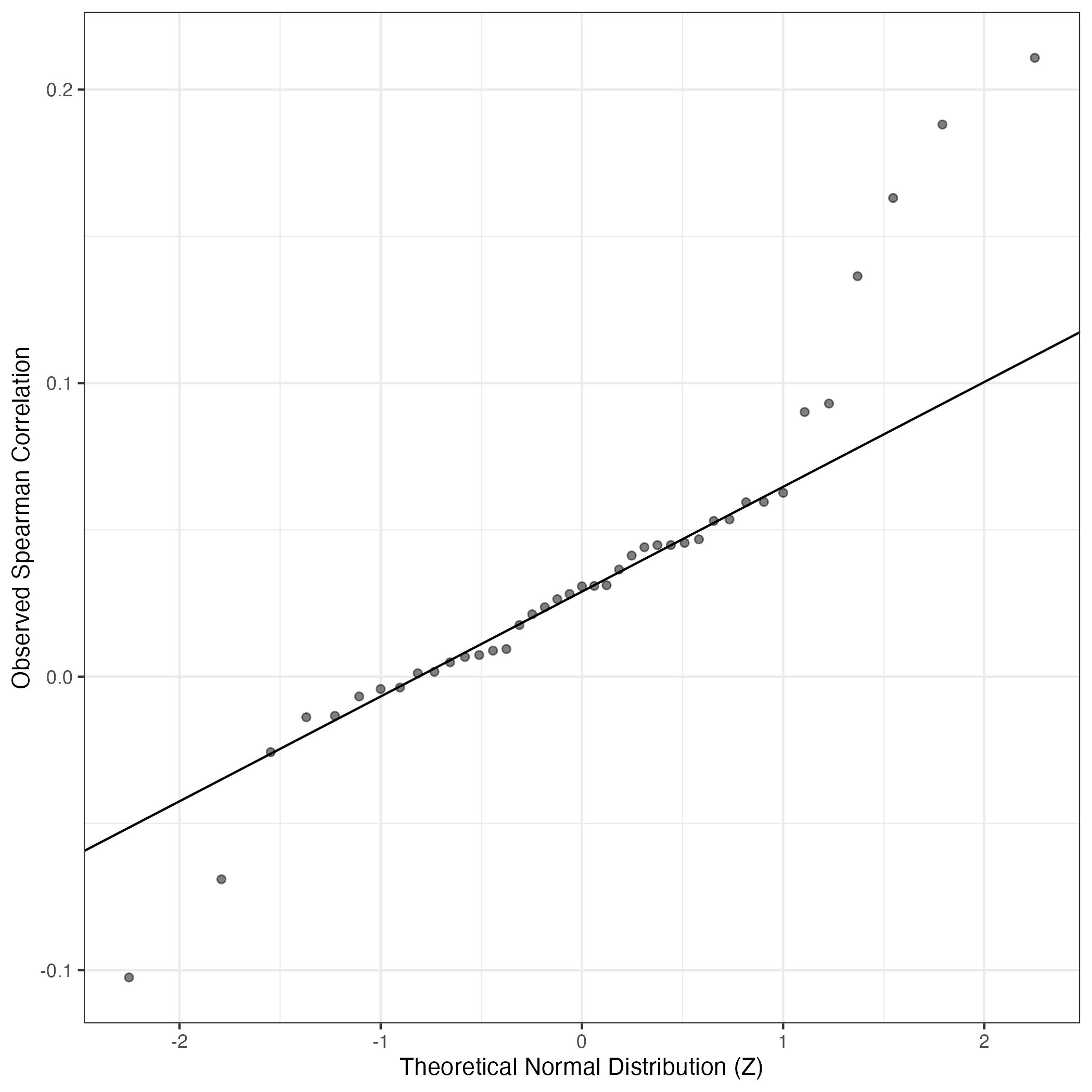 A similar QQ-plot as above, but only for instances where the H value is e.g. > 25, i.e. we are confident that the expression program is active above noise. Agreemenet between these binary vectors is tested using the Jaccard Index, with the P-values calculated by an exact test: