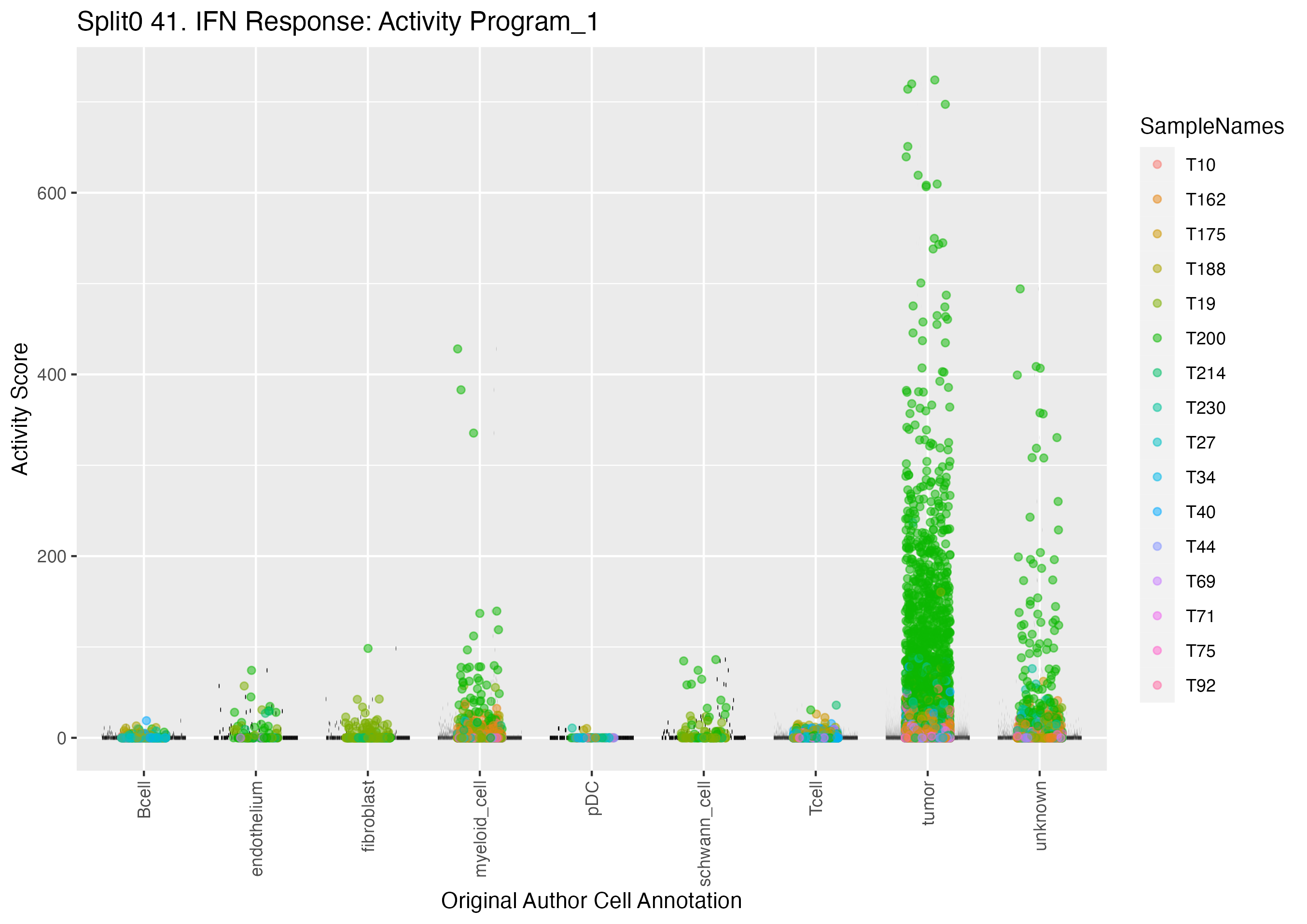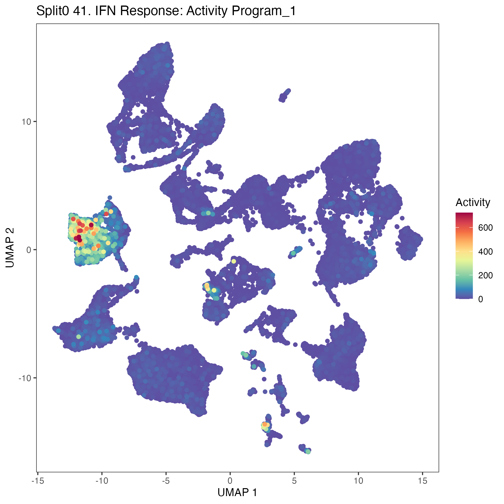UMAP plots showing activity of gene expression program identified in GEP 41. IFN Response: Activity Program: