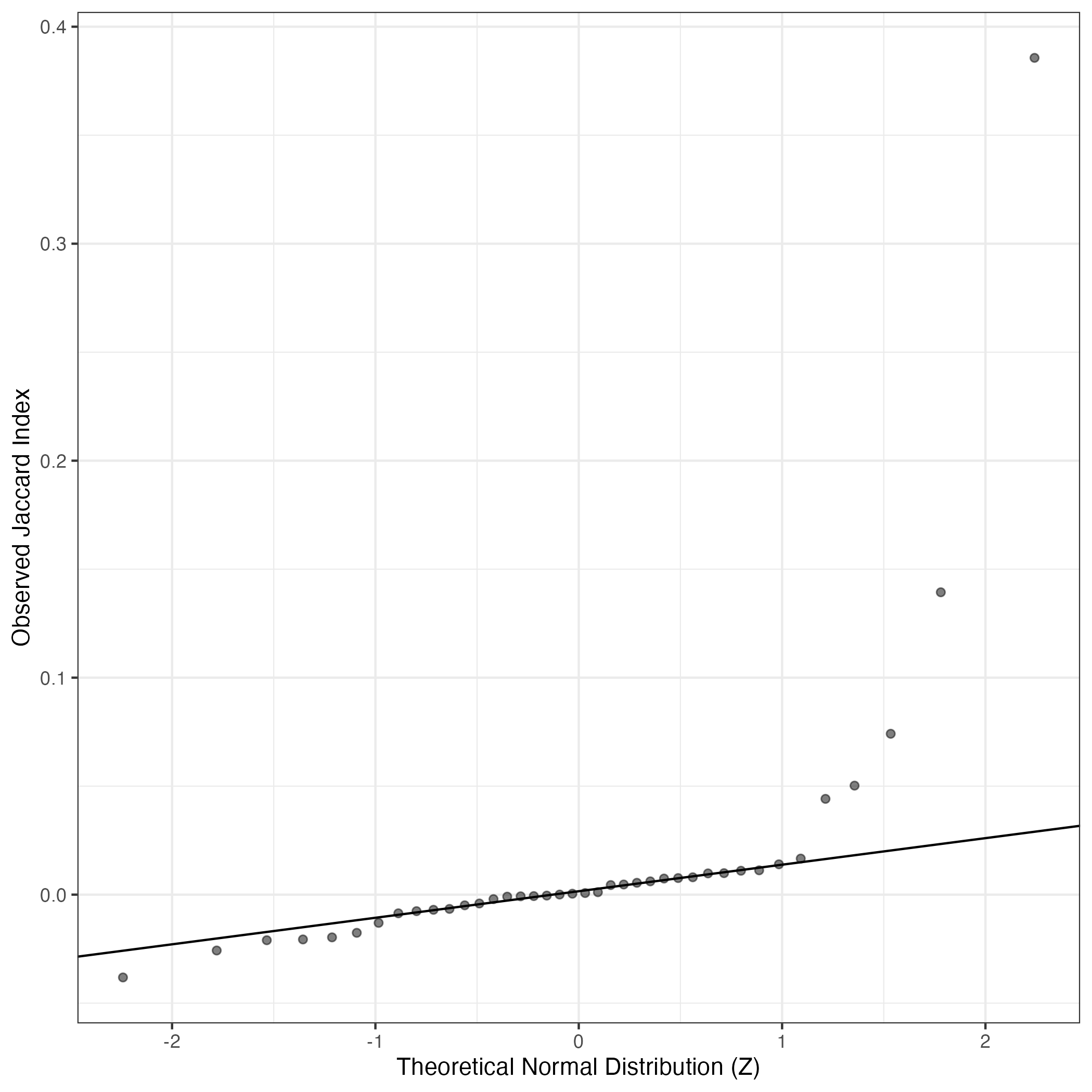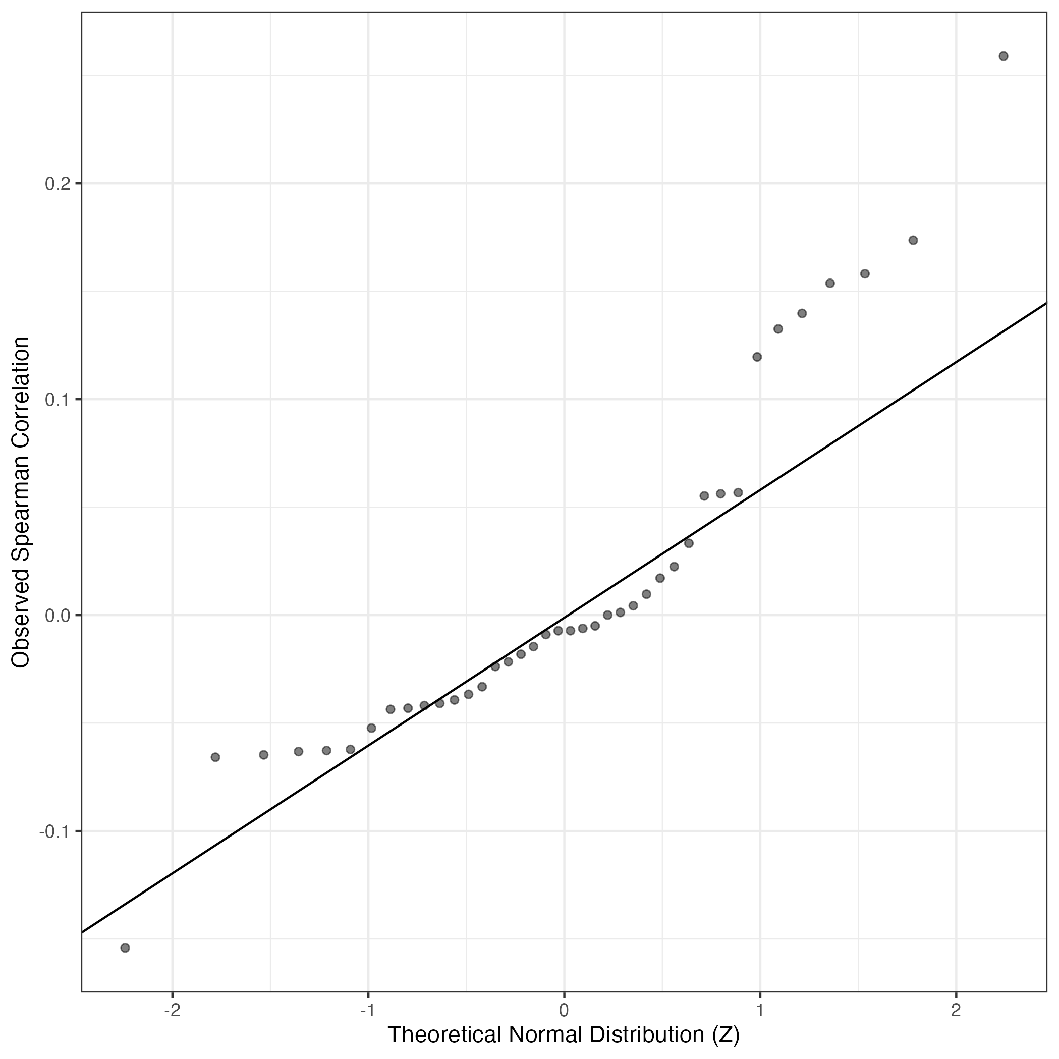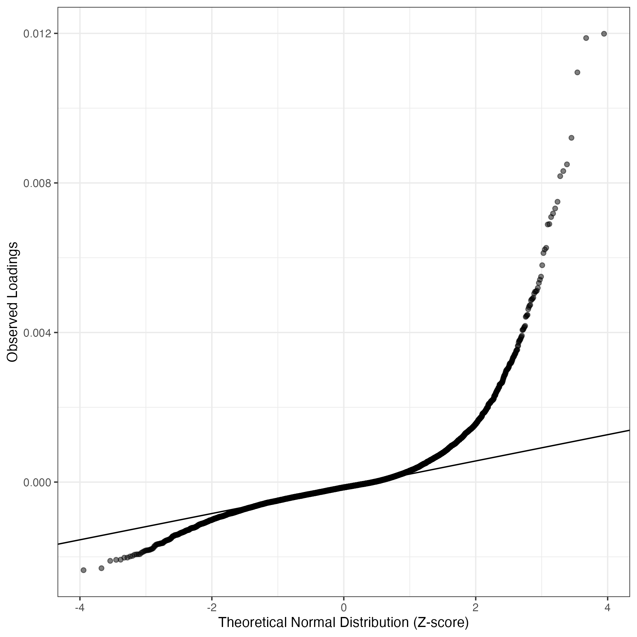 QQ-plot of gene loadings, averaged over both independent splits of the data