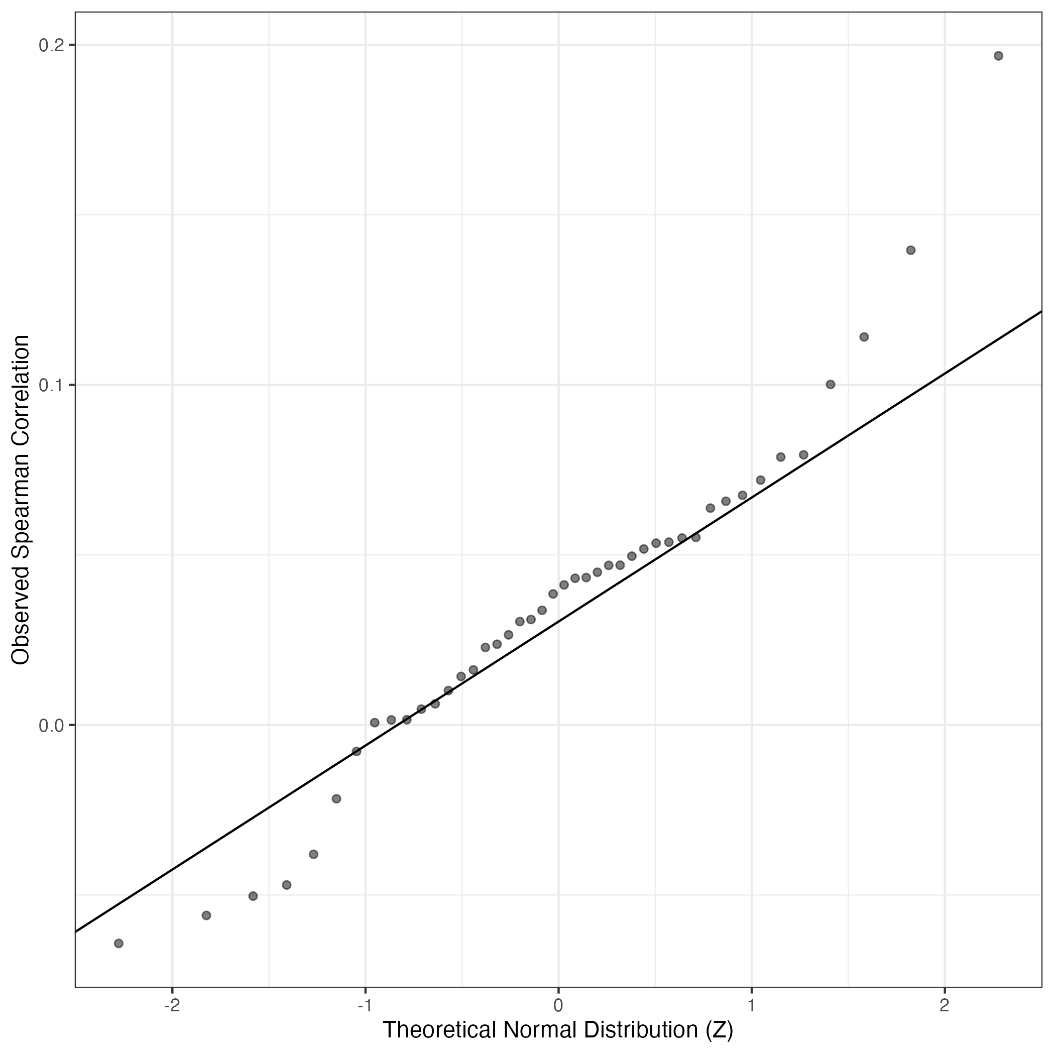 A similar QQ-plot as above, but only for instances where the H value is e.g. > 25, i.e. we are confident that the expression program is active above noise. Agreemenet between these binary vectors is tested using the Jaccard Index, with the P-values calculated by an exact test: