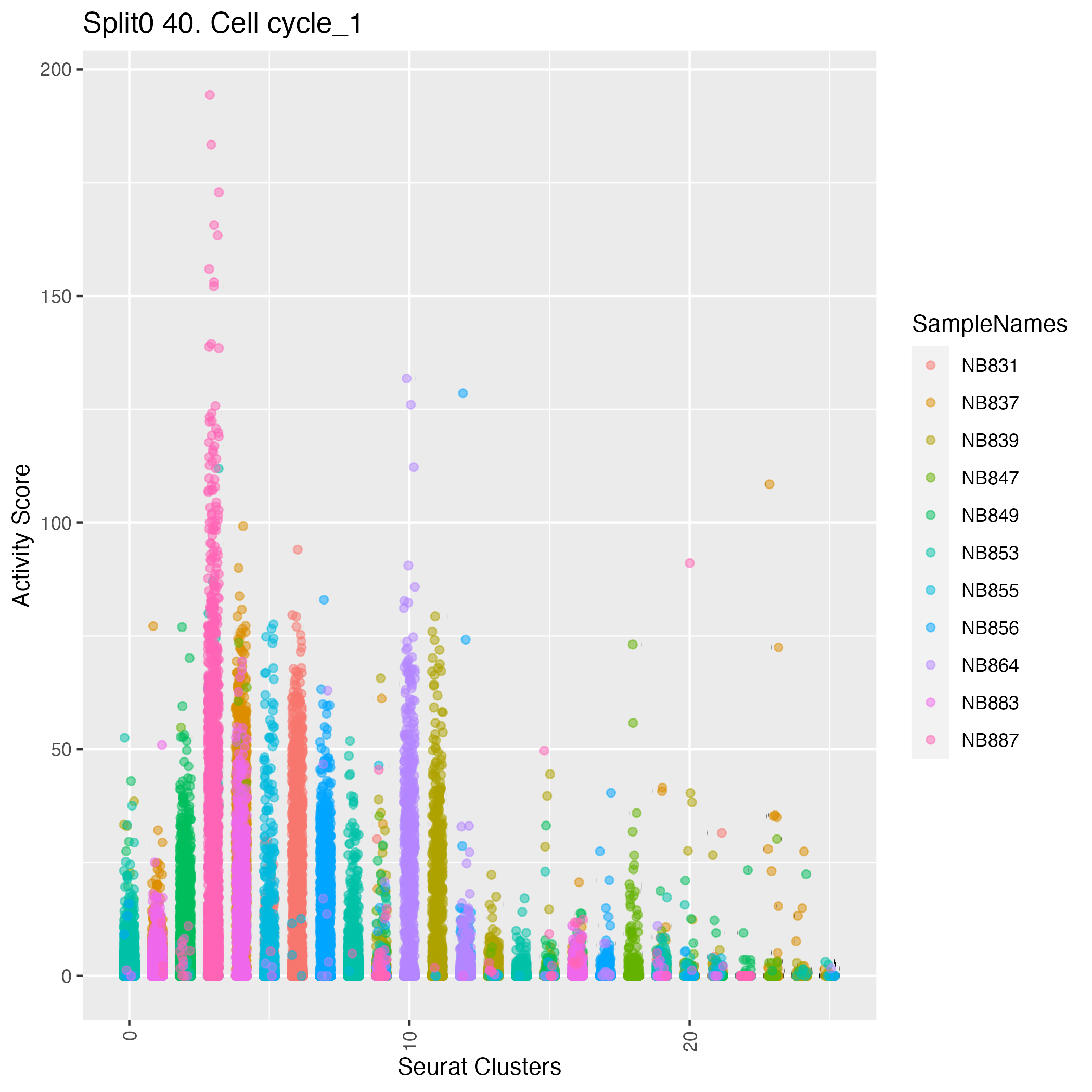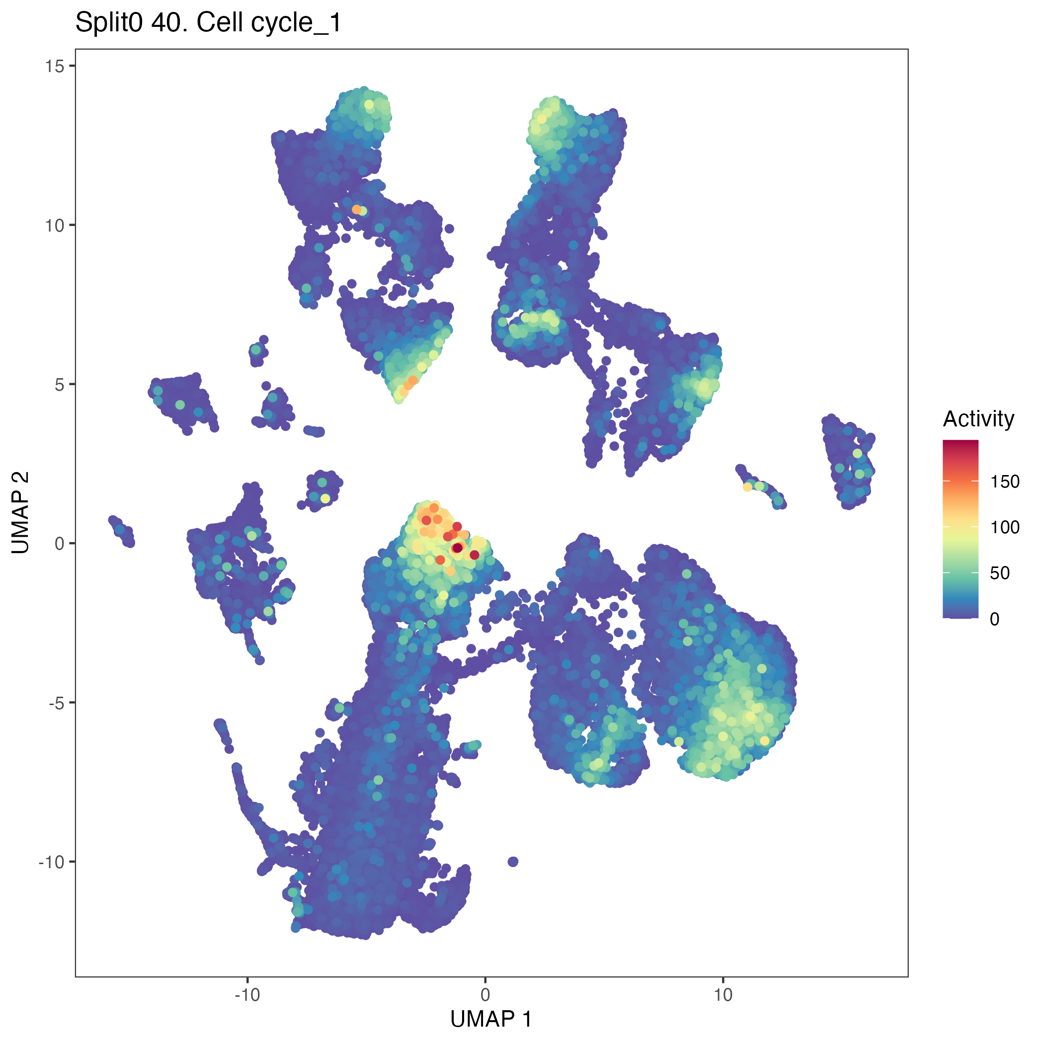 Cycling cells: Cycling T cells (model markers) proliferating T lymphocytes: Wilcoxon ranksum test P-value for gene set overrepresentation: 7.19e-01 Mean rank of genes in gene set: 12043.4 Rank on gene expression program of genes in gene set:
