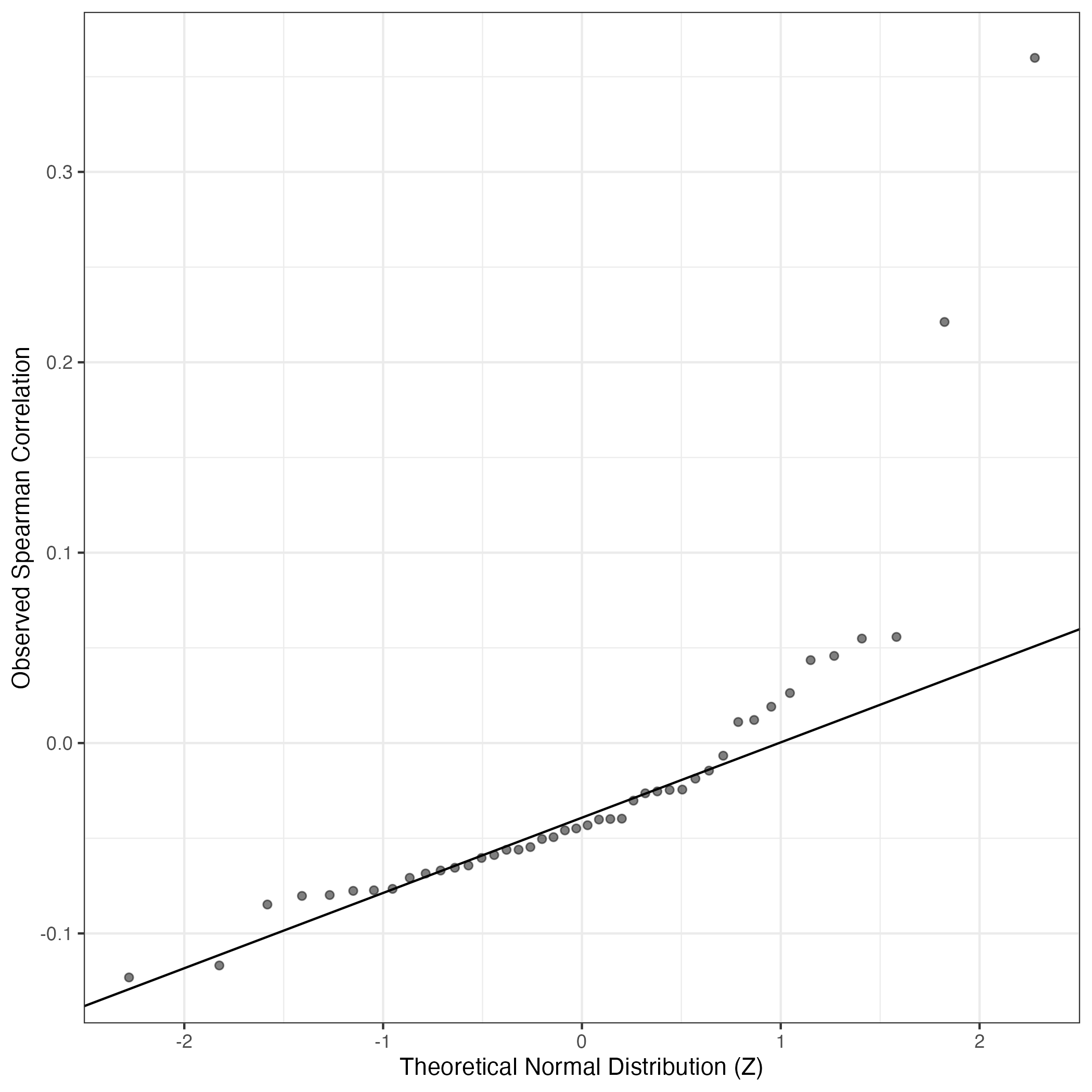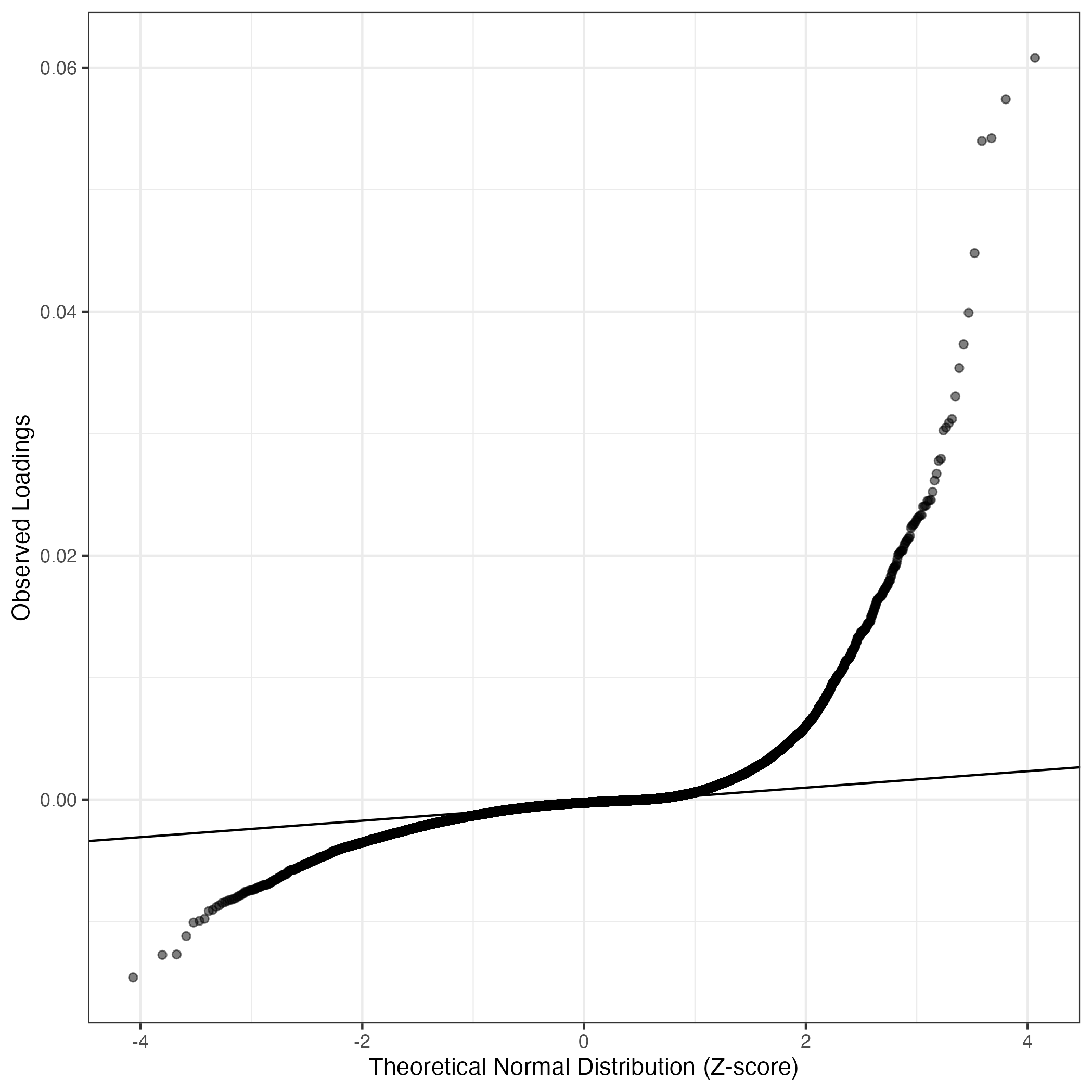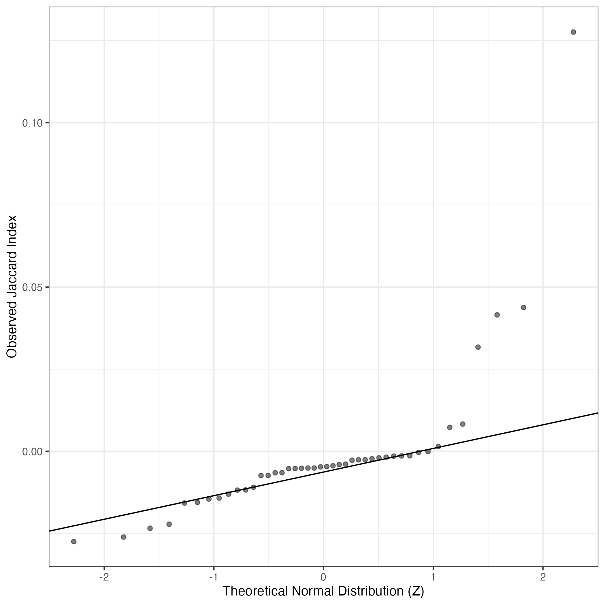 A similar QQ-plot as above, but only for instances where the H value is e.g. > 25, i.e. we are confident that the expression program is active above noise. Agreemenet between these binary vectors is tested using the Jaccard Index, with the P-values calculated by an exact test: