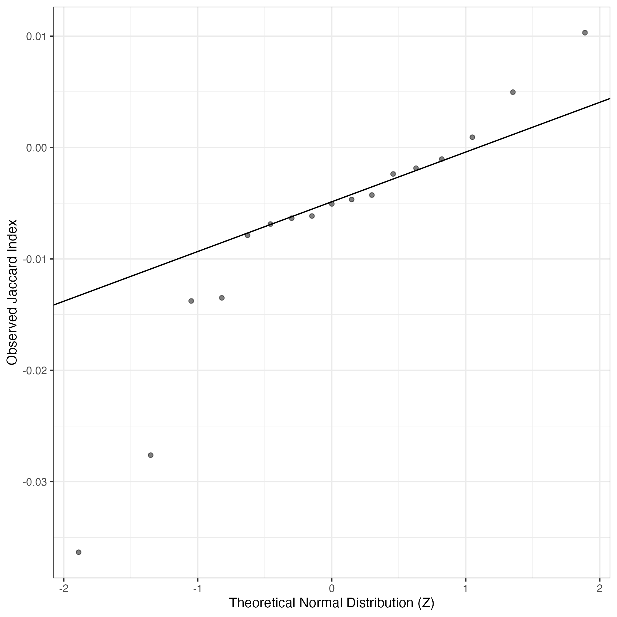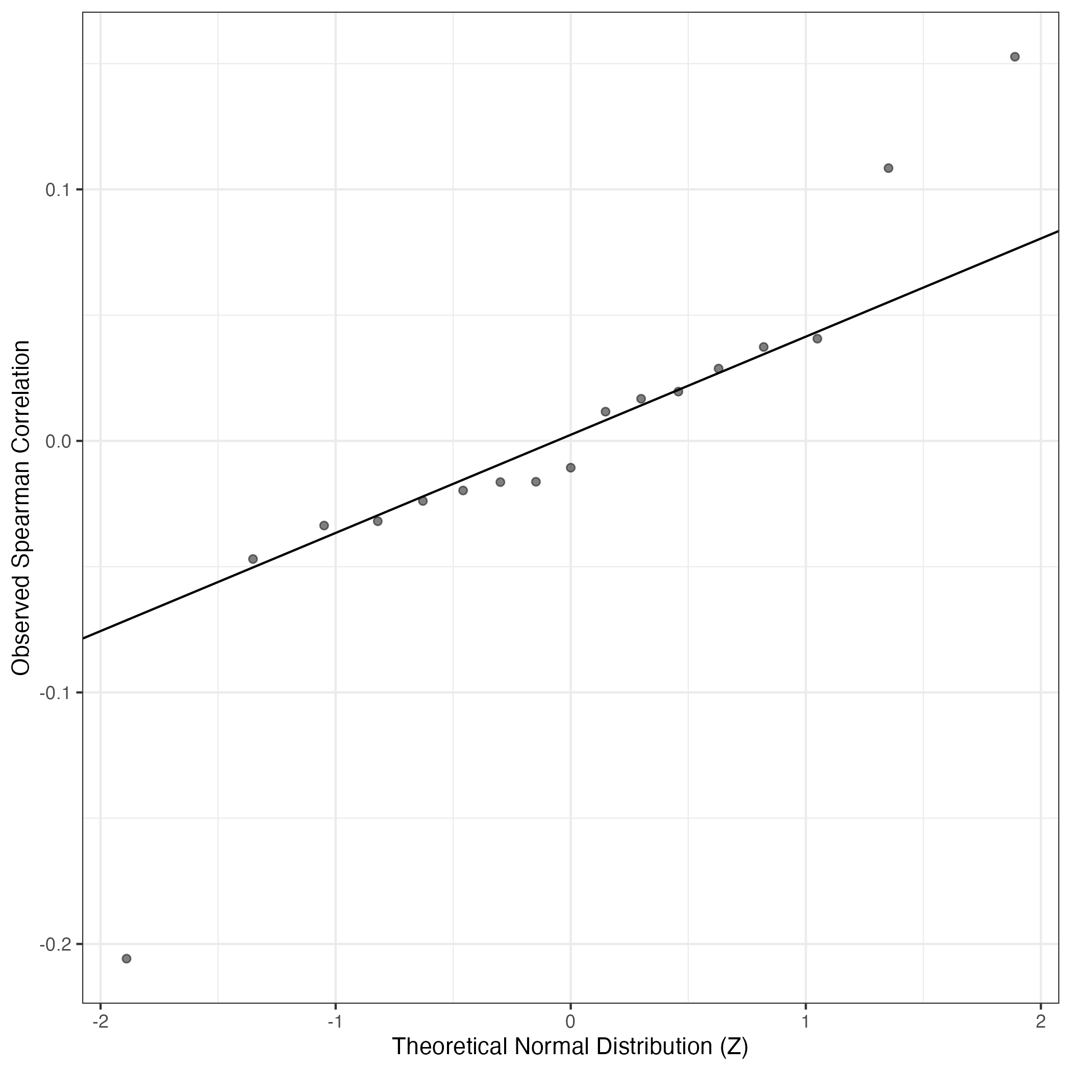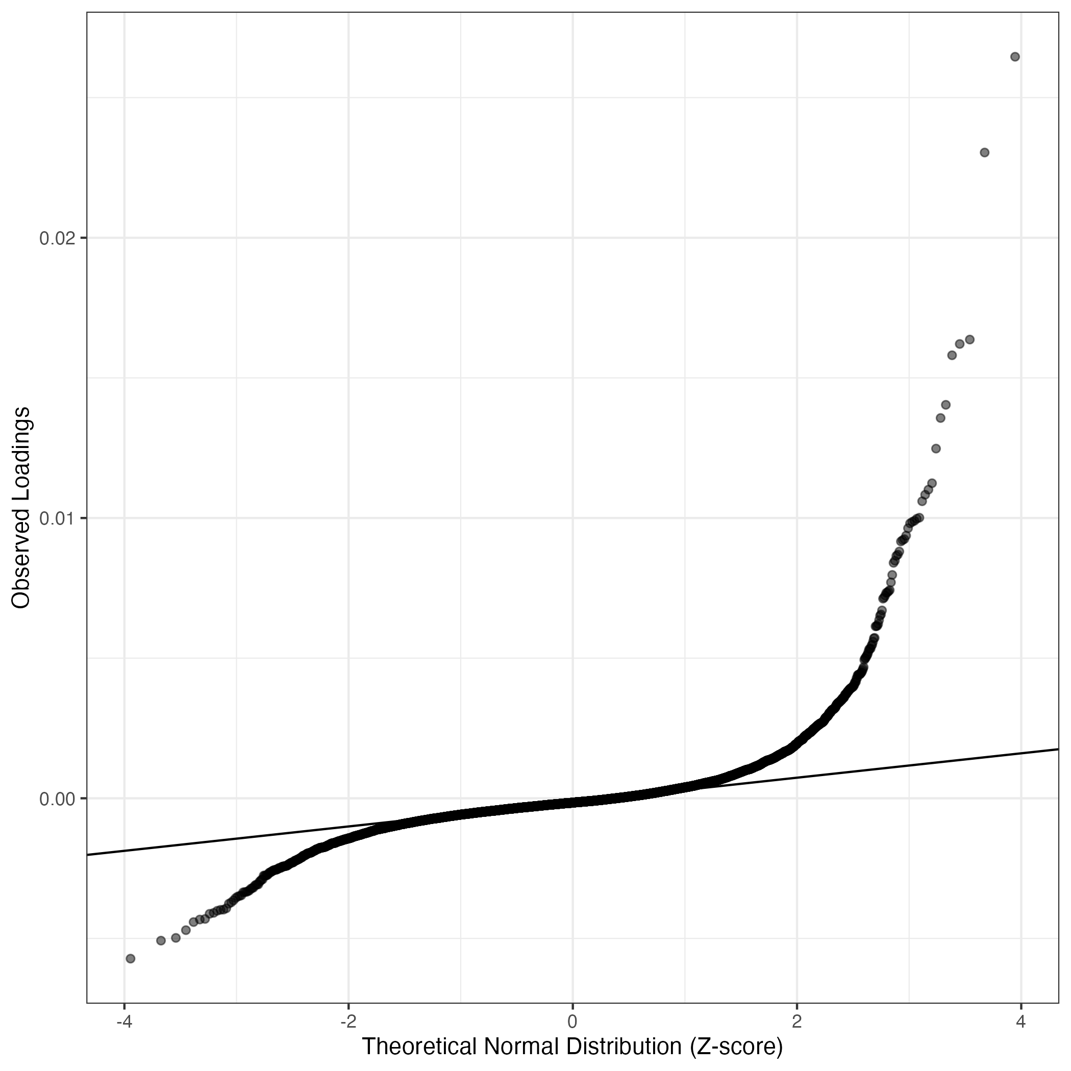 QQ-plot of gene loadings, averaged over both independent splits of the data
