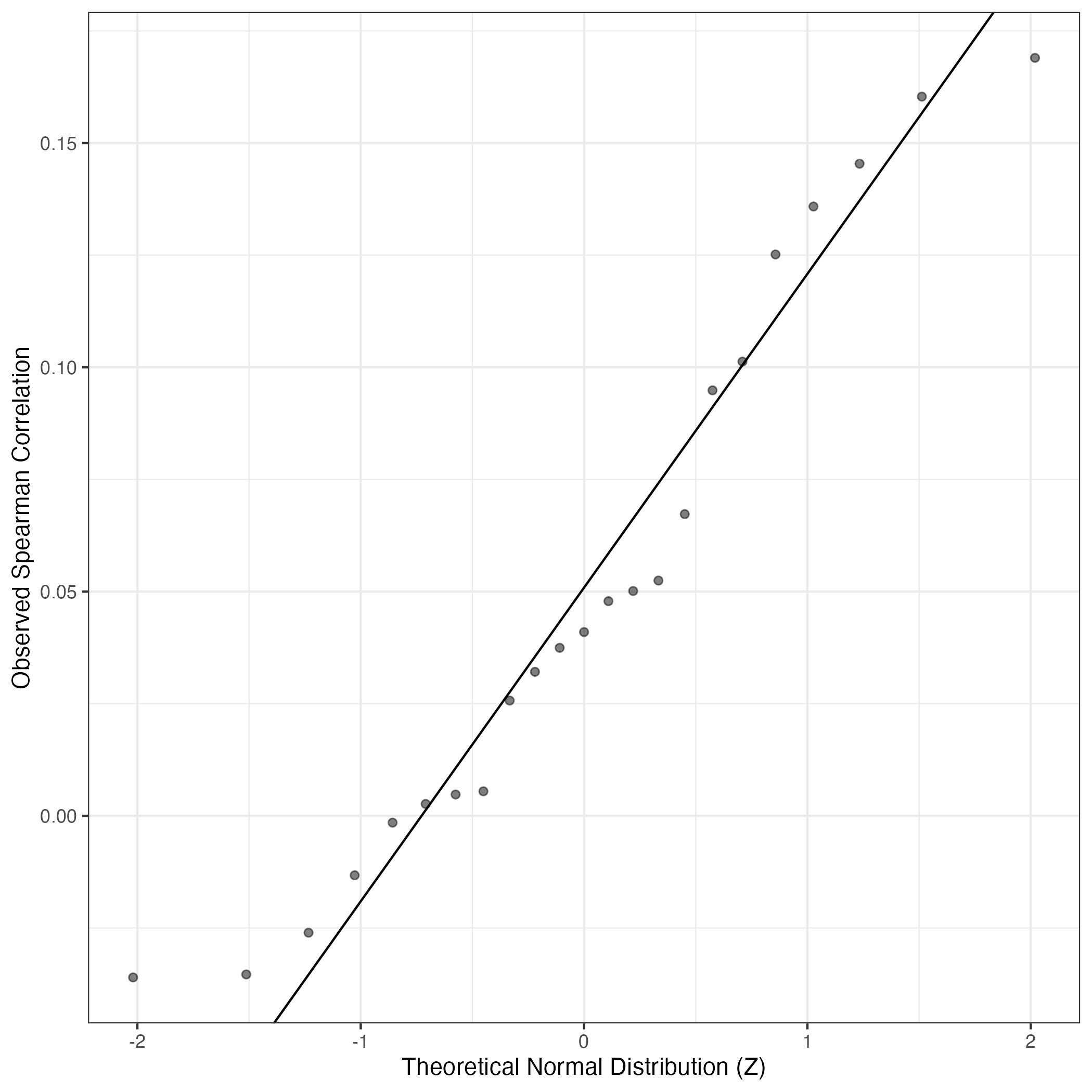 A similar QQ-plot as above, but only for instances where the H value is e.g. > 25, i.e. we are confident that the expression program is active above noise. Agreemenet between these binary vectors is tested using the Jaccard Index, with the P-values calculated by an exact test: