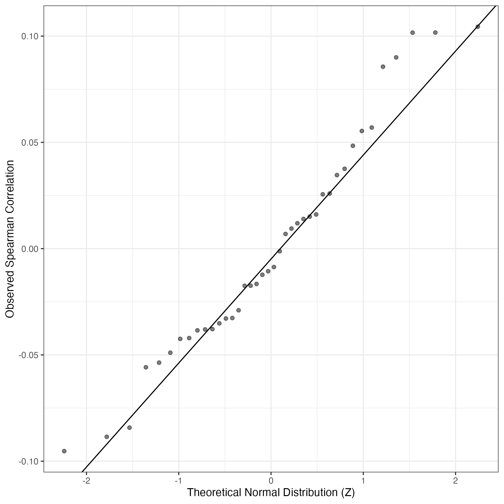 A similar QQ-plot as above, but only for instances where the H value is e.g. > 25, i.e. we are confident that the expression program is active above noise. Agreemenet between these binary vectors is tested using the Jaccard Index, with the P-values calculated by an exact test: