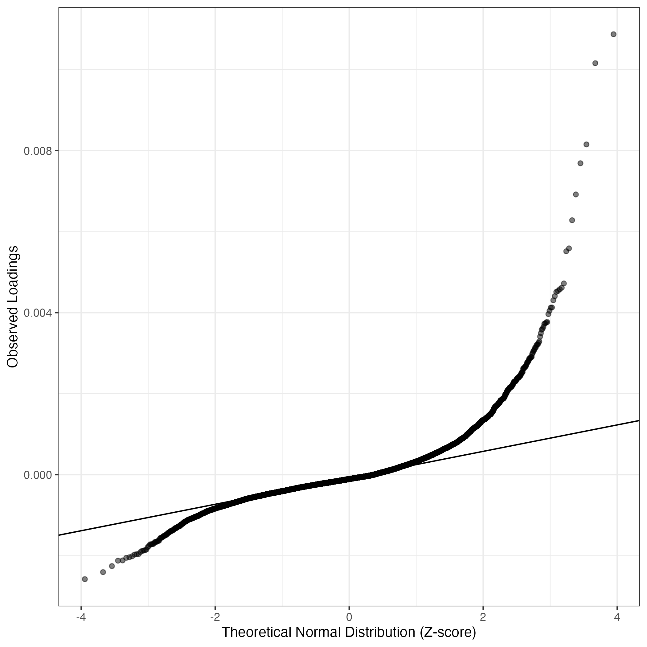 A similar QQ-plot as above, but only for instances where the H value is e.g. > 25, i.e. we are confident that the expression program is active above noise. Agreemenet between these binary vectors is tested using the Jaccard Index, with the P-values calculated by an exact test: