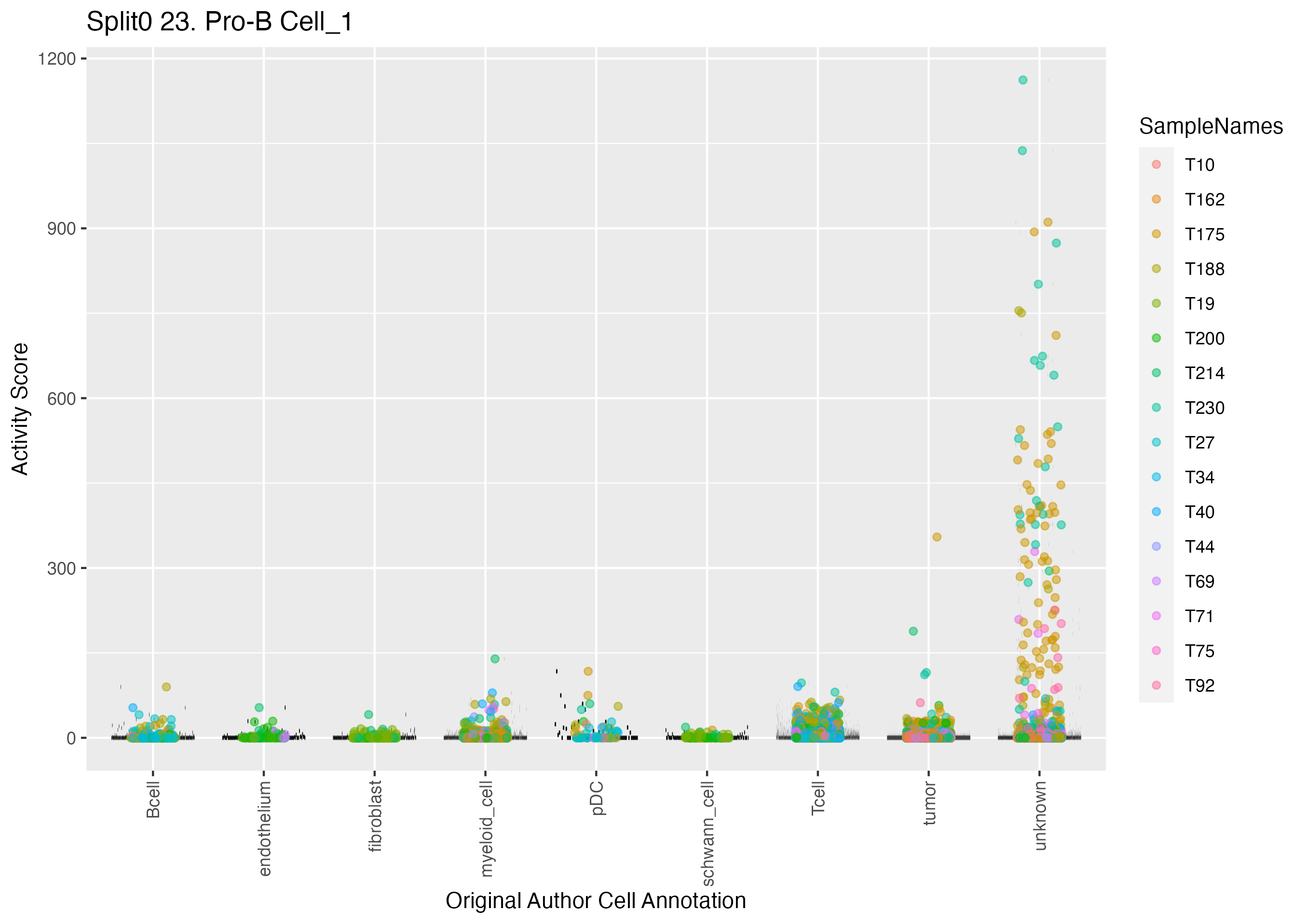 UMAP plots showing activity of gene expression program identified in GEP 23. Pro-B Cell: