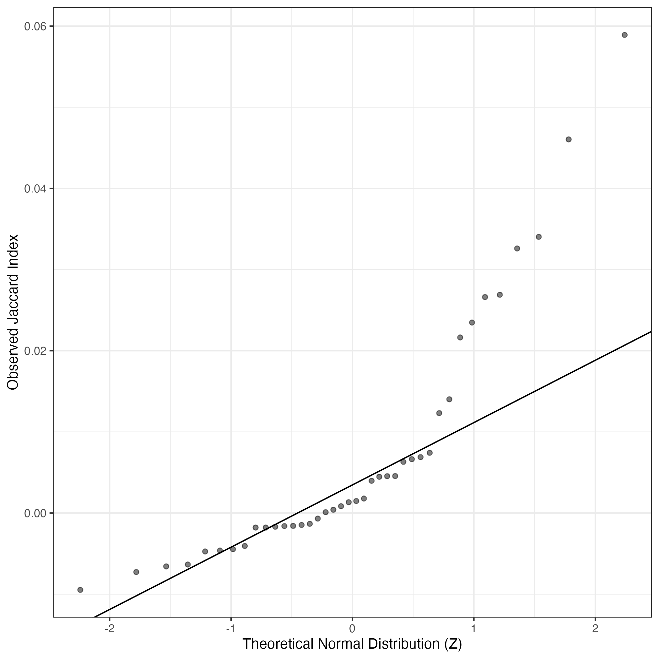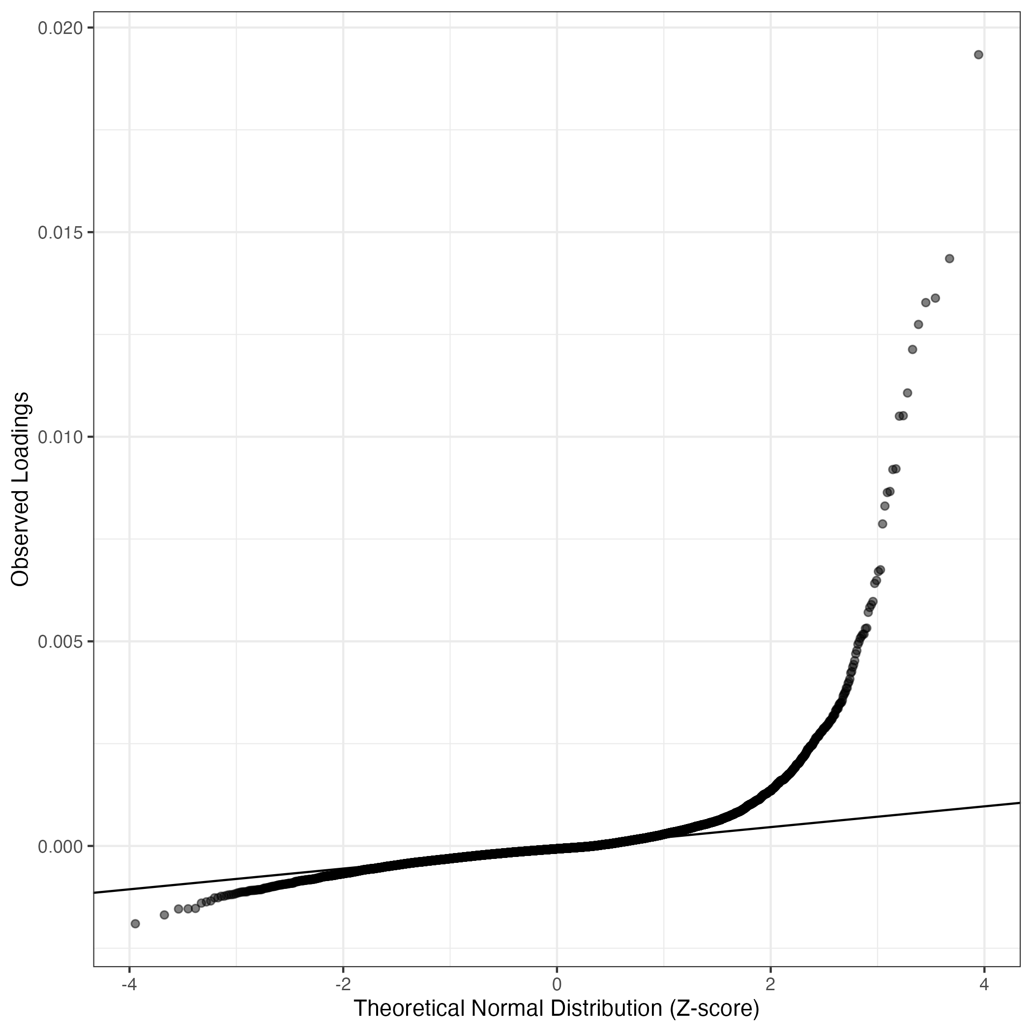 QQ-plot of gene loadings, averaged over both independent splits of the data