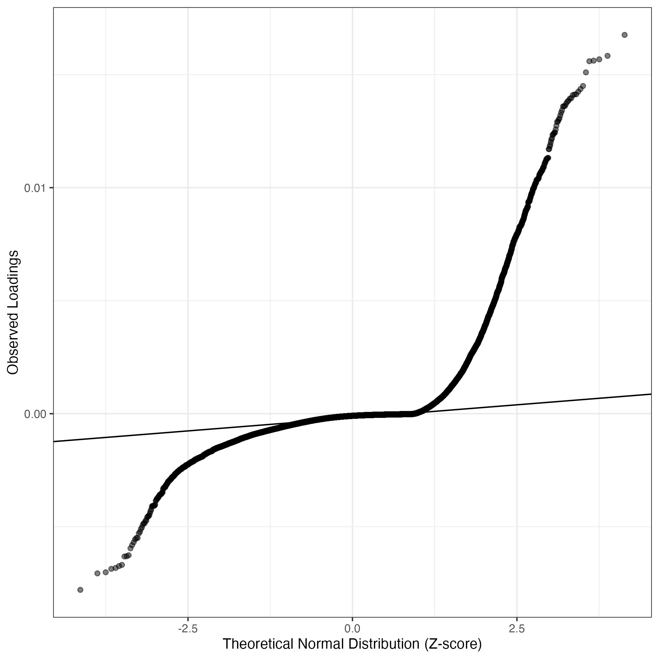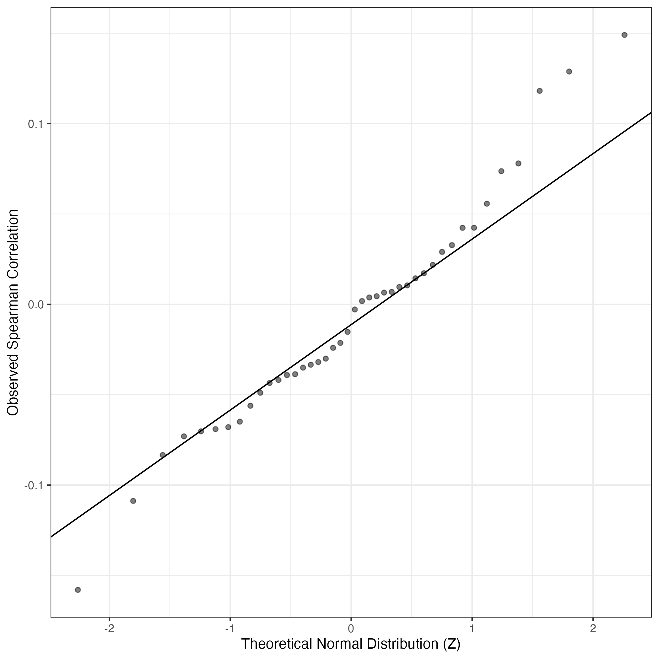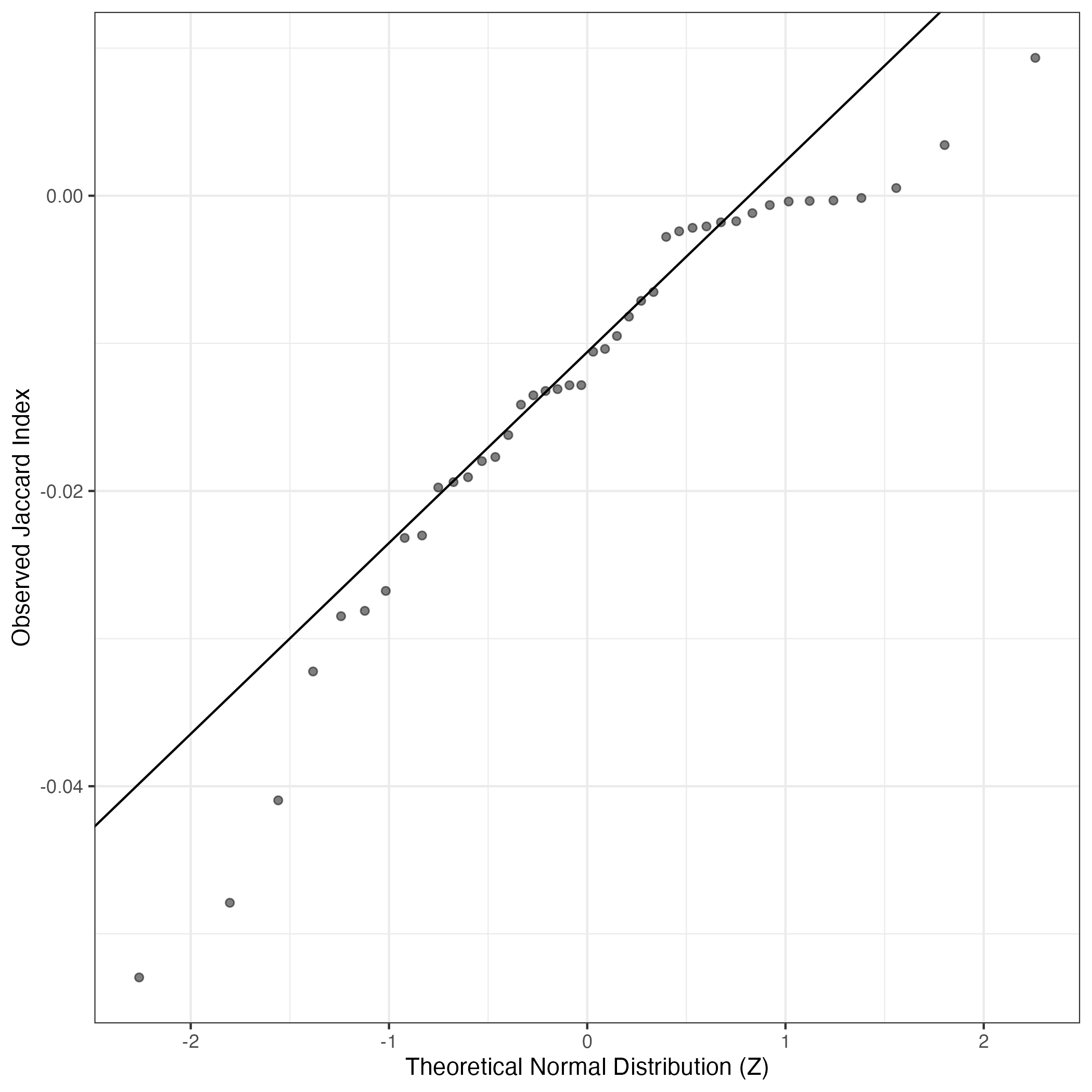 A similar QQ-plot as above, but only for instances where the H value is e.g. > 25, i.e. we are confident that the expression program is active above noise. Agreemenet between these binary vectors is tested using the Jaccard Index, with the P-values calculated by an exact test: