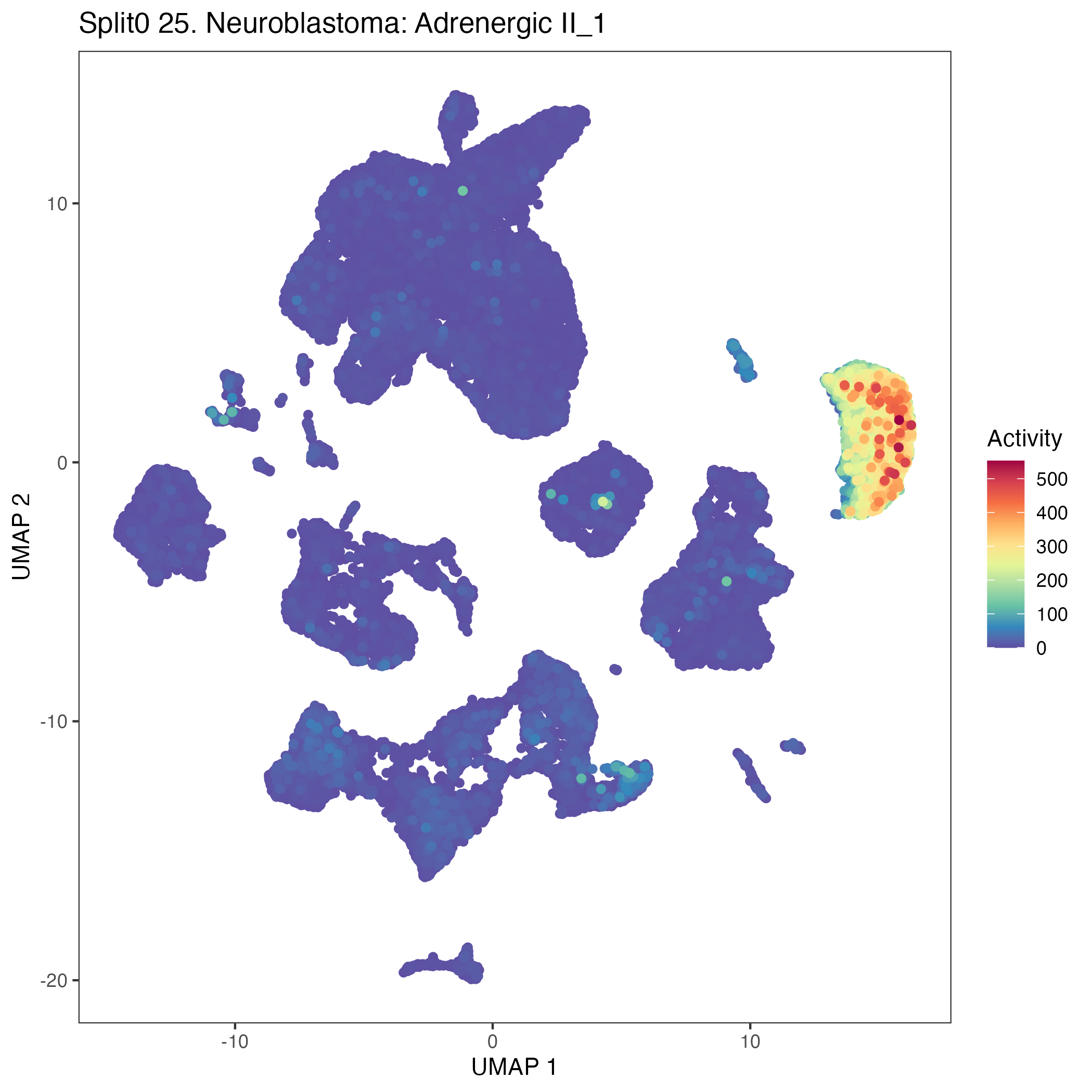 Adrenergic immature (Olsen) Stated on pages 6 and 7 of the main text of Olsen et al. https://www.biorxiv.org/content/10.1101/2020.05.04.077057v1 - it is argued that upon reanalysis of the adrenergic neuroblastoma cells, there is further heterogeneity, grouped into proliferating, mature and immature cell populations. These is a marker listed for the immature adrenergic cells. SOX11 is referenced as important in early phases of pro-adrenergic differentiation (cites PMID 20147379) whereas SOX4 appears later. SOX11 is also associated with poor outcome in neuroblatoma bulk RNA-seq data (Olsen analysis).: Wilcoxon ranksum test P-value for gene set overrepresentation: 5.58e-02 Mean rank of genes in gene set: 1159 Rank on gene expression program of genes in gene set: